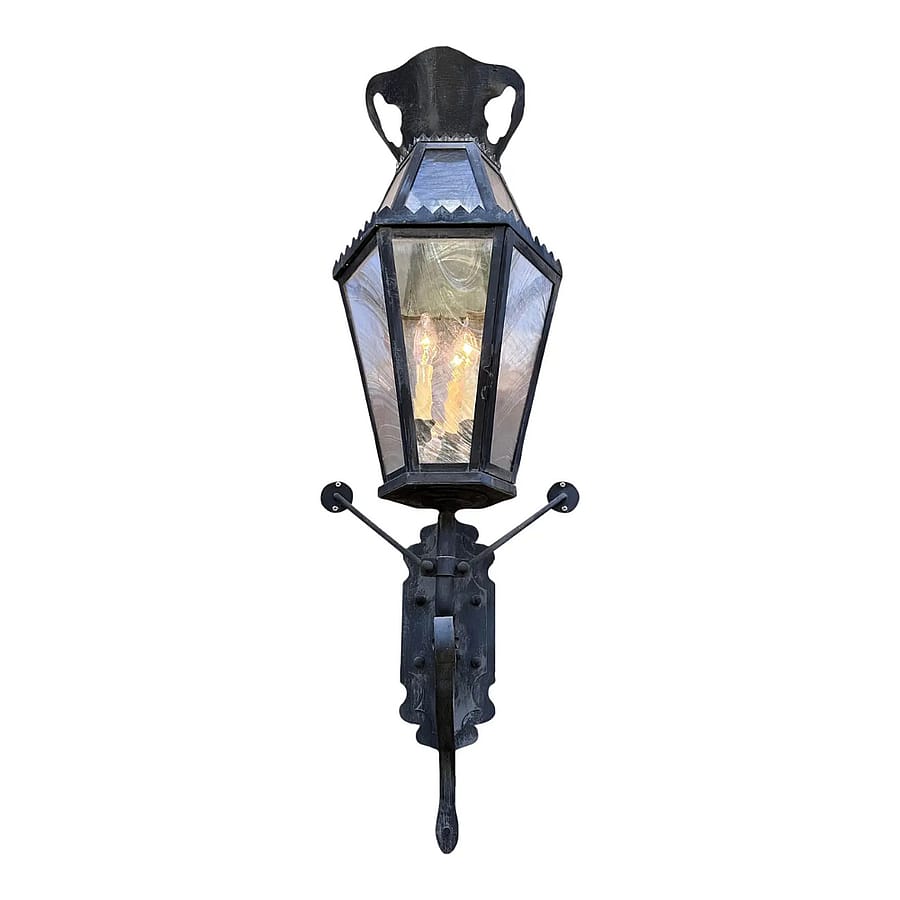 Three upward facing candelabra lights and twelve glass panes on this hexagonal shaped lantern harken back to streetscapes of old Barcelona. UL Listed LED compatible Manufactured by Lantern Masters Dimensions 16ʺW × 15ʺD × 45ʺL