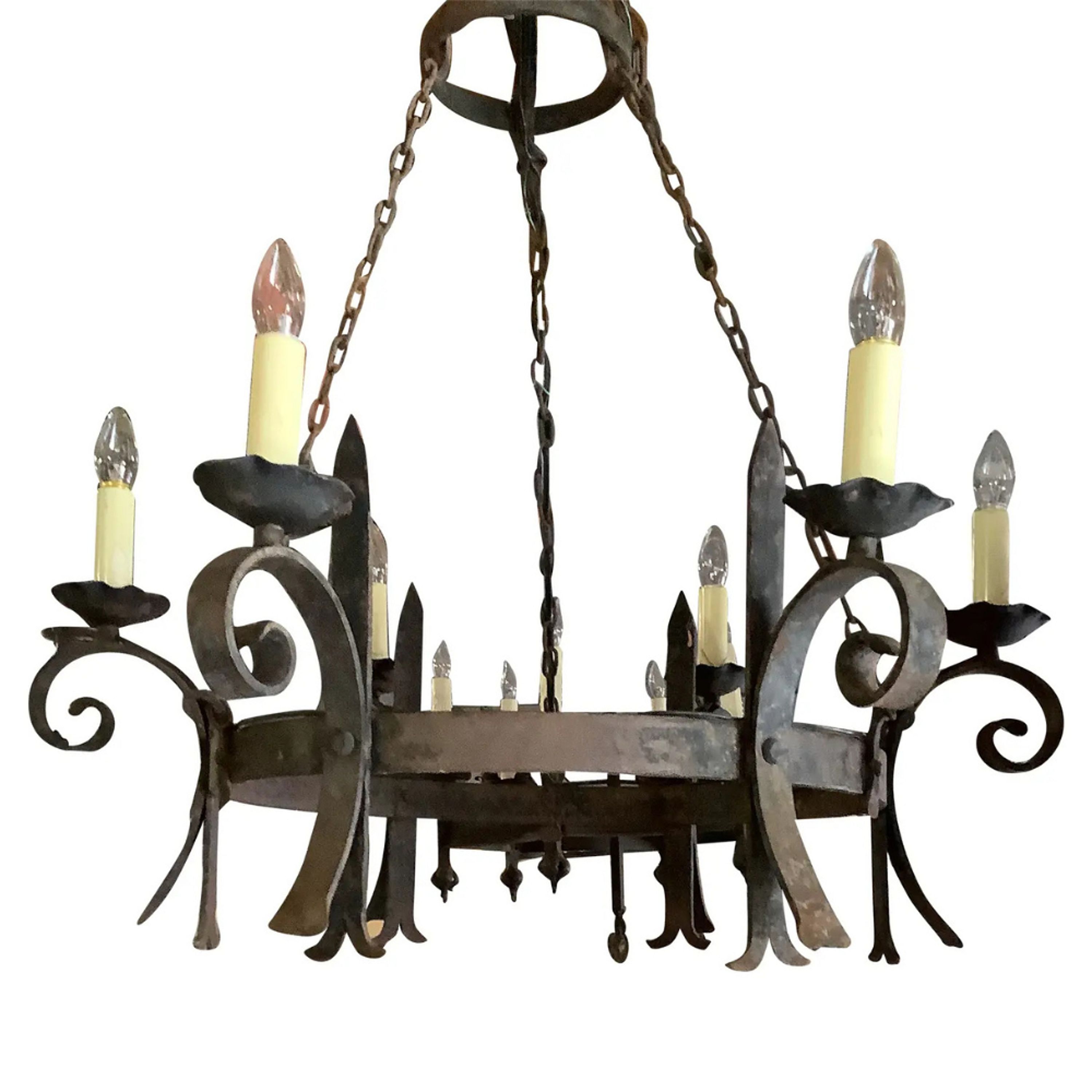 A large sized French gothic style chandelier, circular shaped wrought iron with 6 bulbs hanging from its original chain and mount. This has been rewired to meet US electrical standards.