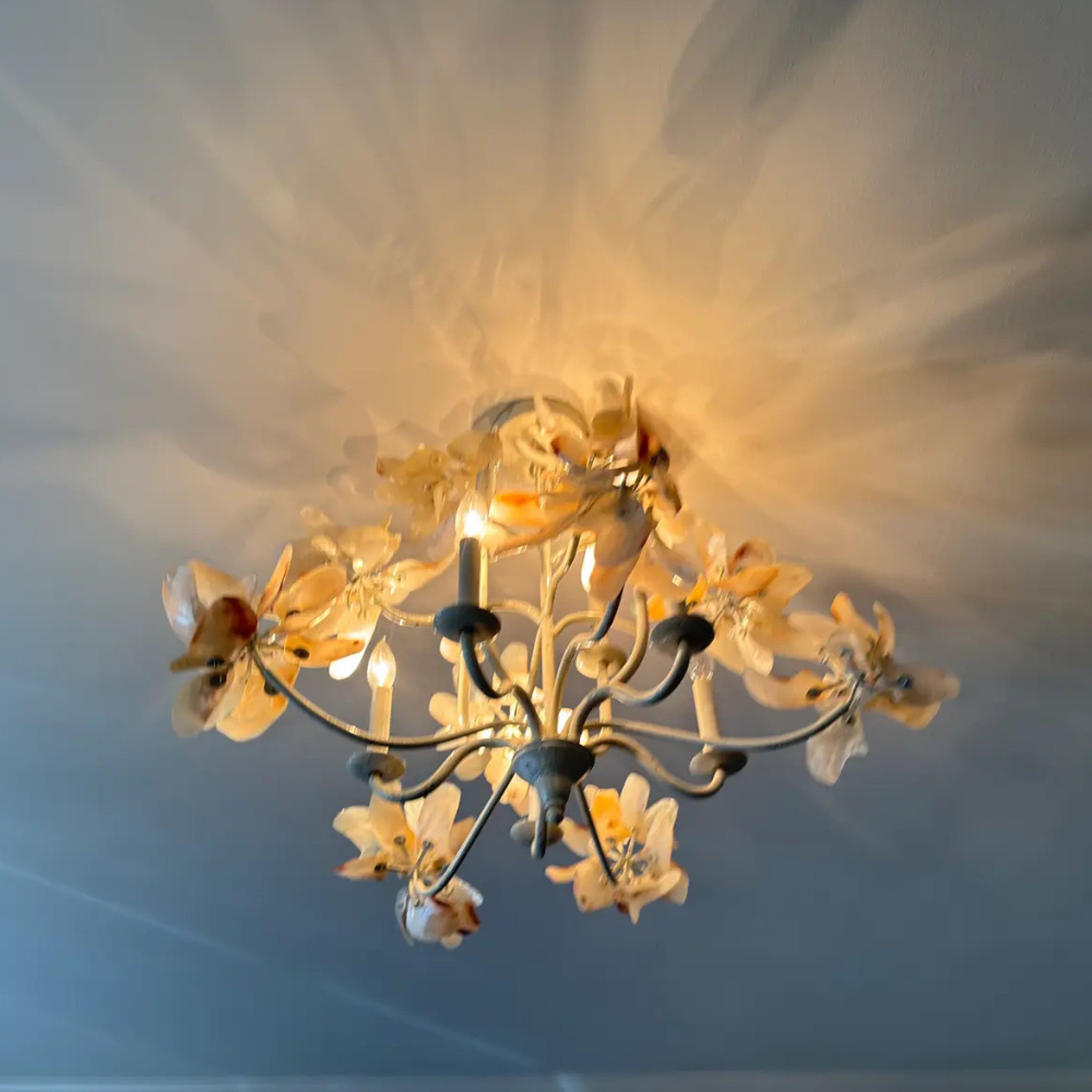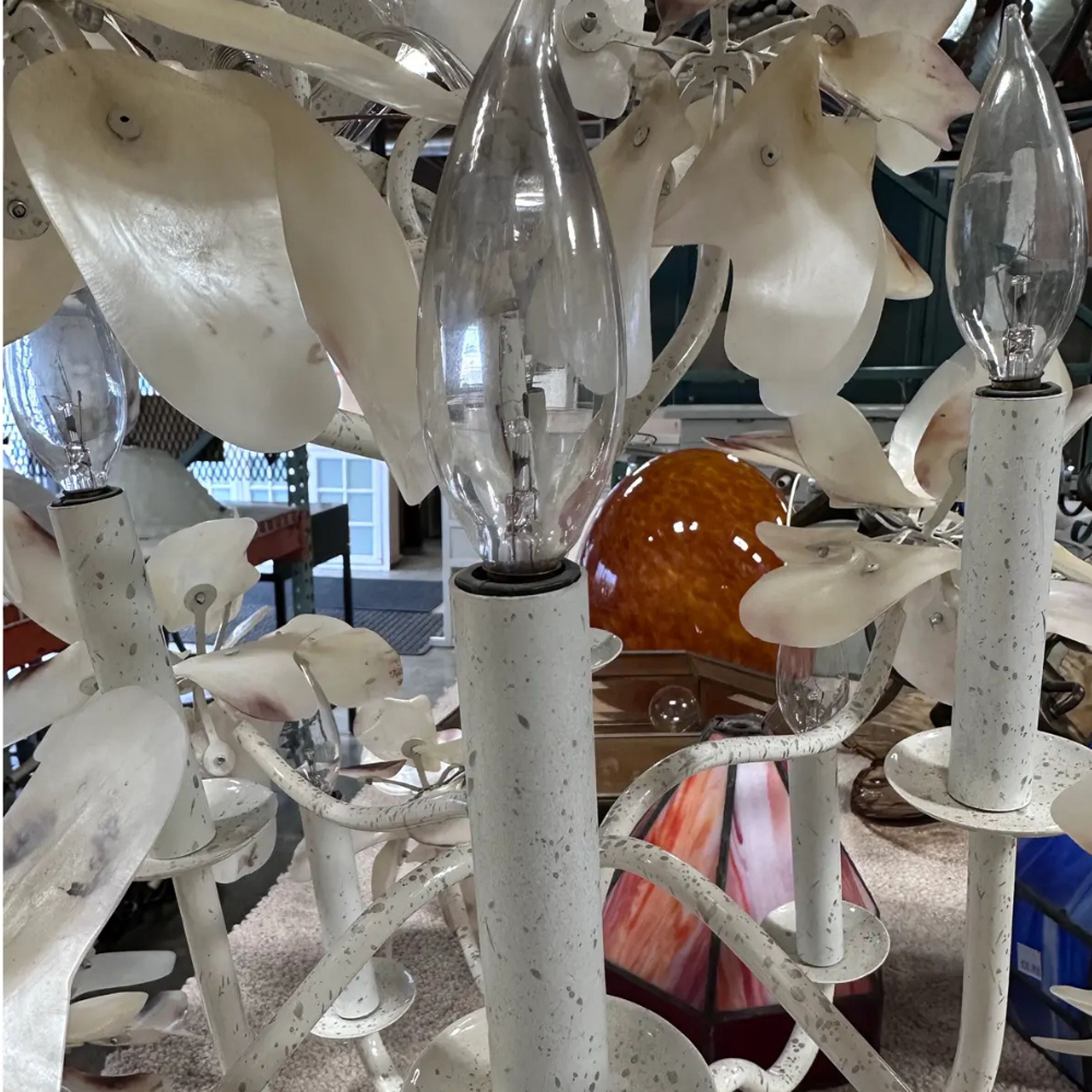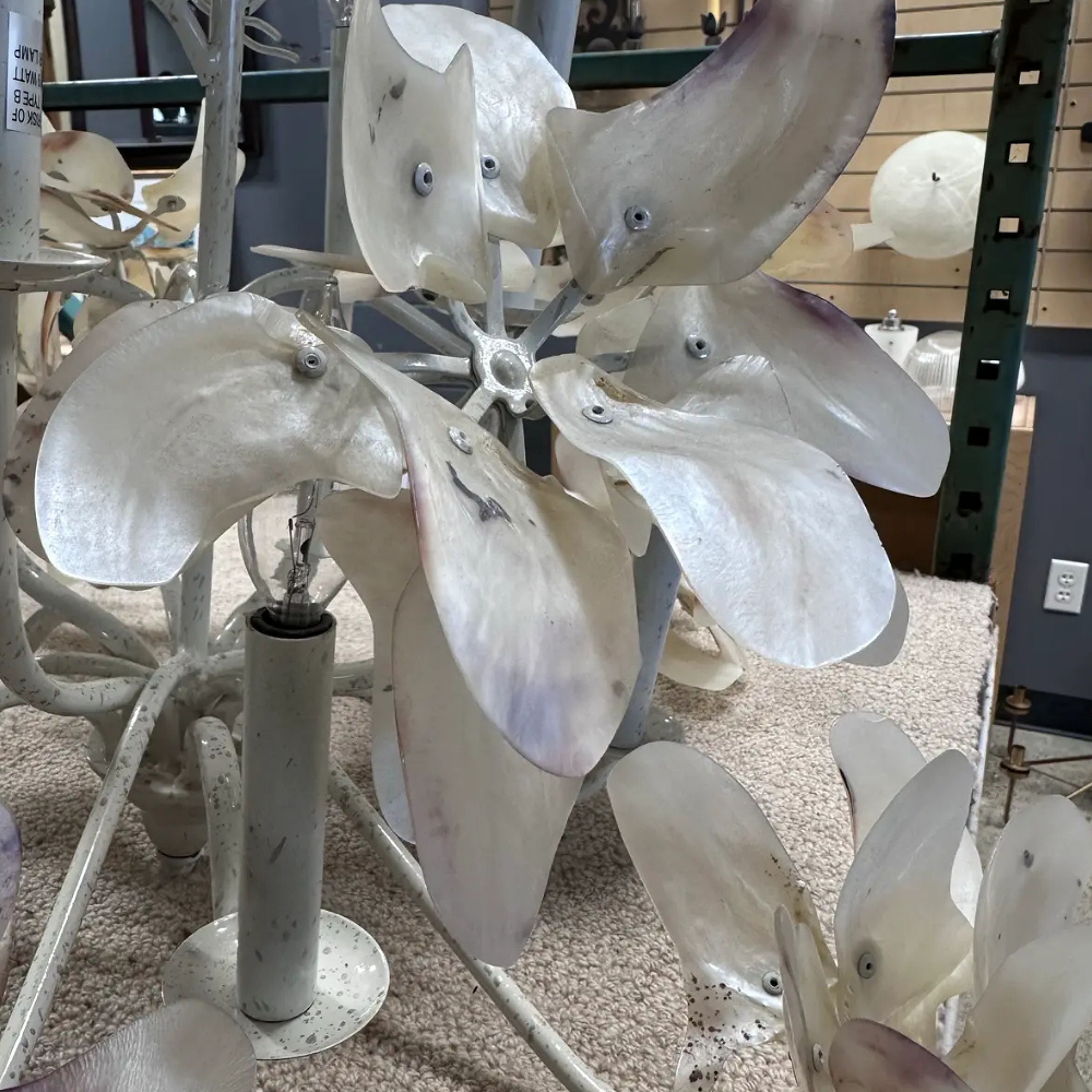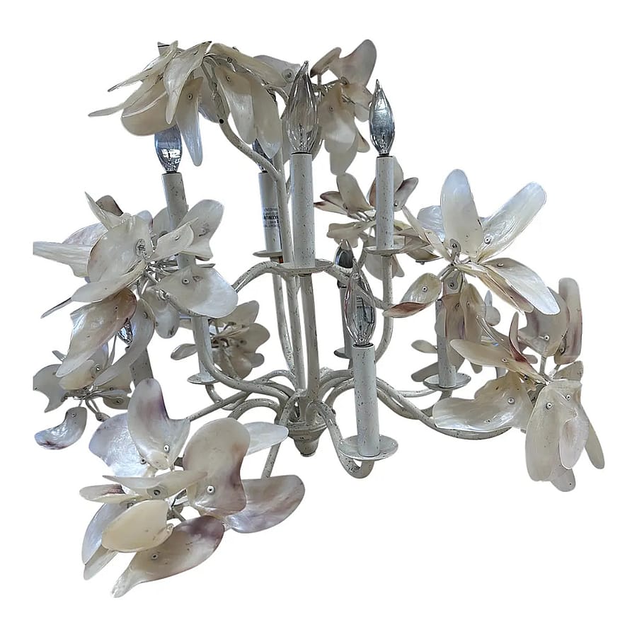 Mid century modern pearled white magnolia chandelier with capiz shell. 9 light bulbs, hardwired. 3’ long chain, cord 5 ‘ long. Mounting plate 3” , 12lb Dimensions 30ʺW × 30ʺD × 26ʺL