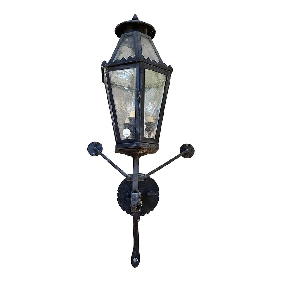 Three upward facing candelabra lights and twelve glass panes on this hexagonal shaped lantern harken back to streetscapes of old Barcelona. UL Listed LED compatible Manufactured by Lantern Masters Dimensions 15.5ʺW × 10.5ʺD × 36ʺL