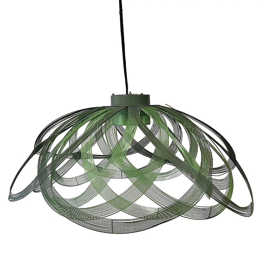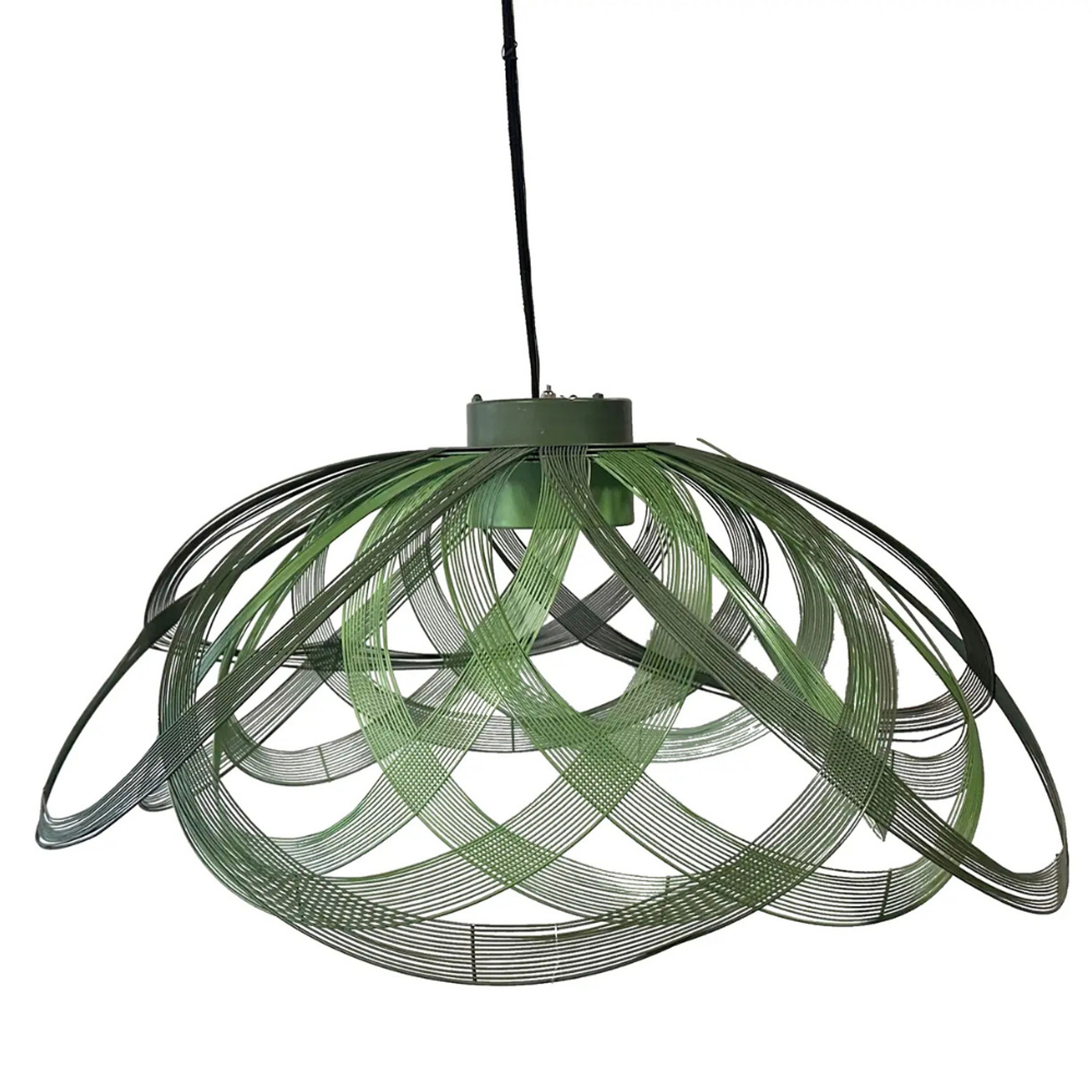 This artisan-made A Cote Pendant by Schema has a fluid, decorative design. It is made of hand-woven galvanized iron wires that swoop down in a series of loops that form a semi-transparent shade around a recessed LED light source. When lit, this design creates fun light play through the wires for a subtle shimmering ambiance.
