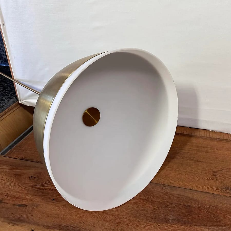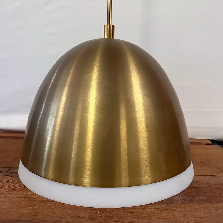 A hand-spun brass parabolic shade perfectly slips over a cast-glass dome. A line of glass is revealed from the profile; inciting a look underneath into a seemingly endless void of glowing glass. Hand made in the US.