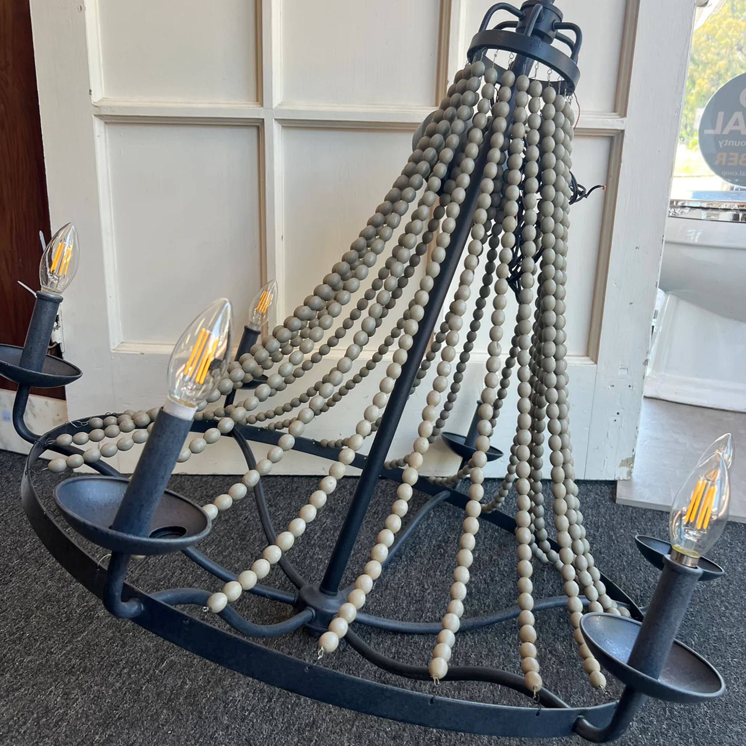 This French Country Driftwood Chandelier, six-light, features one top layer of driftwood bead strings draped from the top of the frame to the weathered zinc finish base of the chandelier highlighting its golden glow of candle lights. This hanging light makes a grand display in the dining or living room.