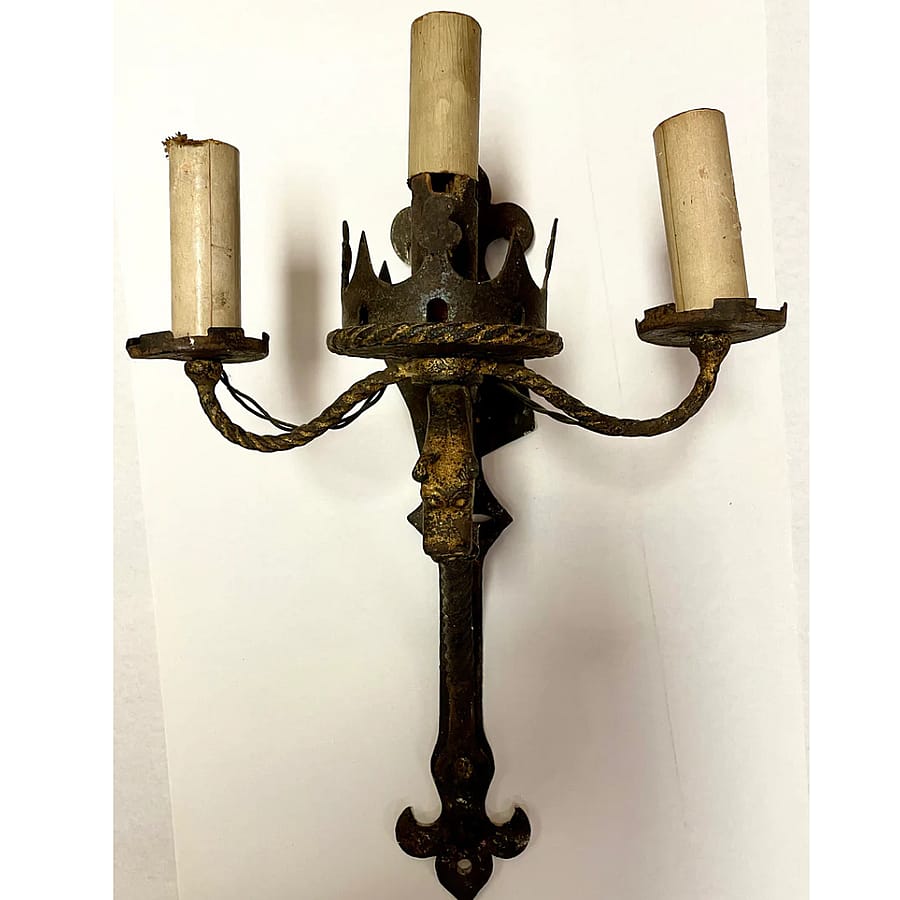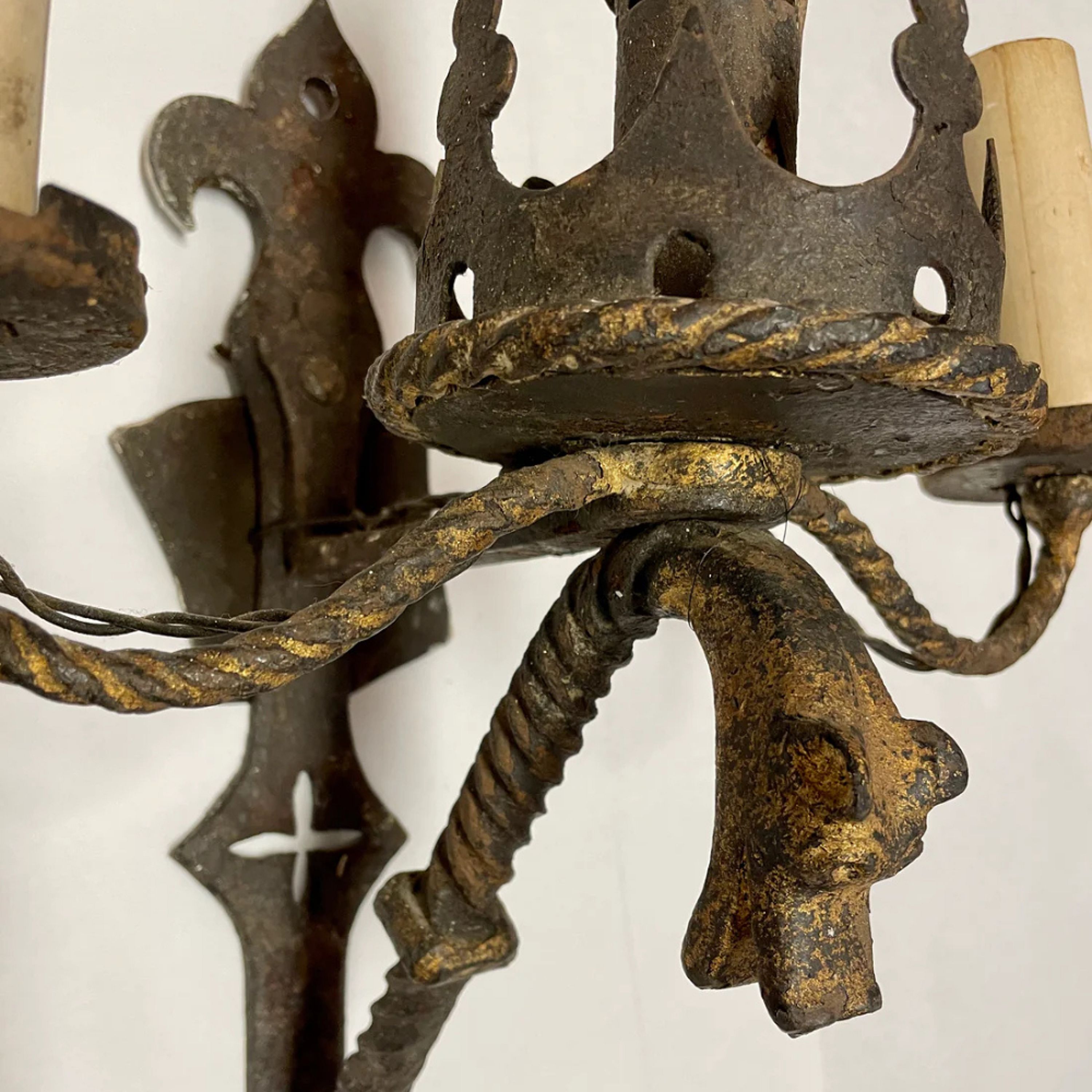 These unique sconces came from a house that was built in 1927 in Hillsborough, CA. They are hand forged and feature a dragon head under a crown. They will need to be rewired due to their age.