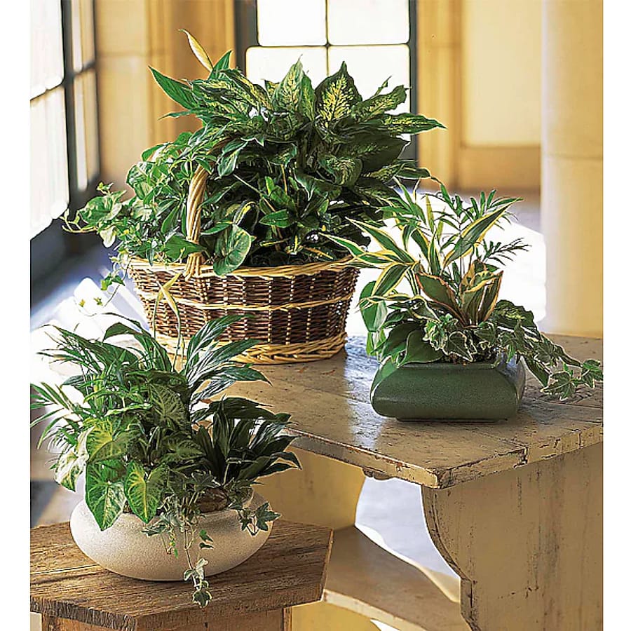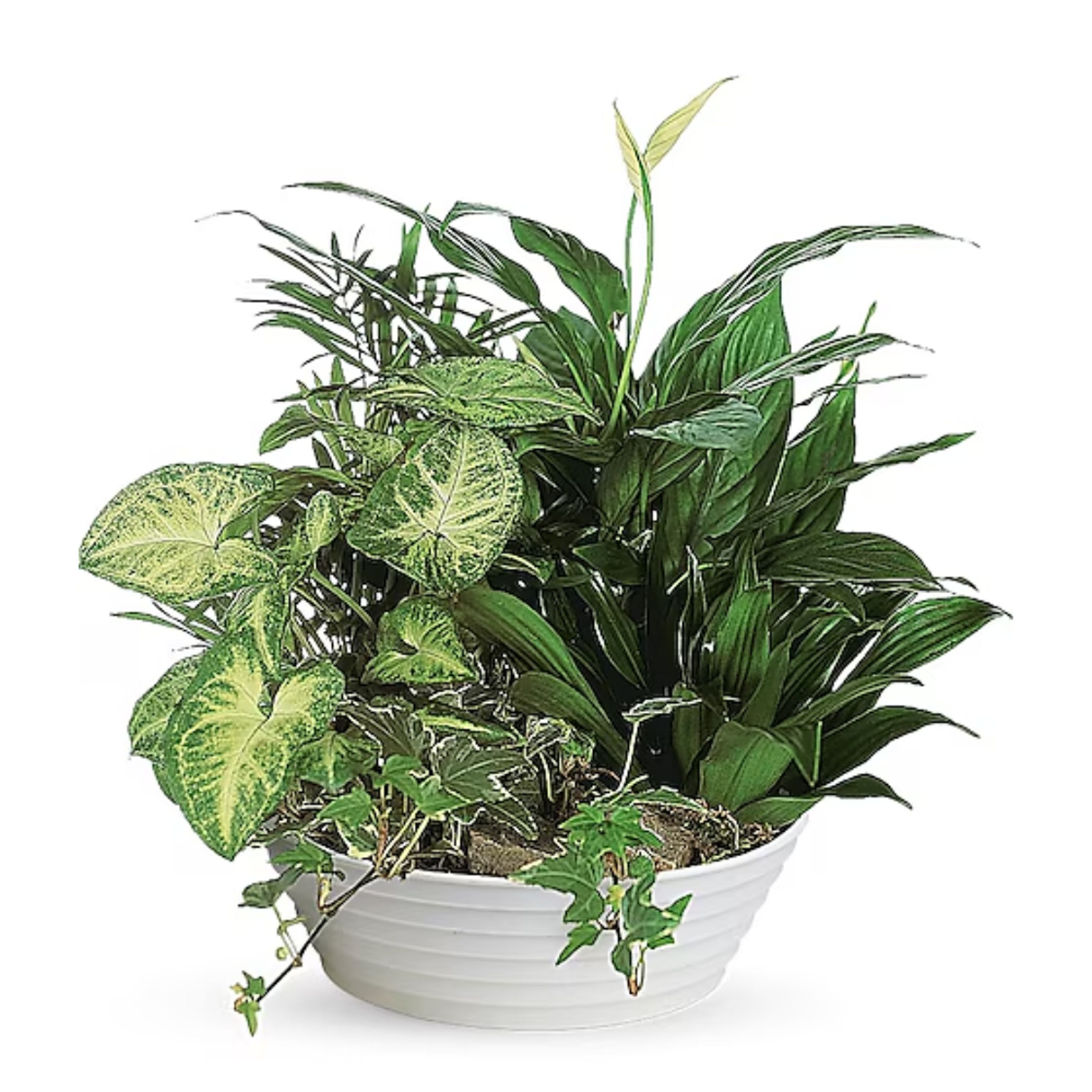This low bowl filled with living plants will also carry comfort and compassion for many months to come. A planter filled with dracaena, ivy, palm, spathiphyllum and syngonium plants.