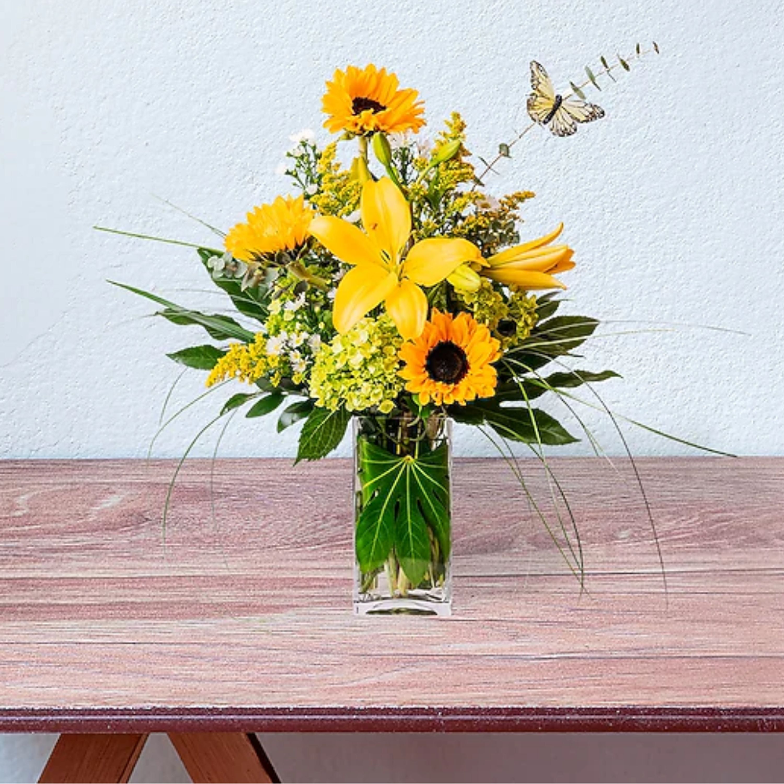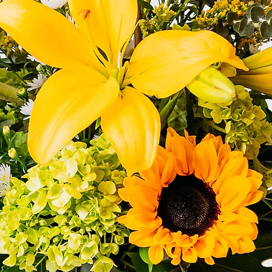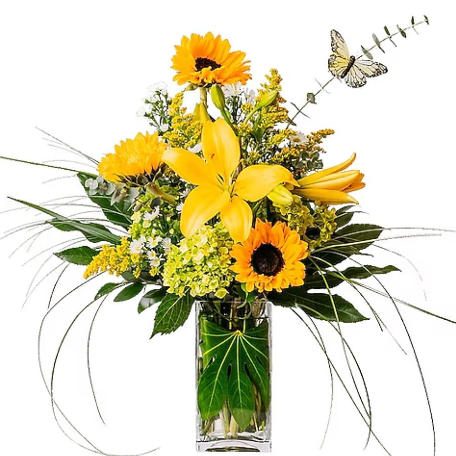 Lift their spirits high. Taking Flight's sunny yellows will have them soaring with happiness. Yellow lilies, sunflowers and other flowers are playfully arranged in this sunny arrangement. *Approximately 30"W X 24"H