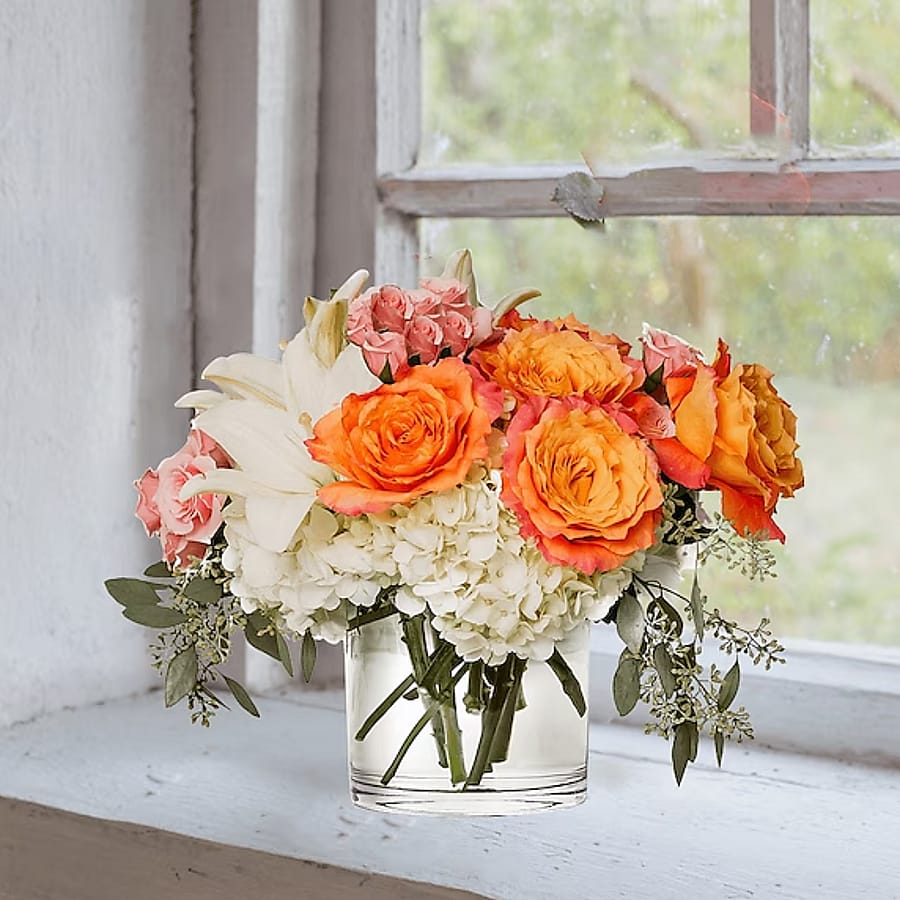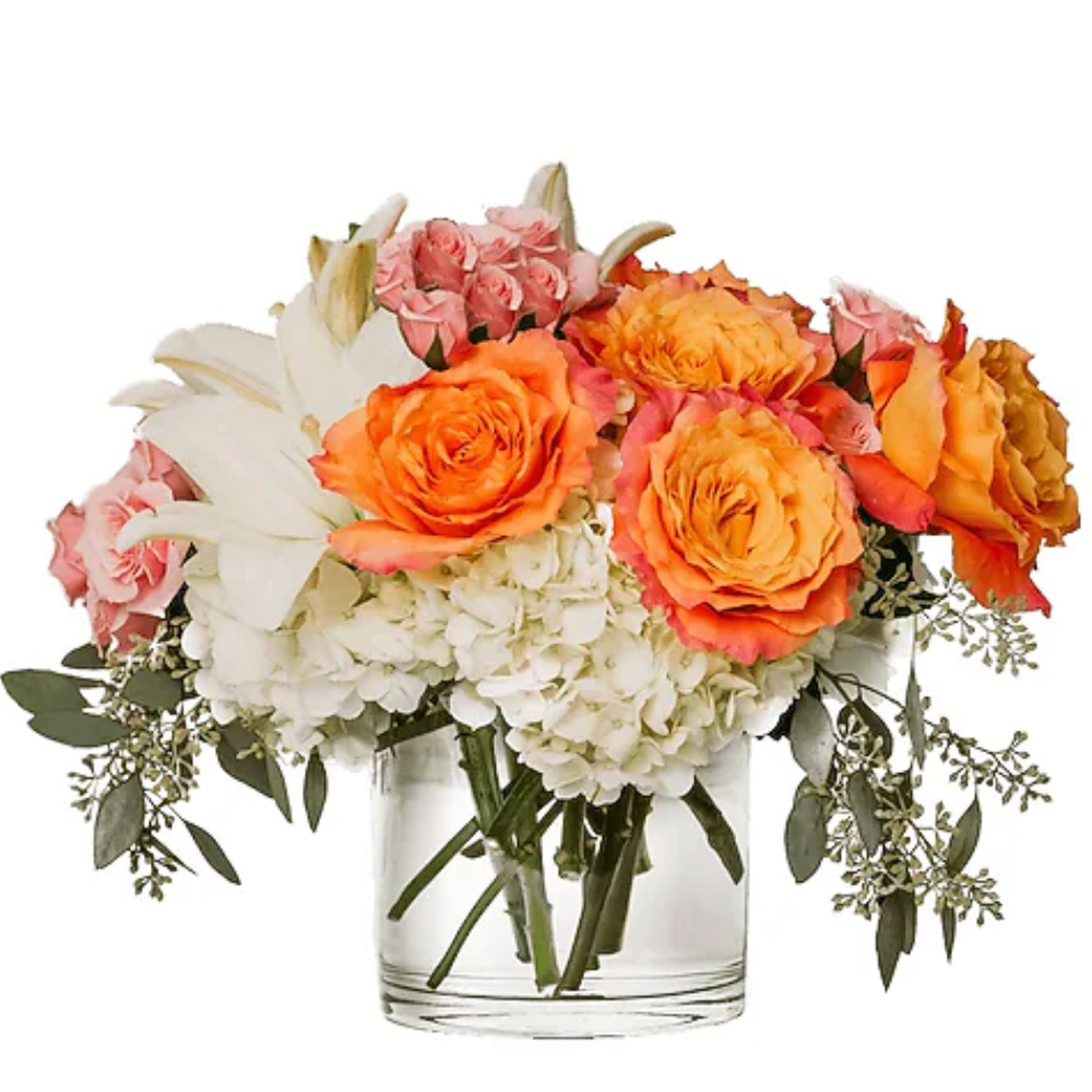 Spontaneous and unconventional. Free Spirit balances strength and gentleness. Hydrangeas are paired with Free Spirit Roses in our clear cylinder vase for this surprisingly stunning mix. *Approximately 18"W X 13"H