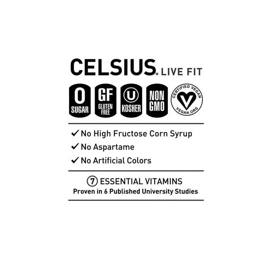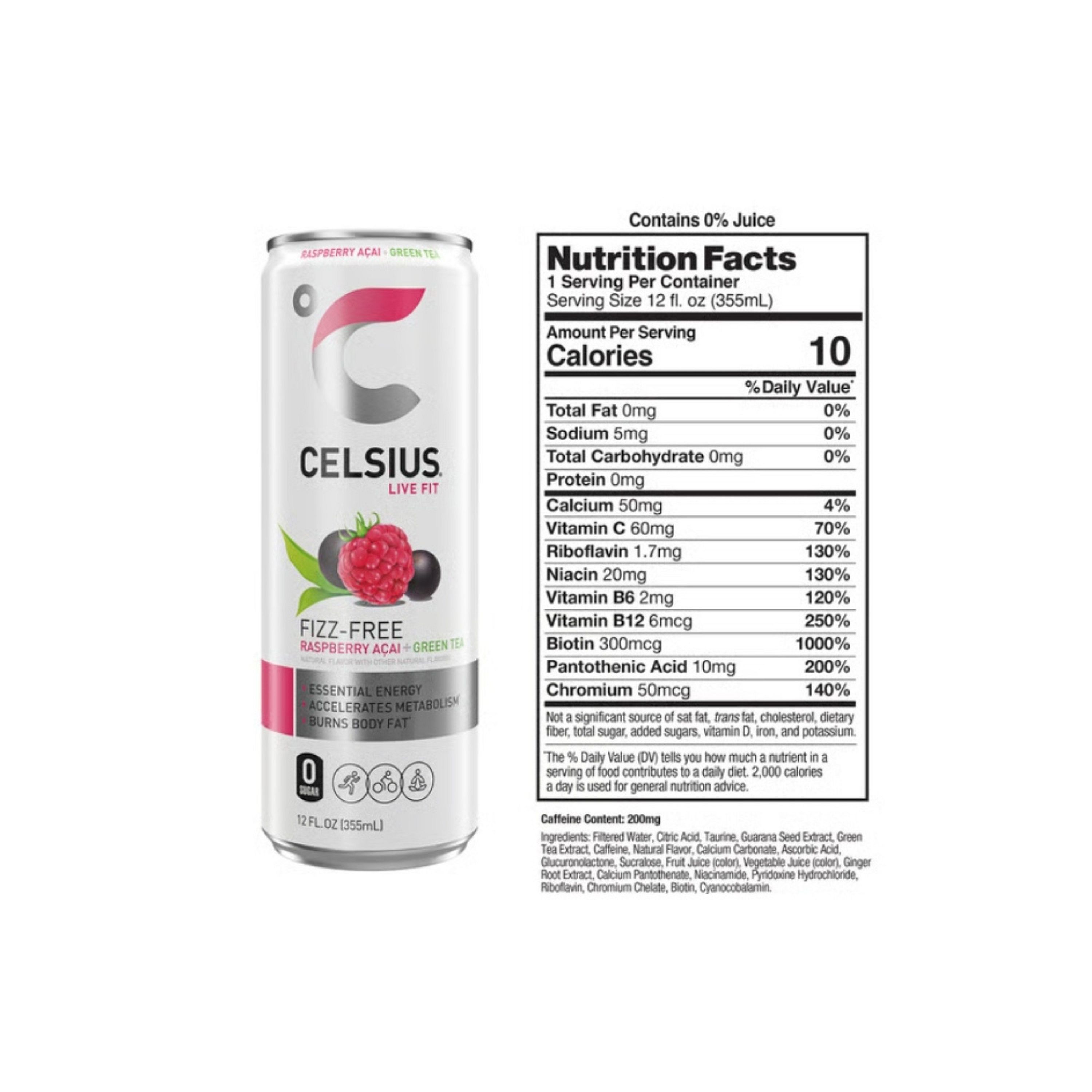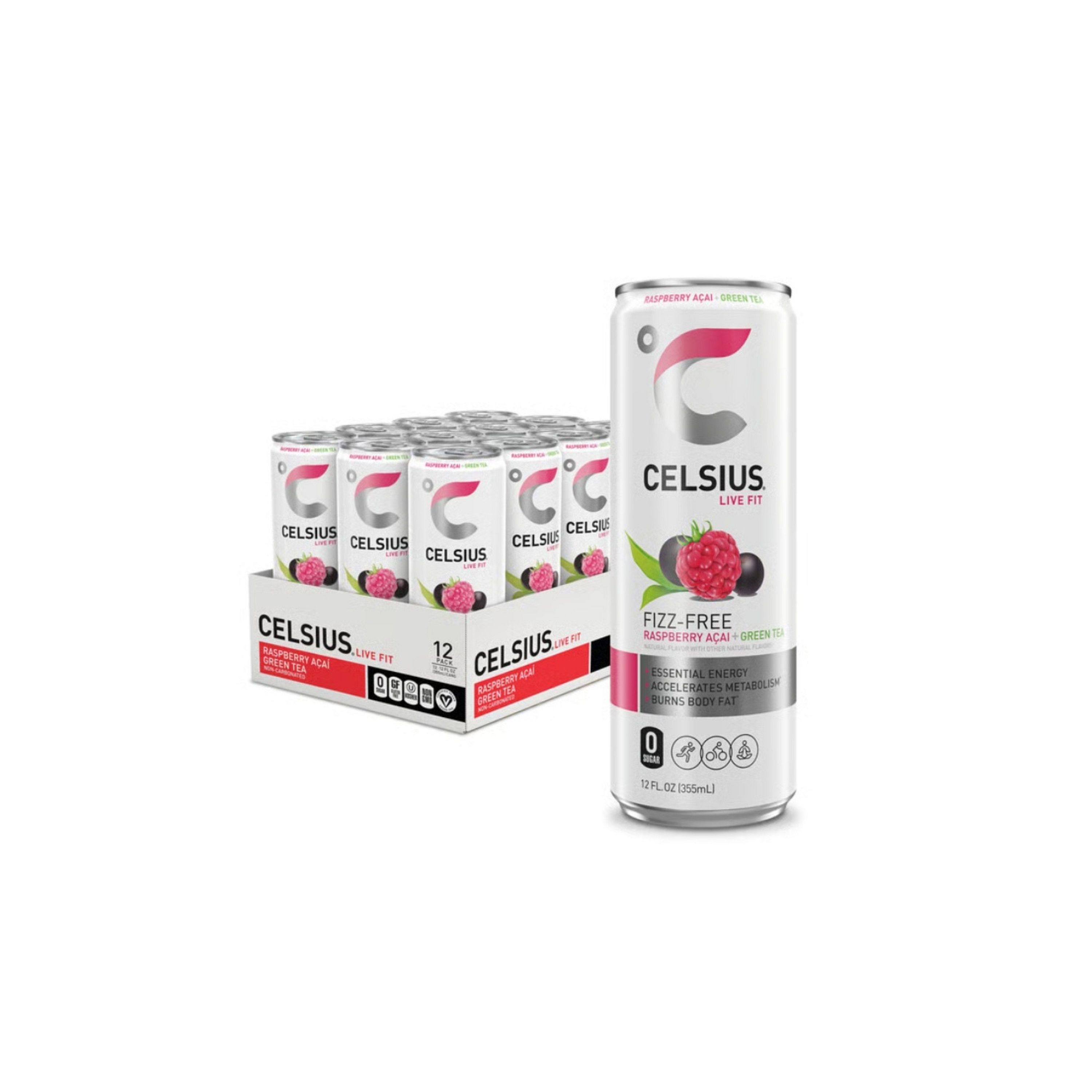 CELSIUS® is functional, Essential Energy, a better-for-you, premium alternative to traditional energy drinks. As a global, lifestyle fitness drink, CELSIUS® was created to help people LIVE FIT, exceed their goals and elevate their everyday lives. Made with proven, premium ingredients, 7 Essential Vitamins and zero sugar, no artificial colors, no aspartame, no high fructose corn syrup and non-GMO. CELSIUS® is vegan, gluten-free and Kosher. Our proprietary MetaPlus blend contains green tea extract with EGCG. It also includes guarana seed extract, ginger root for flavor and digestion, vitamin C to help support your immune system, vitamin B for energy production, and chromium to help control hunger, making it an ideal pre-workout drink. Enjoy the non-carbonated uplifting combination of sweet raspberries and tart, refreshing acai. Our non-bubbly Raspberry Acai Green Tea CELSIUS® Flavor will keep you moving! Made with clinically proven ingredients, this carbonated flavor of CELSIUS® has the perfect balance of flavor and energy that serves as an awesome pick-me-up for active lifestyles.