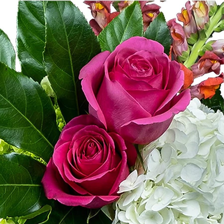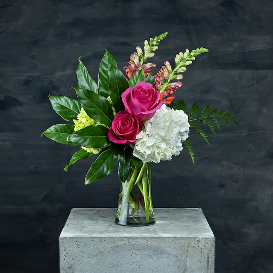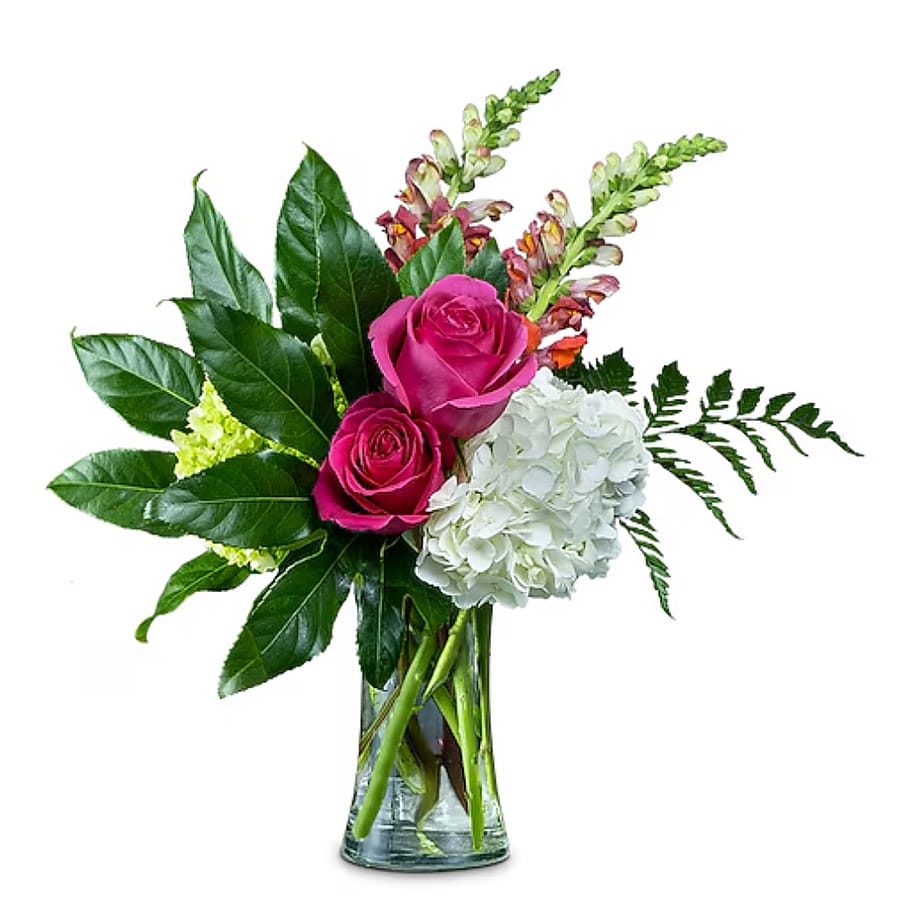 Snappy Birthday to You, Snappy Birthday to you...may you be blessed with many more. Hydrangea, roses and snapdragons in a tall flared clear glass vase appropriate for the edge of a desk or end table.