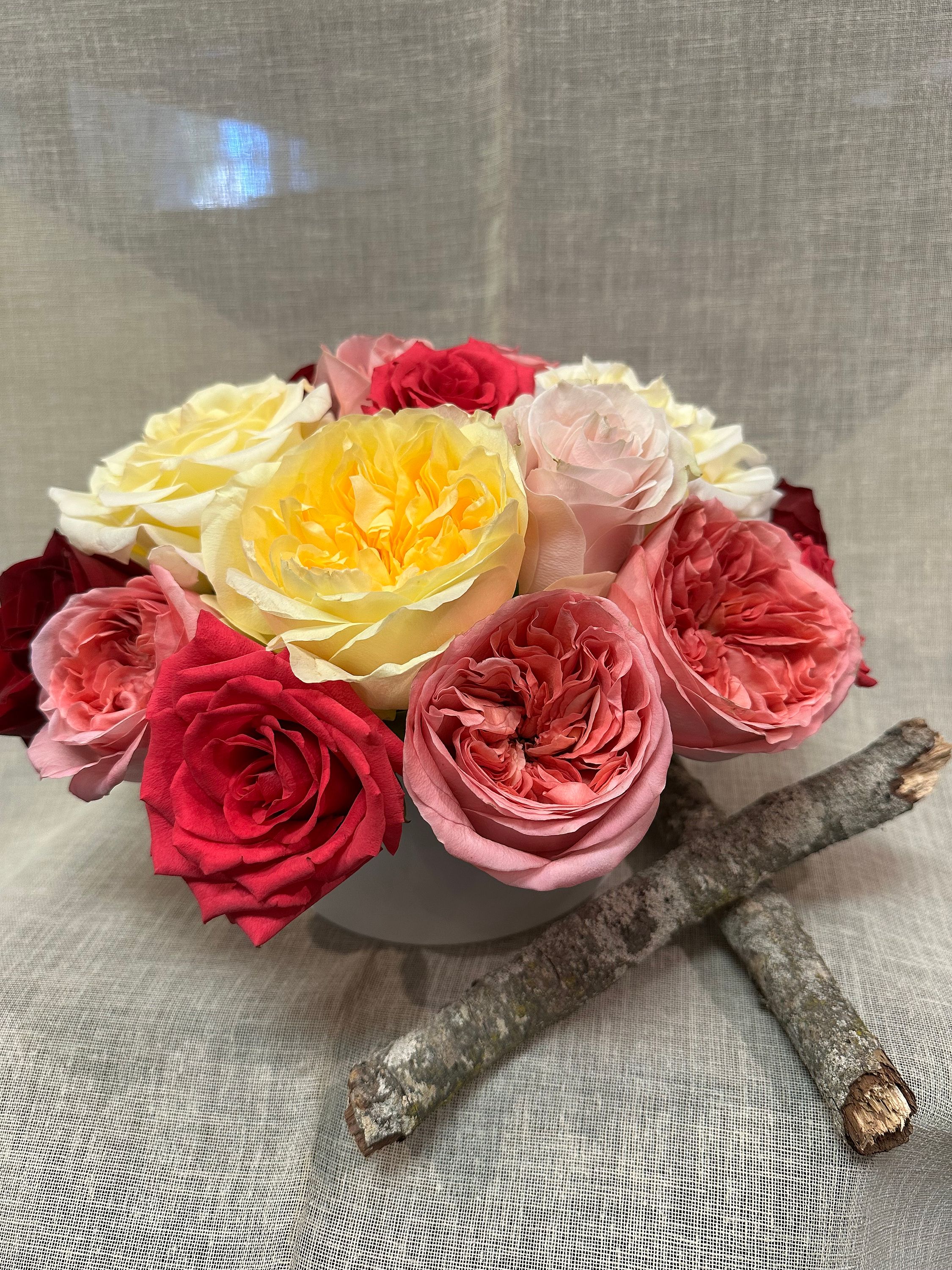 Elegant and timeless, Different Shades of Garden Roses showcases a stunning mix of premium garden and classic roses in a range of romantic hues. From soft blush and creamy ivory to deep pink and vibrant red. Arranged in a sleek white ceramic vase, this design highlights the natural beauty and texture of each bloom. Perfect for anniversaries, birthdays, or simply to add a touch of luxury to your space, this arrangement captures the essence of refined beauty and heartfelt sentiment