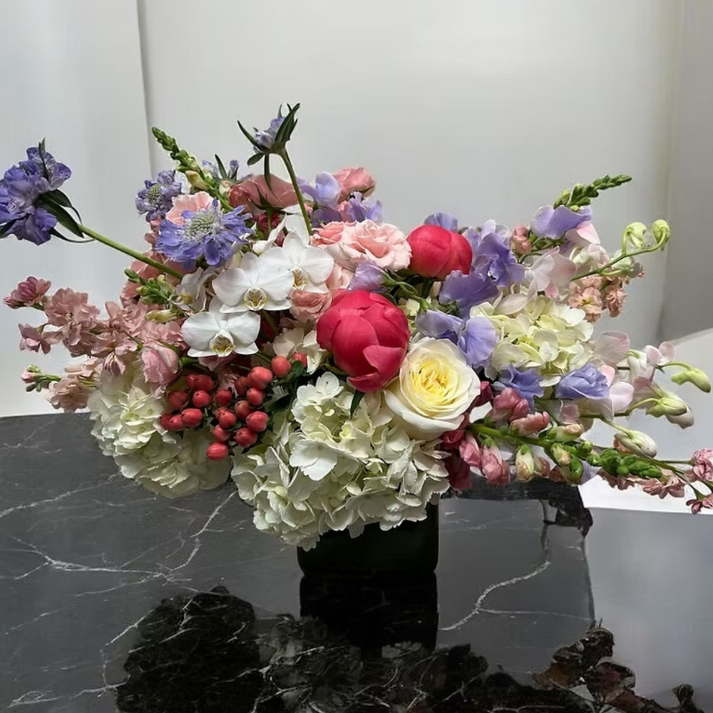 A beautiful arrangement bursting with color and texture. Featuring pink roses, lavender sweet peas, white hydrangeas, with cymbidium this design blends elegance with a touch of whimsy. Perfect for a statement centerpiece or special occasion, it brings a romantic, freshly gathered feel to any setting.