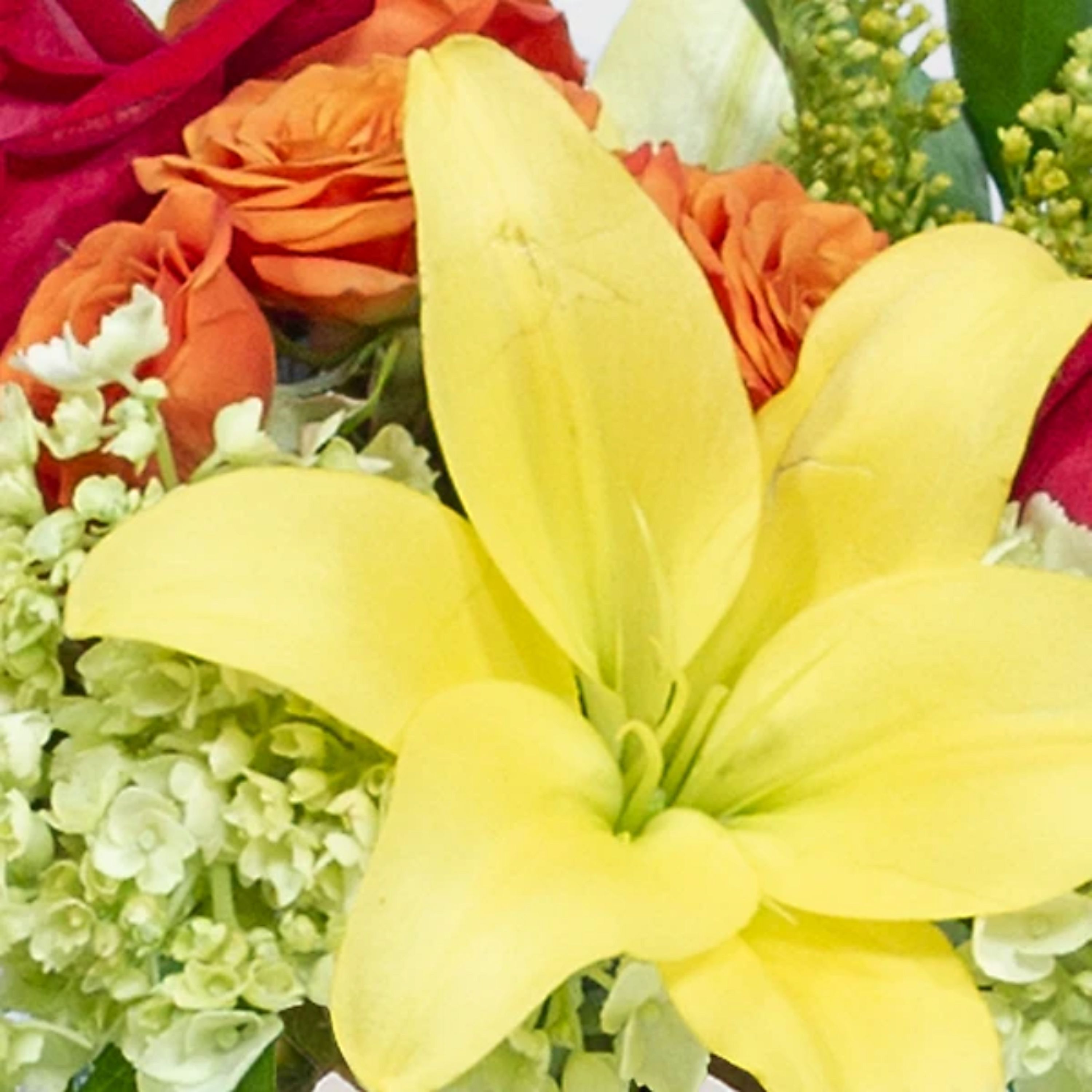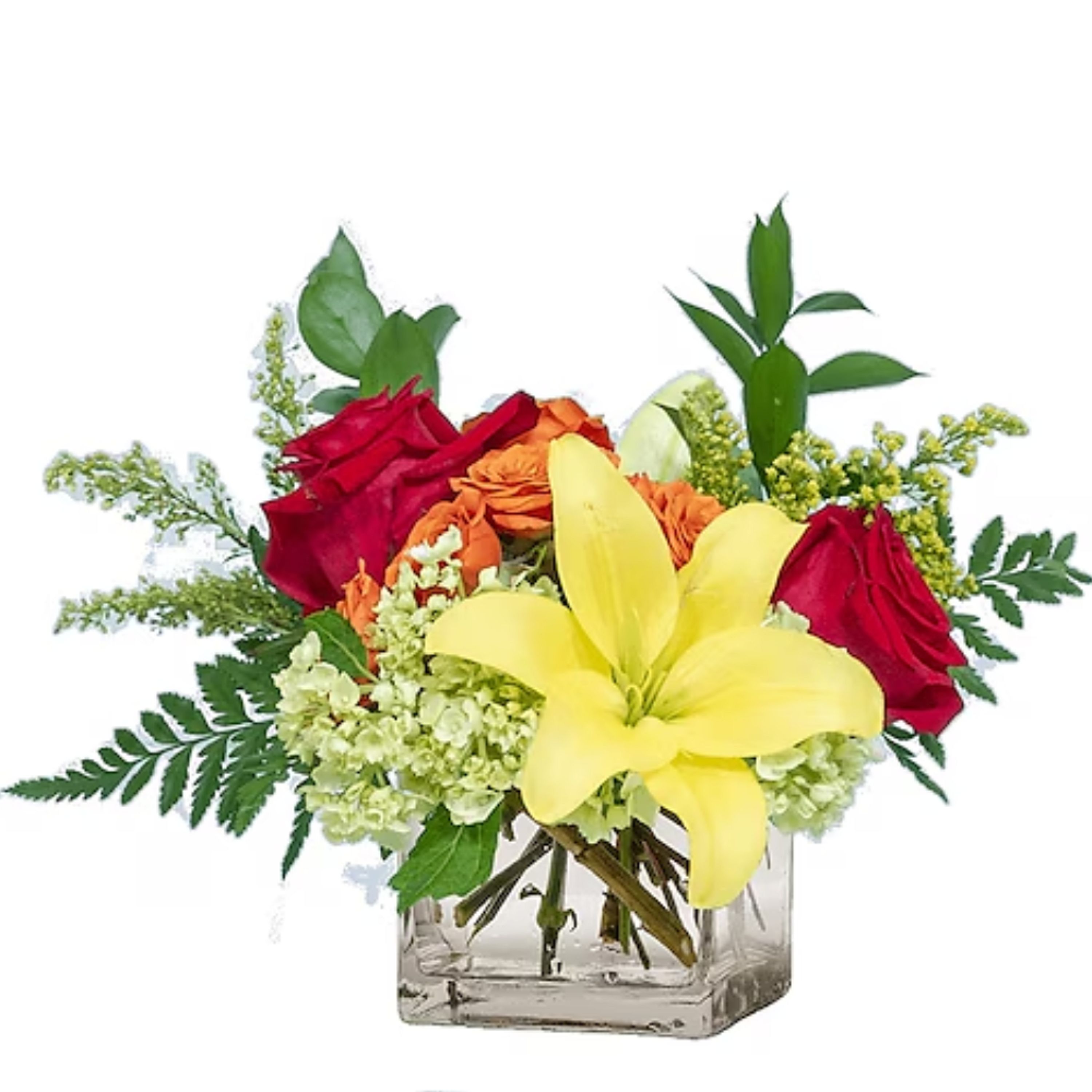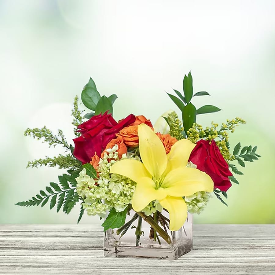 Honey, you rule! Queen Bee says you are here to fix the crowns of others. A clear cube features a Yellow Asiatic lily with support from roses and a green mini hydrangea. *Approximately 9"W X 9"H