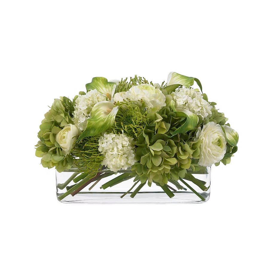 Soft, serene, and beautifully textured, Chrysanthemum Dream is a lush blend of green and white blooms designed to evoke calm and sophistication. This elegant arrangement features green chrysanthemums, hydrangea, bicolor calla lilies, ranunculus, and viburnum, artfully arranged in a modern glass container.