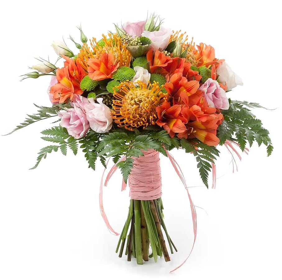 Vibrant and full of life, the Tropical Elegance Bouquet features striking pincushion protea paired with soft pink lisianthus for a stunning contrast of texture and color. Accented with lush greenery and wrapped with a touch of pink ribbon, this hand-tied bouquet exudes warmth and sophistication.