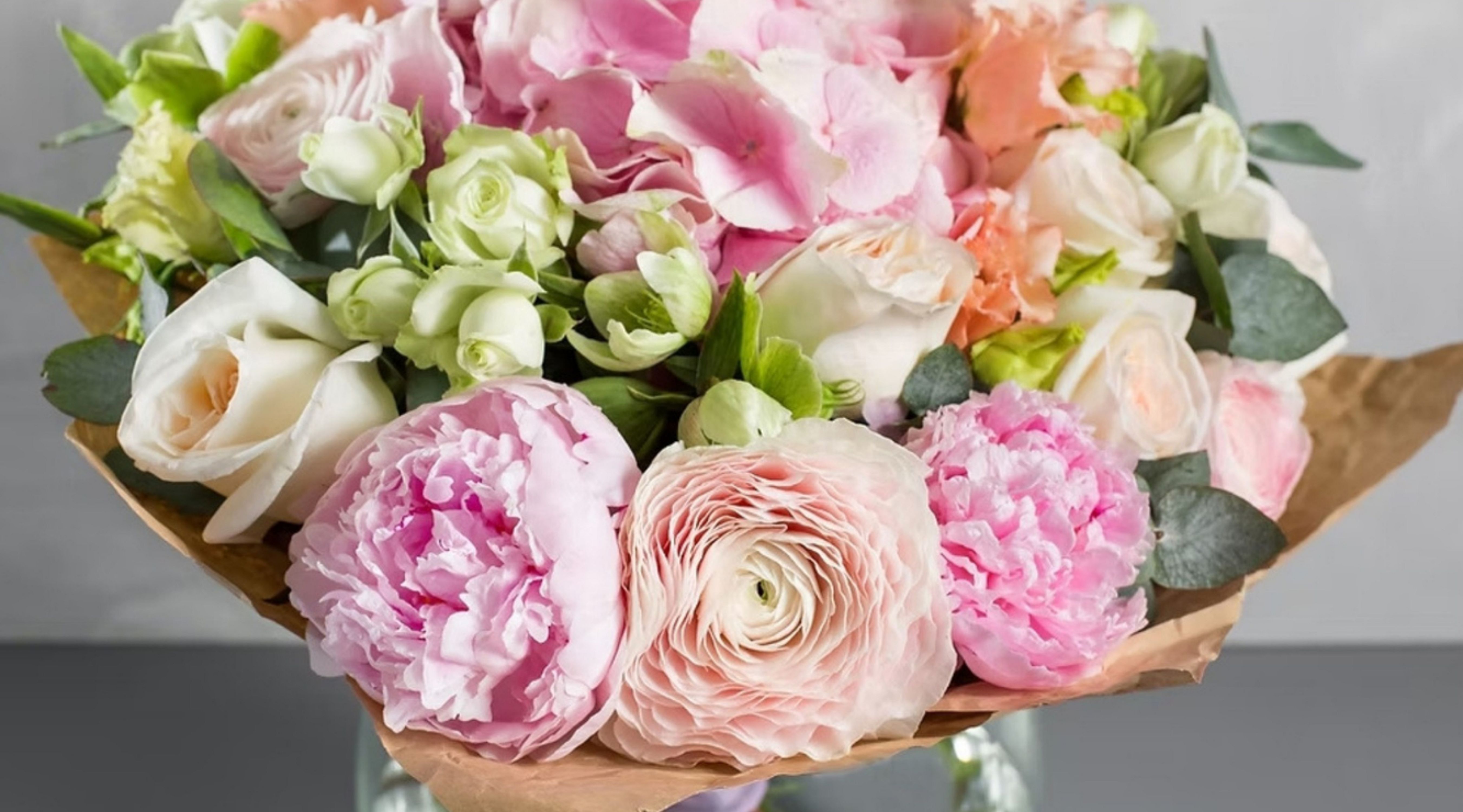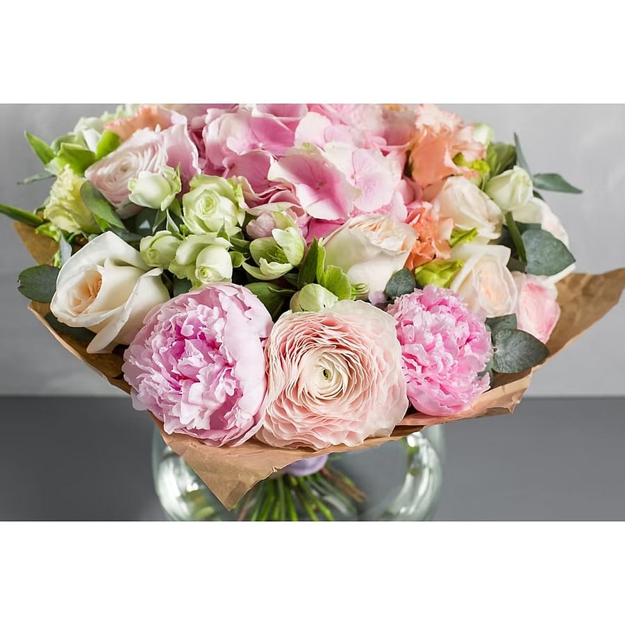 A soft and romantic hand-tied bouquet overflowing with spring charm. Featuring delicate pink peonies, ranunculus, roses, and lisianthus in shades of blush, cream, and peach, this arrangement radiates freshness and elegance. Wrapped in natural paper for a timeless touch, this arrangement is perfect for any occasion.