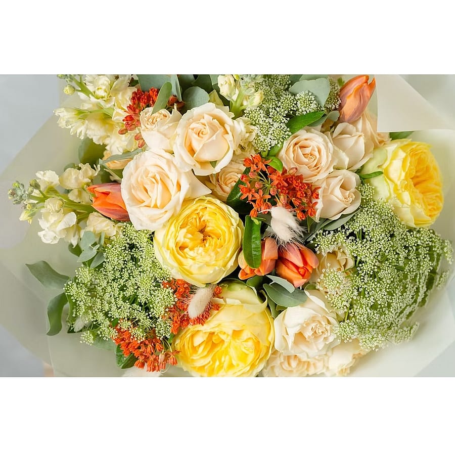 Radiant and full of life, the Fresh and Bright arrangement is designed to bring sunshine to any space. Featuring garden roses, spray roses, Dutch tulips, capsia, eucalyptus, and delicate Queen Anne’s lace, this bouquet blends soft cream and peach tones with cheerful pops of yellow and orange.
