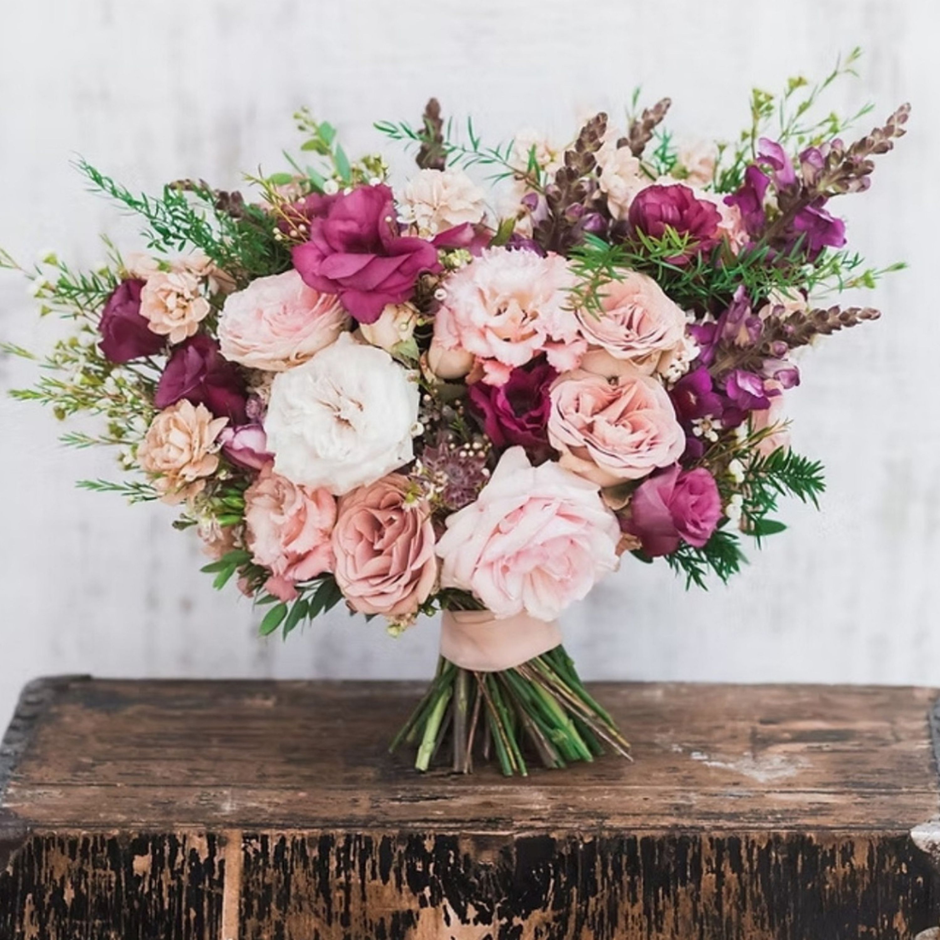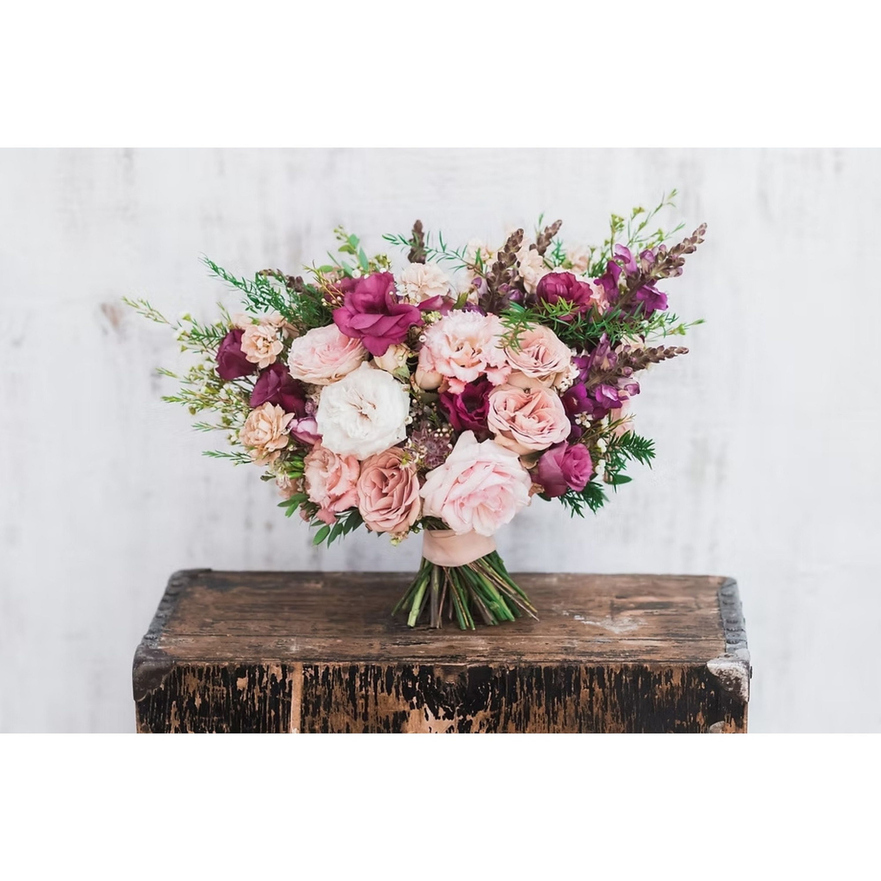 Soft, romantic, and full of texture, the Blushing Bouquet is a timeless arrangement that exudes natural beauty. Featuring lush garden roses, lisianthus, ginestra, snapdragons, astrantia, and mixed botanicals, this hand-tied bouquet blends blush tones with deep berry accents for a perfectly balanced, elegant look. Ideal for anniversaries, birthdays, or special celebrations, this bouquet brings a touch of grace and sophistication to any occasion.