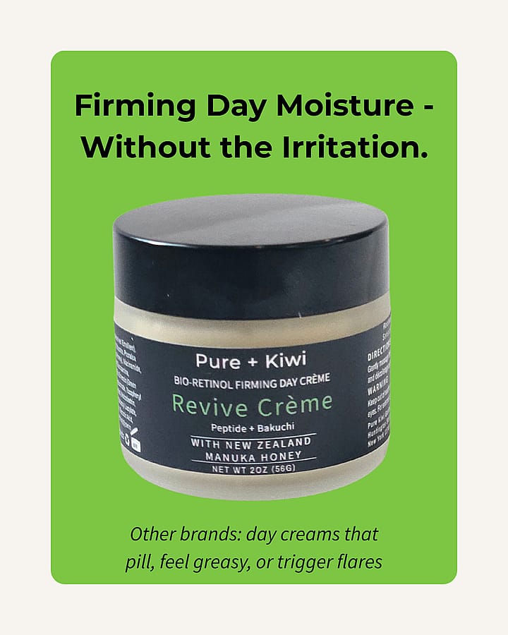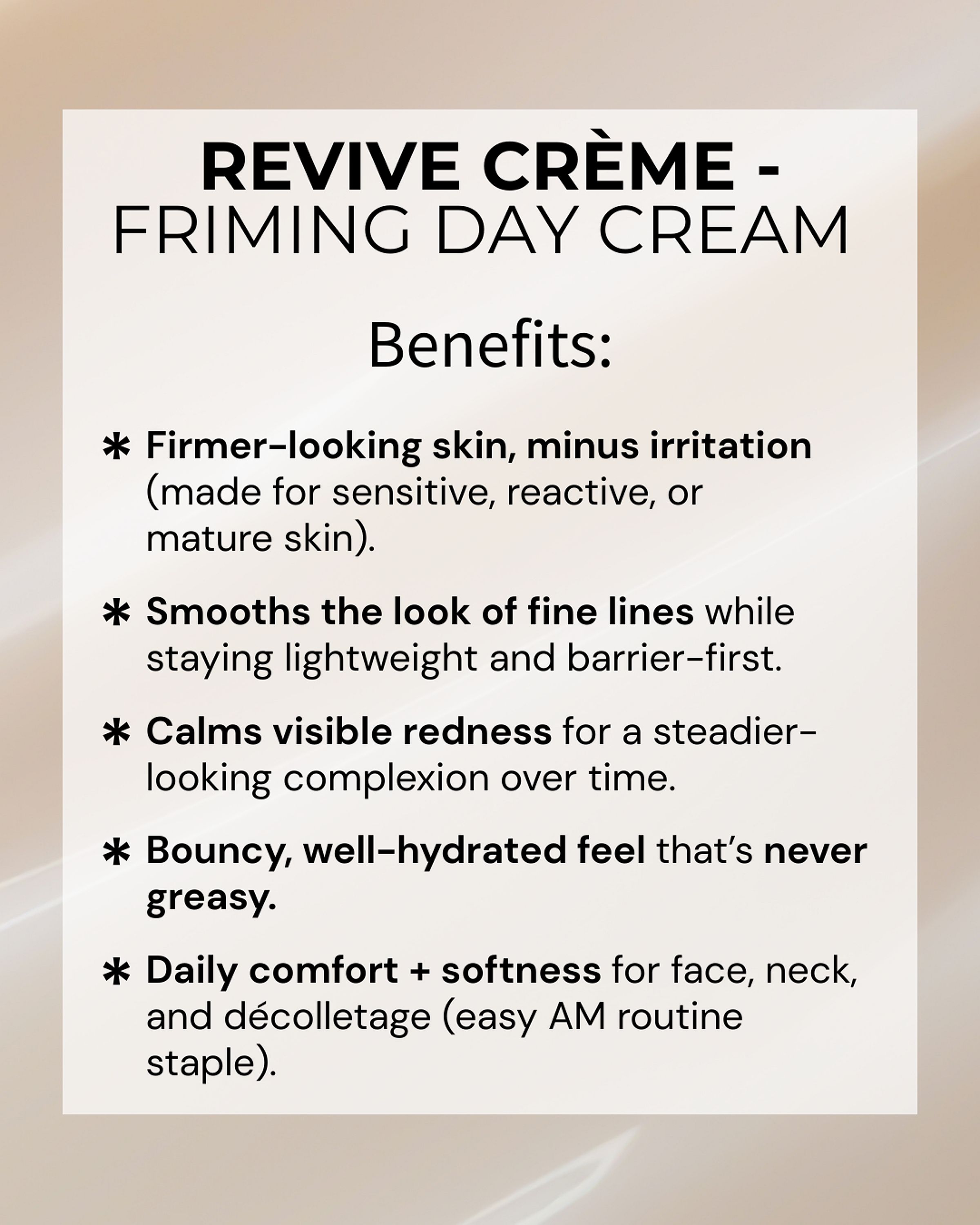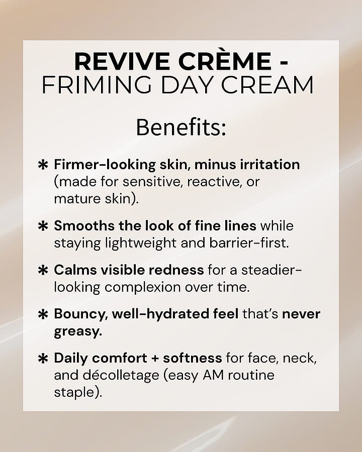 Sensitive, reactive, or mature skin that wants firmer, smoother, well-hydrated skin -without irritation. Revive Crème is a lightweight, barrier-first day moisturizer that firms + smooths the look of fine lines, calms visible redness, and delivers bouncy hydration that feels never-greasy - so your skin looks steadier over time.