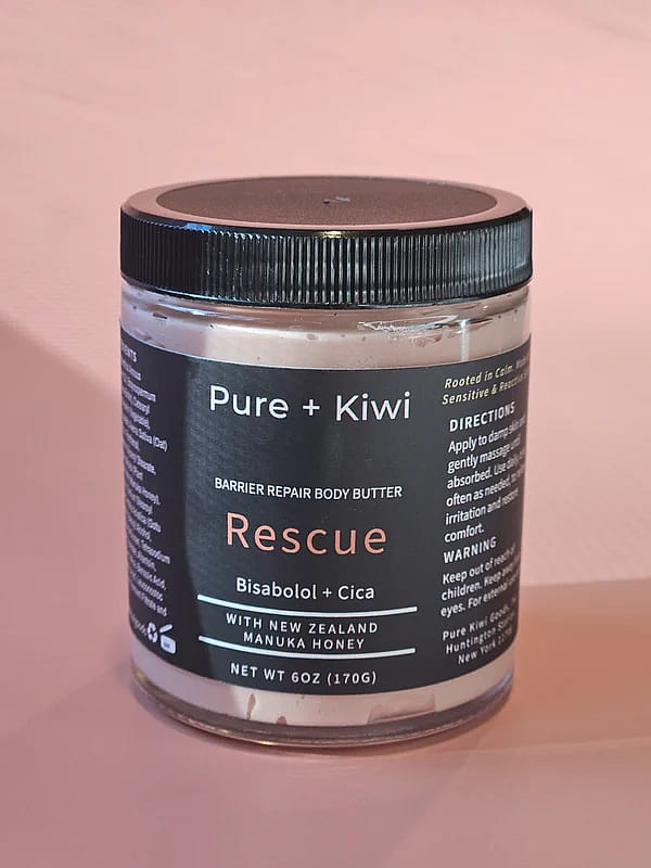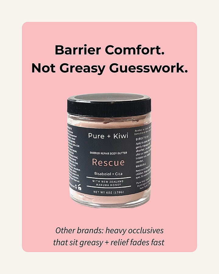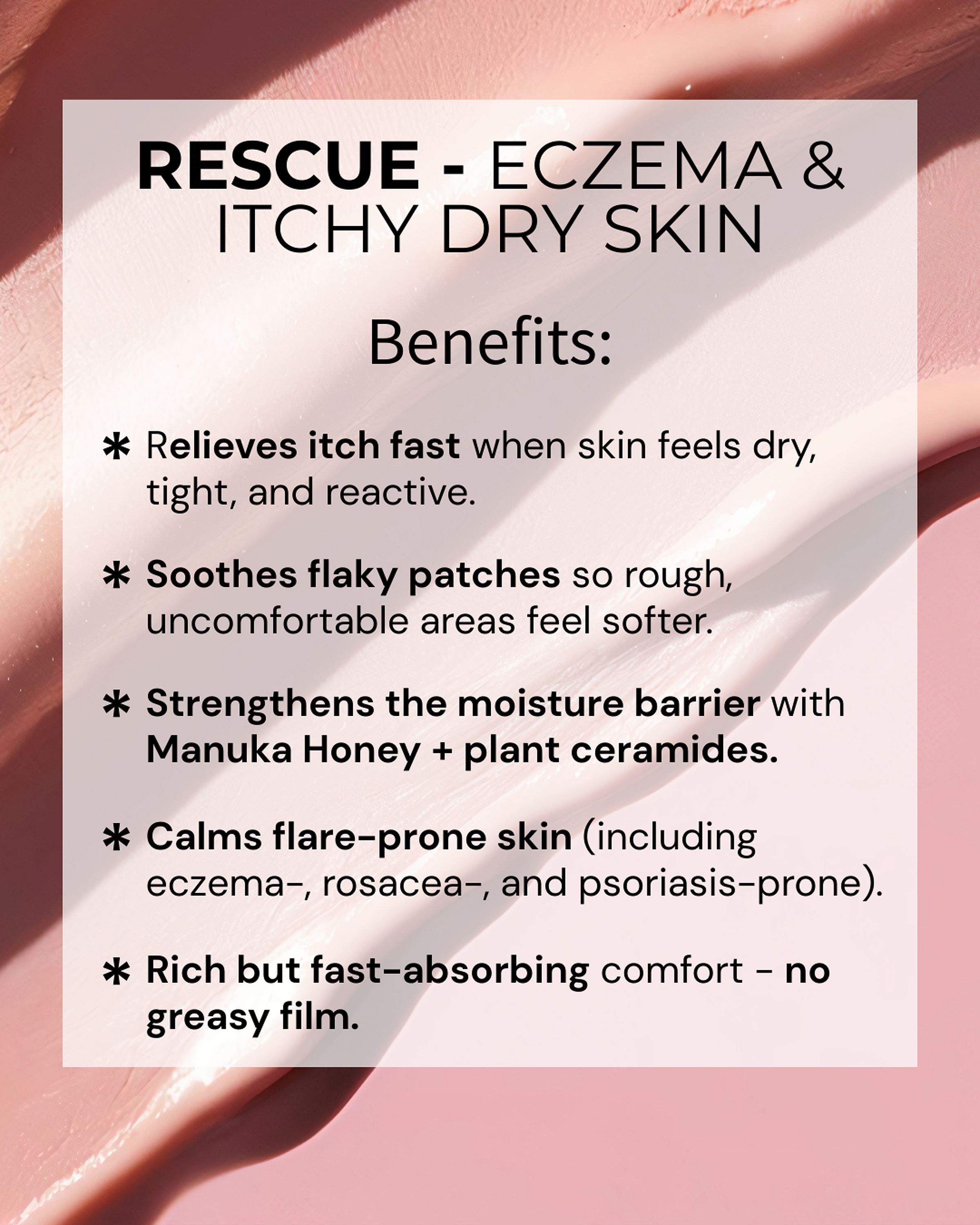 Rescue is a rich-but-fast-absorbing body butter for dry, tight, itchy, reactive skin (including eczema-, rosacea-, and psoriasis-prone). It instantly relieves itch and flaky patches, then helps strengthen the barrier with Manuka Honey + plant ceramides - so skin feels cushioned, calm, and comfortable without a greasy film.