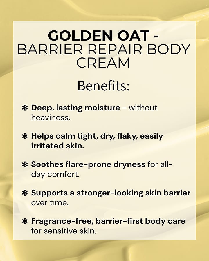 When hormonal shifts, stress, or cold weather leave your body skin tight, dry, flaky, or easily irritated, Golden Oat delivers deep, lasting moisture without heaviness - so skin feels calmer, softer, and more comfortable over time. It’s fragrance-free, barrier-first care designed to soothe flare-prone dryness and support a stronger-looking skin barrier for long-term comfort.