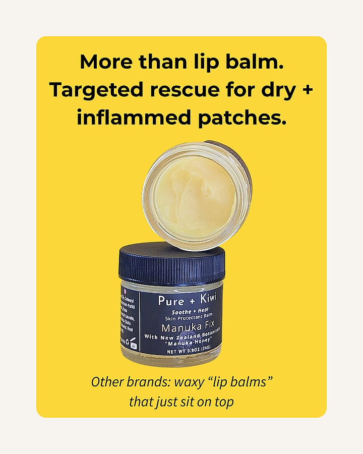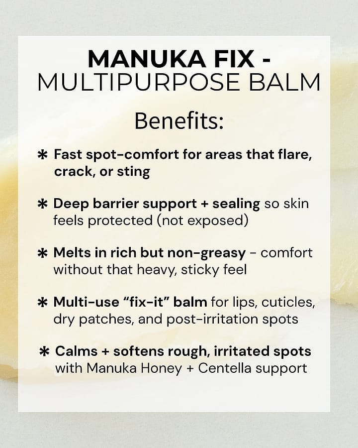 For sensitive, reactive, eczema-prone skin that flares, cracks, or stings, Manuka Fix delivers fast spot-comfort and deep barrier support in one rich (but non-greasy) multi-use balm. Powered by Manuka Honey + Centella, it melts into rough, irritated areas to help skin feel calmer, softer, and protected—perfect for lips, cuticles, dry patches, and post-irritation spots.