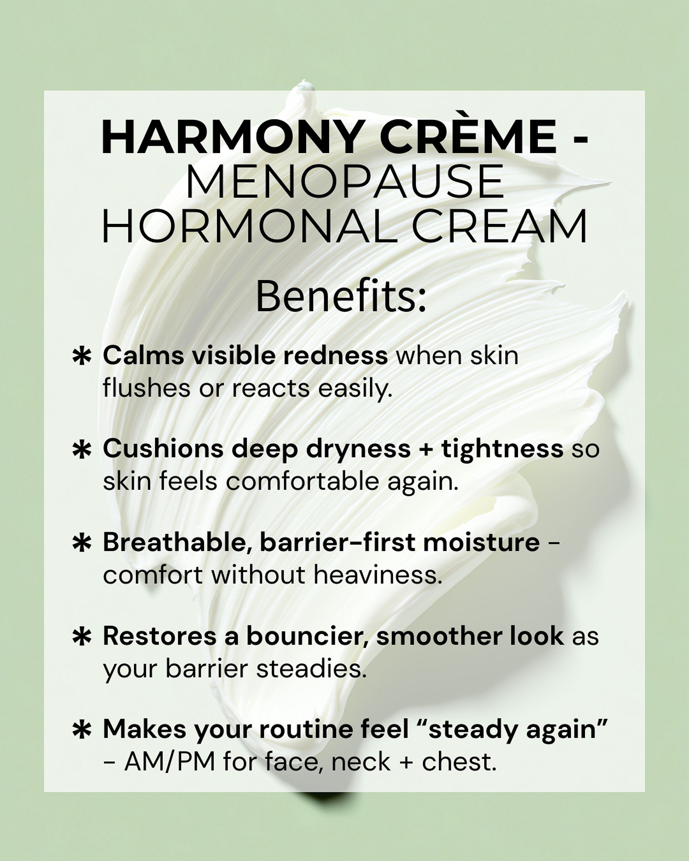 When your skin suddenly feels drier, tighter, and easier to flush or react, Harmony Crème brings it back to comfort - without heaviness. This breathable, barrier-first moisturizer is made for perimenopause/menopause and hormonally sensitive skin to calm visible redness, cushion dryness, and restore a bouncier, smoother look - so your routine finally feels steady again (AM/PM on face, neck + chest)