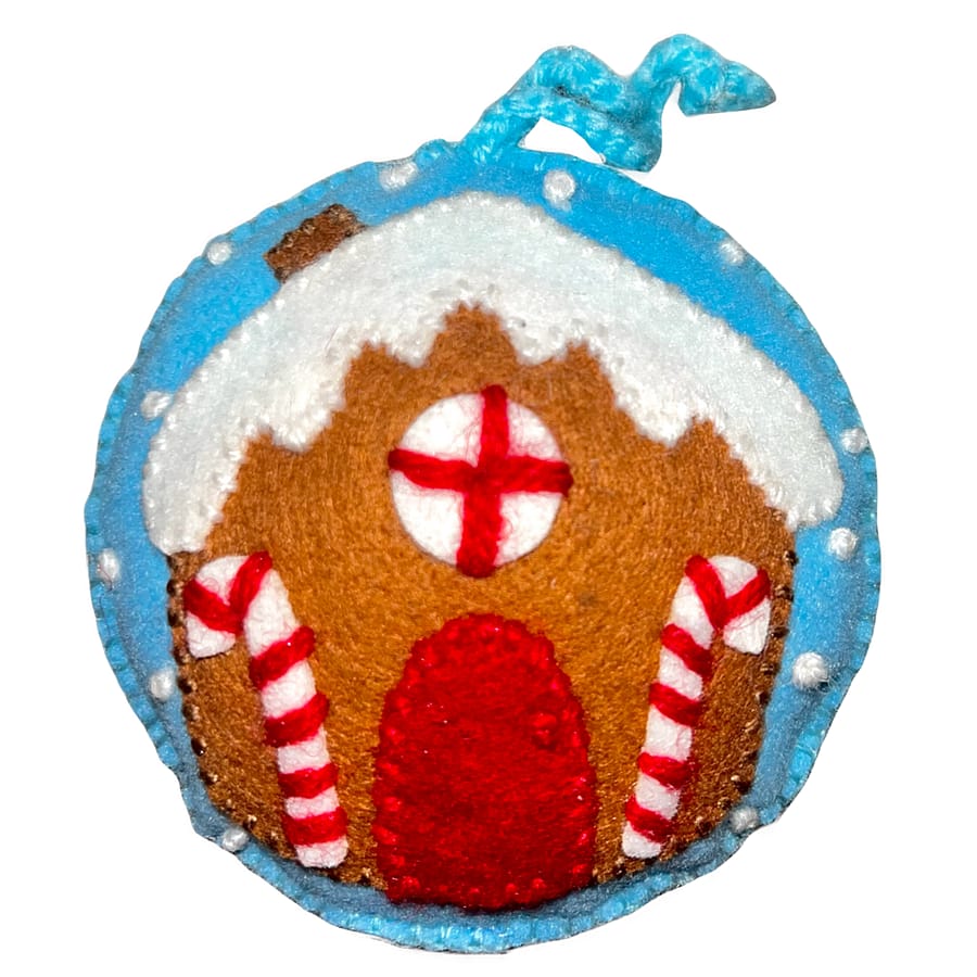 Materials: felt, wool blend felt, wool felt Felt Christmas ornament - Gingerbread house Measurement: L-4", W-4" Please note that ornaments are decorated on one side only. Other side is solid color.