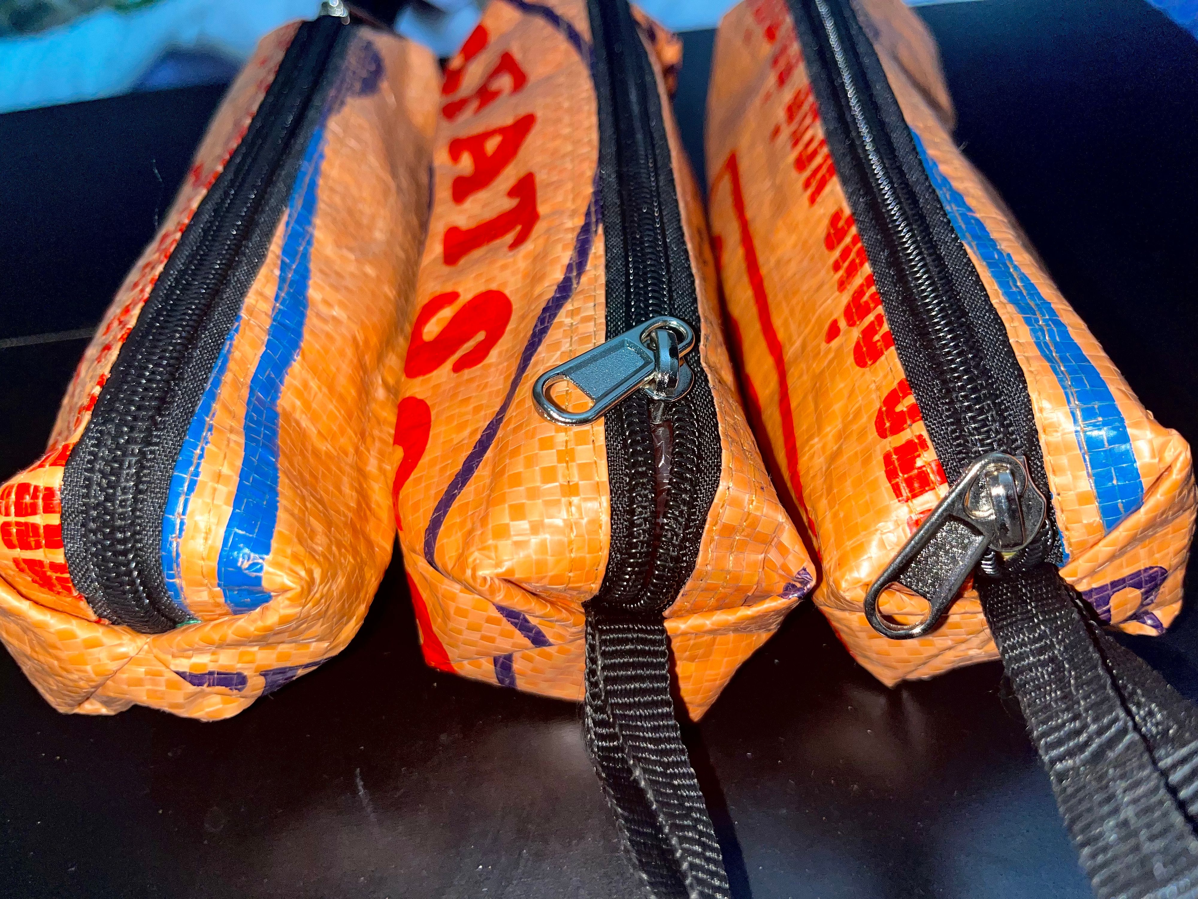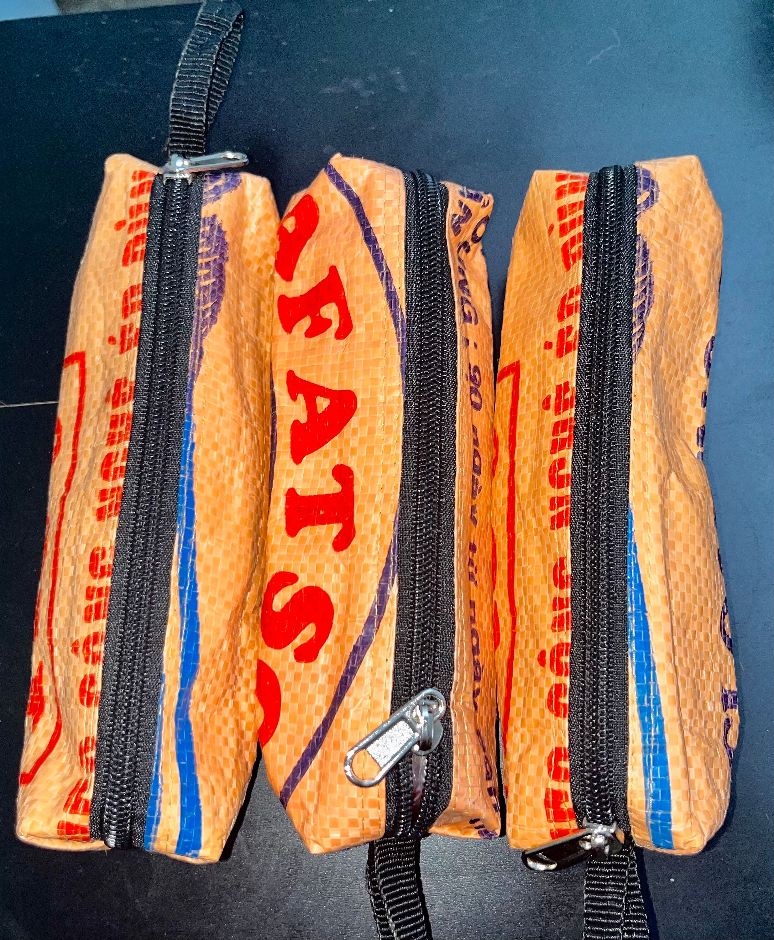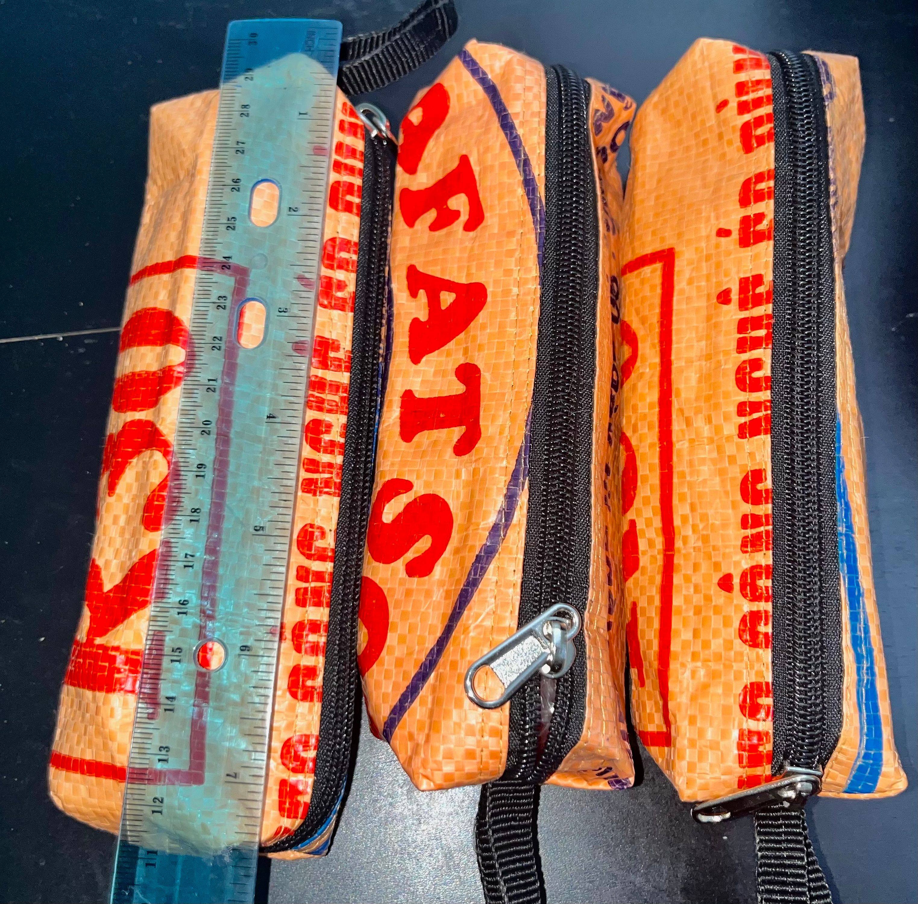Cute little pencil bags made from wholesale rice sack bags, handmade in Sri Lanka by a Fair Trade certified company. These simple yet functional purses are closed with brightly coloured zips and are ideal for coins, credit cards, small cosmetic items such as hair grips and cotton buds, as well as all sorts of other little bits and pieces. A great way to prevent plastic sacks from ending up in landfill, and providing employment for women in rural areas of the country.