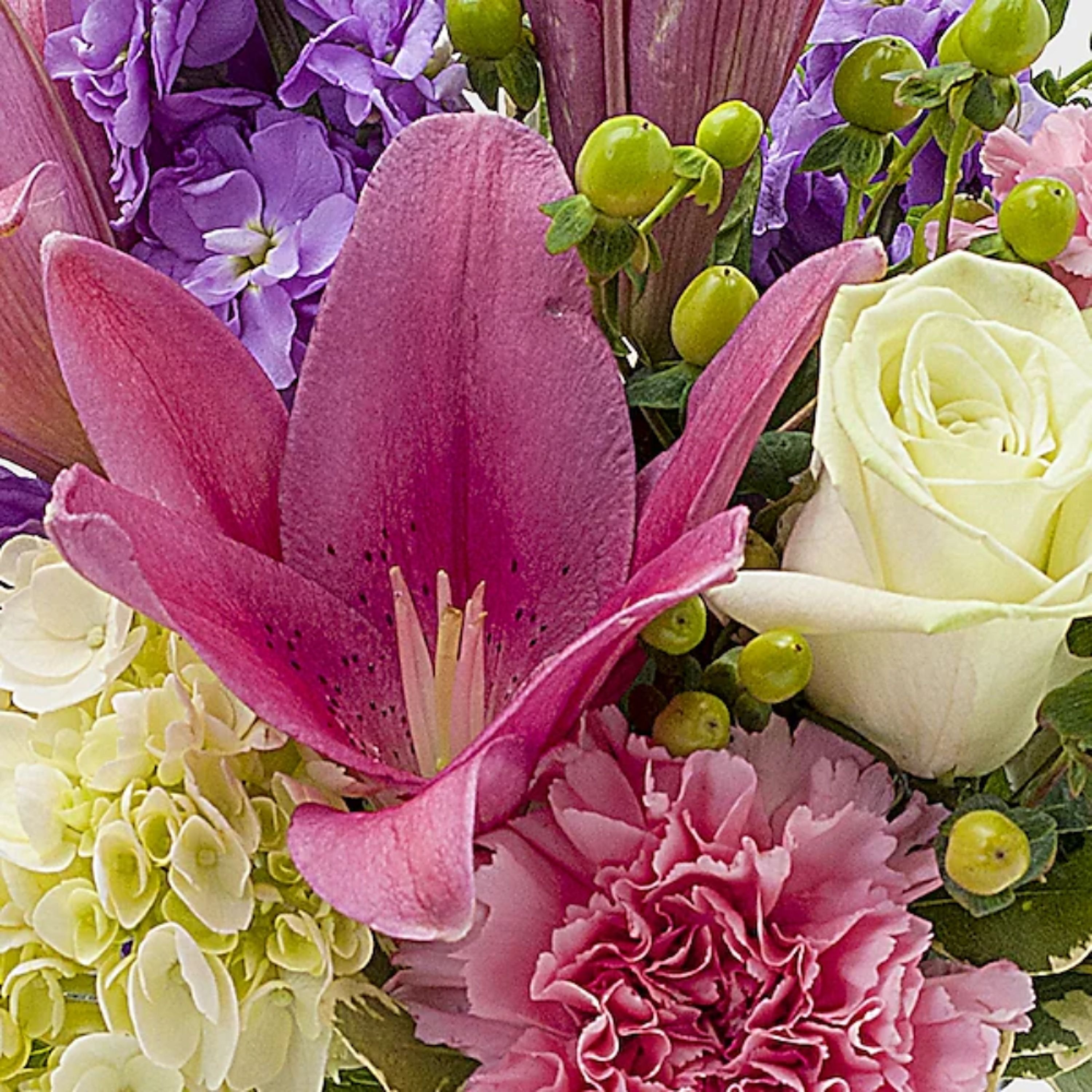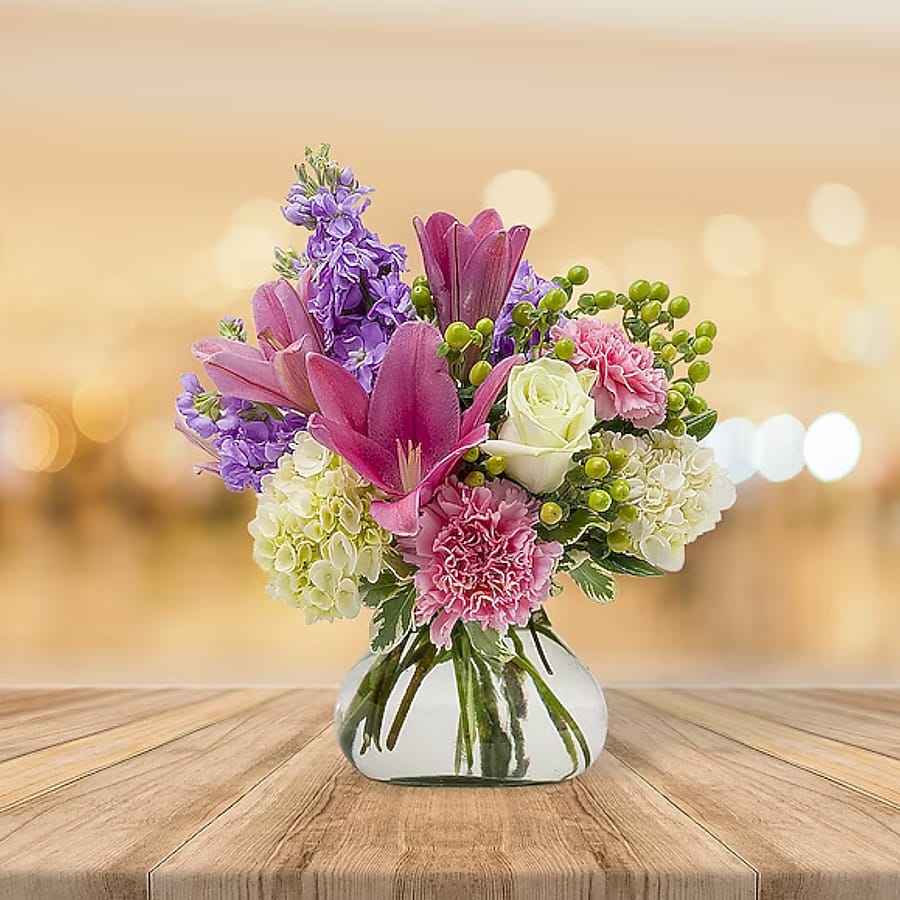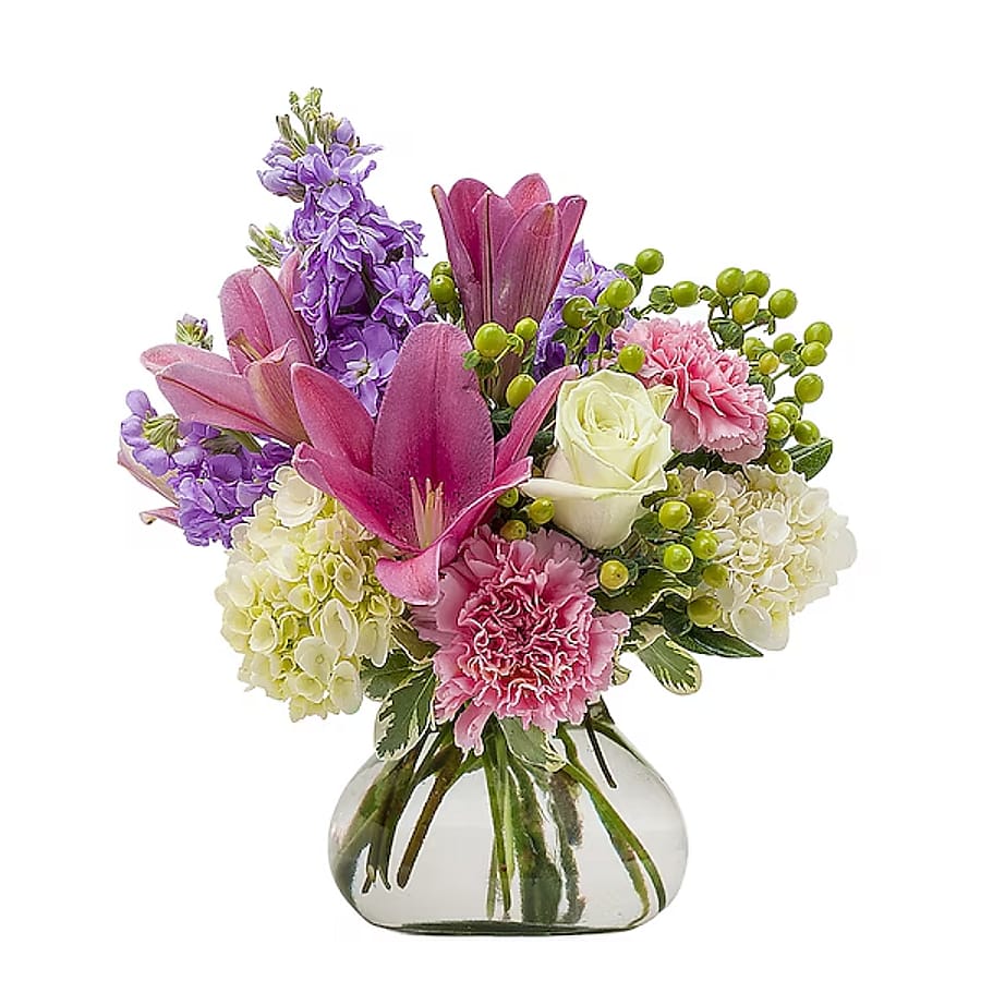 Head for the countryside. Villa uses a mix of pink and green blooms in a fun rosie posie vase. *Container may vary. *Approximately 9"W X 9"H