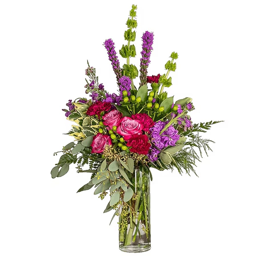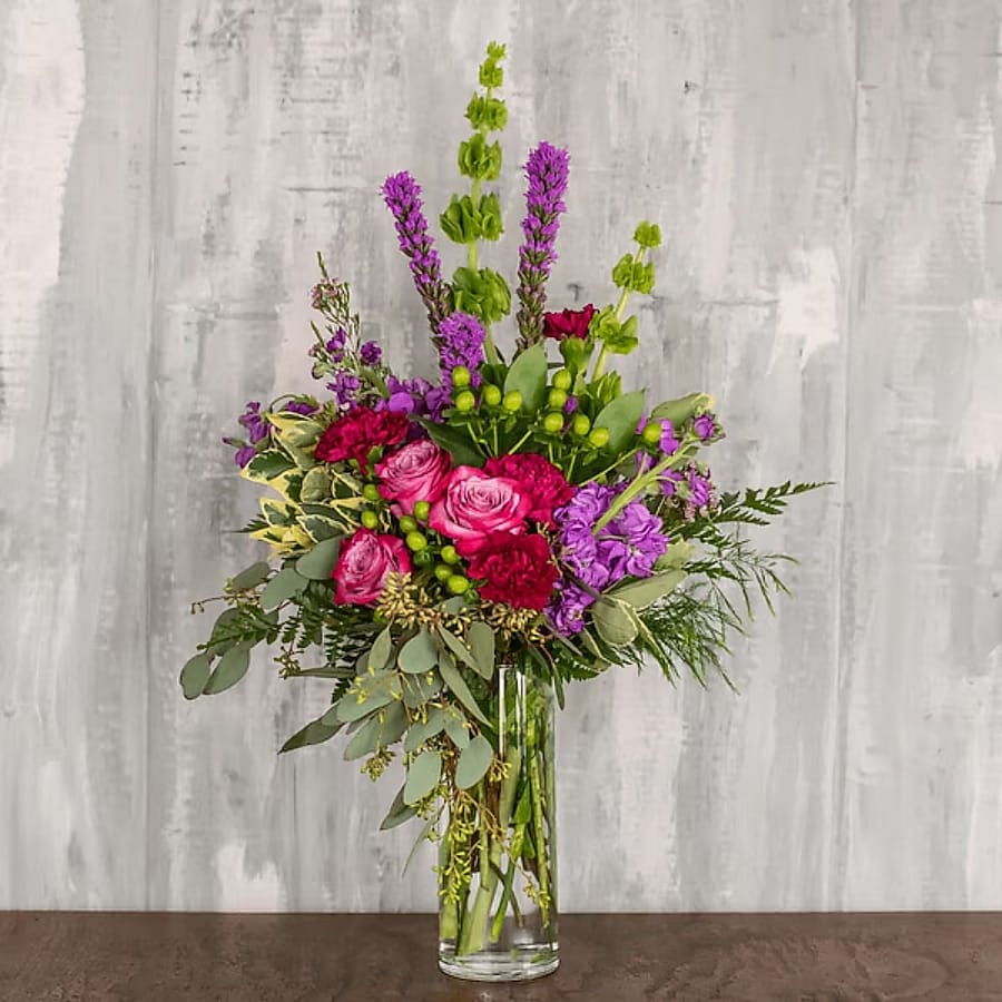 Near or far, everyone can use a warm embrace. Wrapped in a Hug is just the ticket to wrap someone in love. Flowers like roses, liatris and carnations are an inviting mix in our cylinder vase; perfect for any occasion.