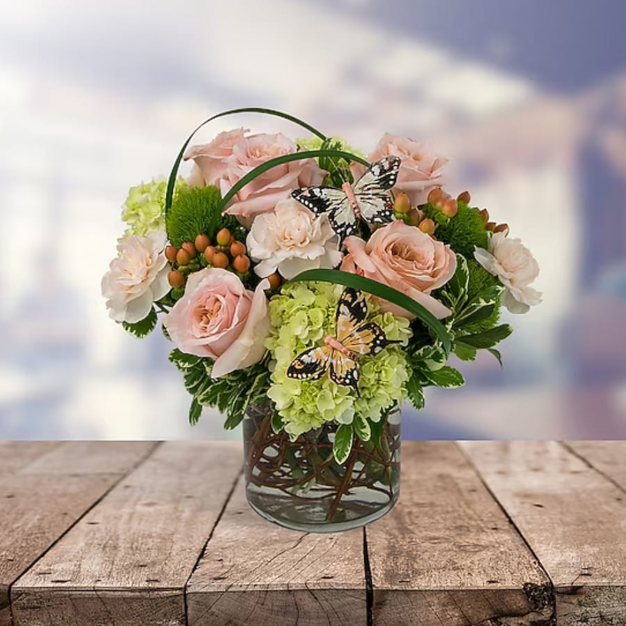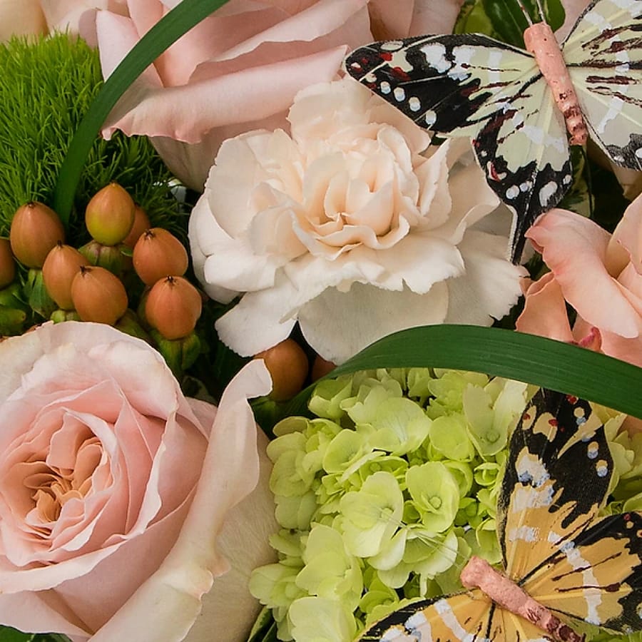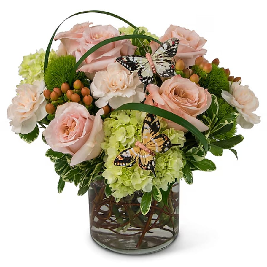 Show your appreciation with the Song of Gratitude bouquet. A pair of butterflies visit this grouping where peach roses, green hydrangea, carnations, dianthus and berries are topped with loops of lily grass. This gift is sure to be a pleasant surprise.