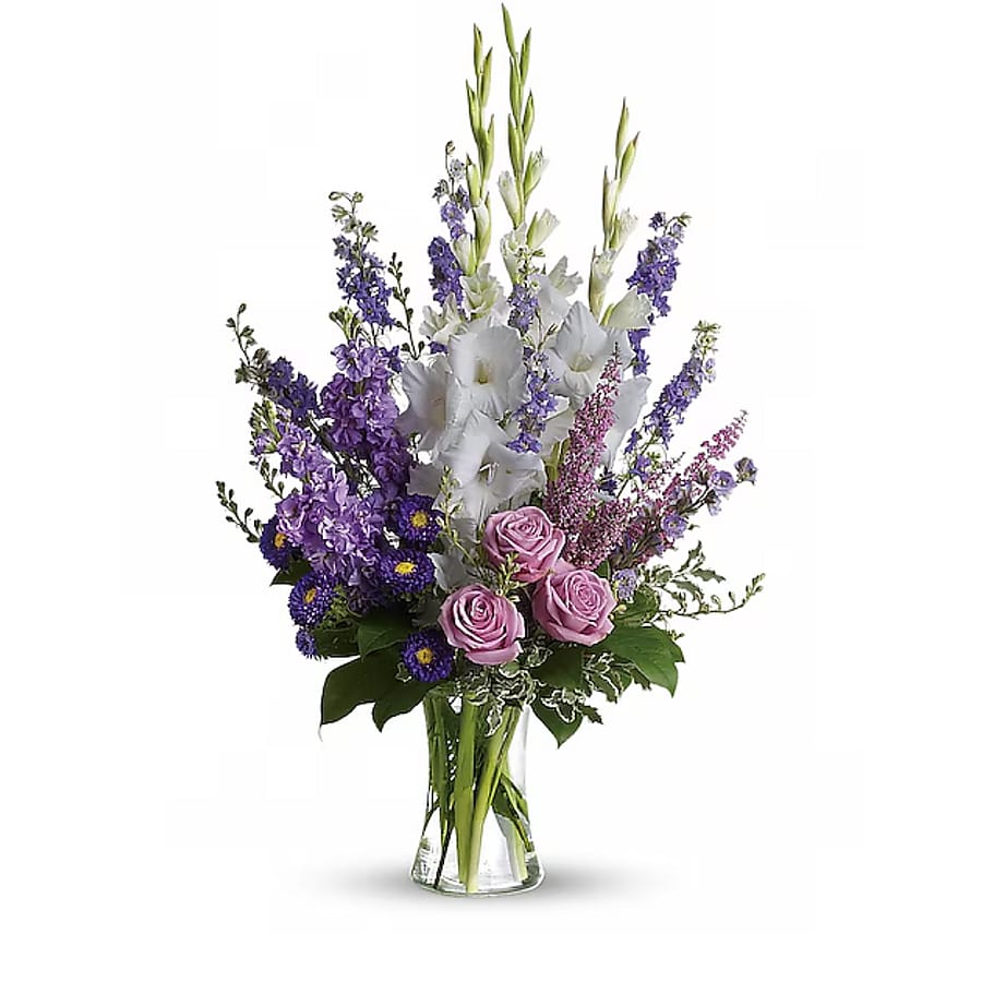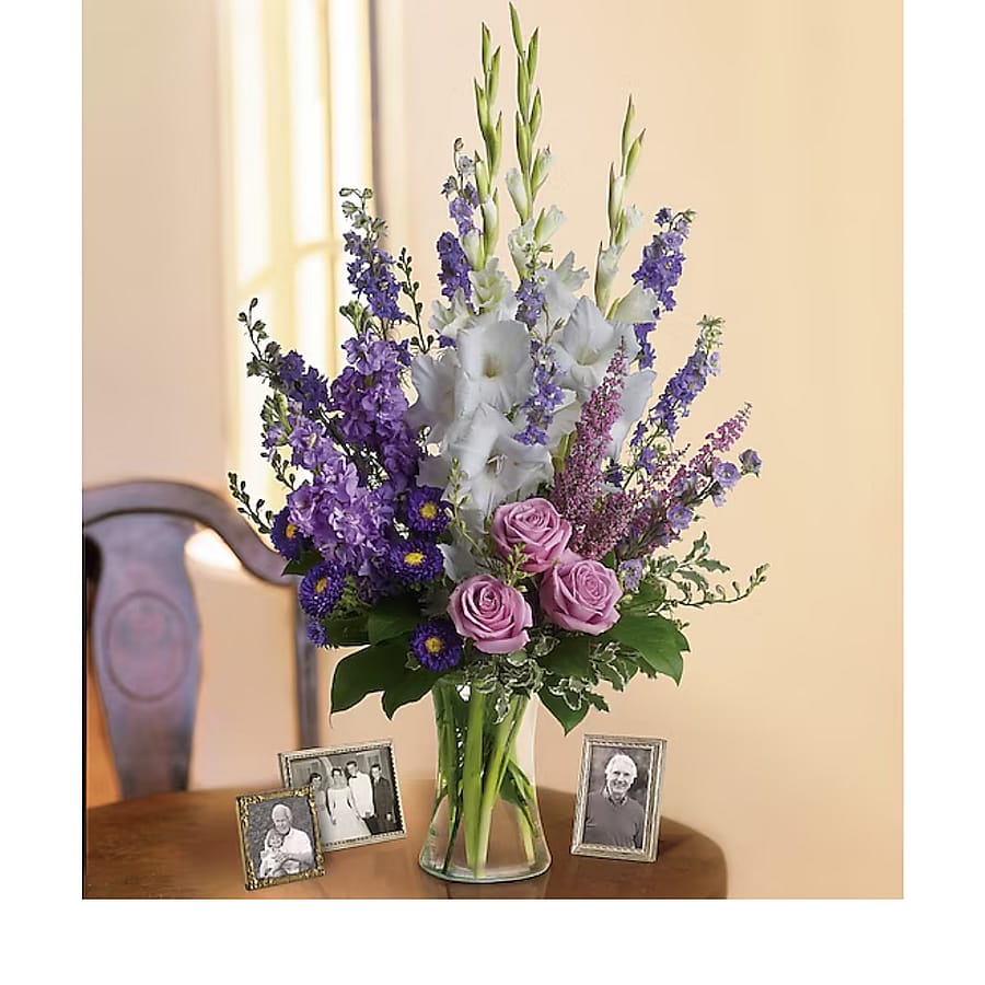 Lavender and white sympathy flowers make a grand statement in this joyful bouquet. Cherish your memories with this lasting remembrance of lavender larkspur and roses, deep purple asters, pure white gladioli and the softest pink heather.