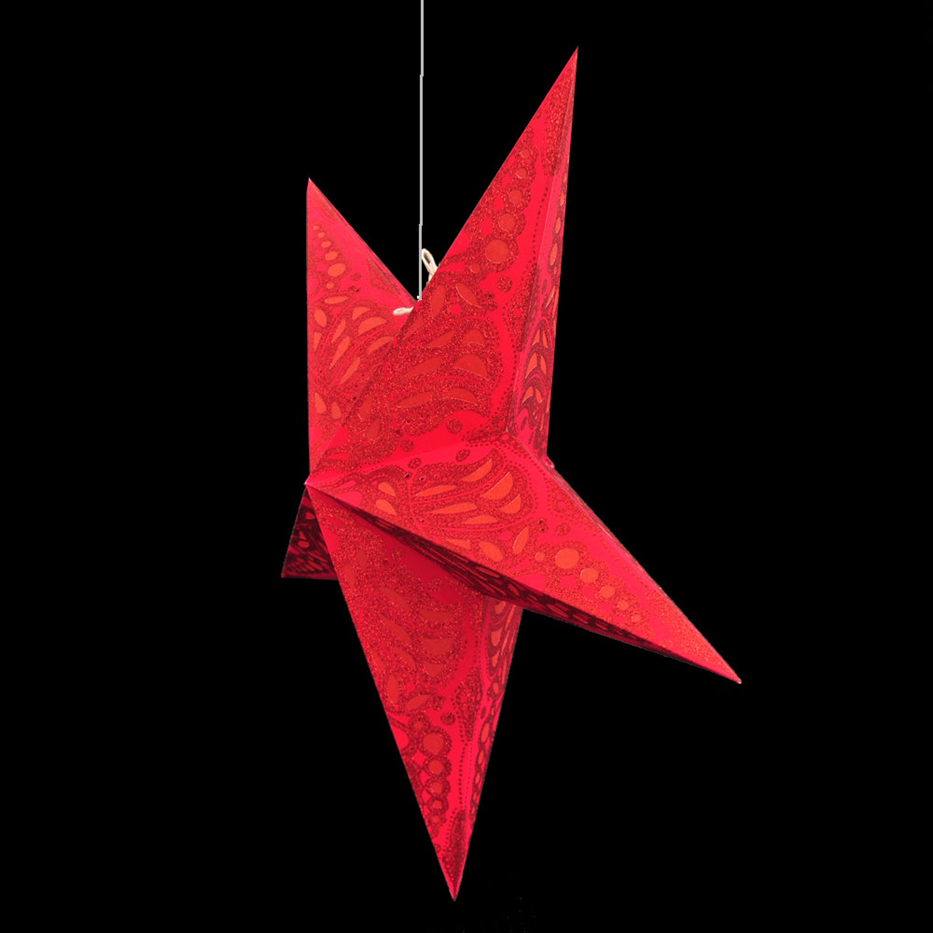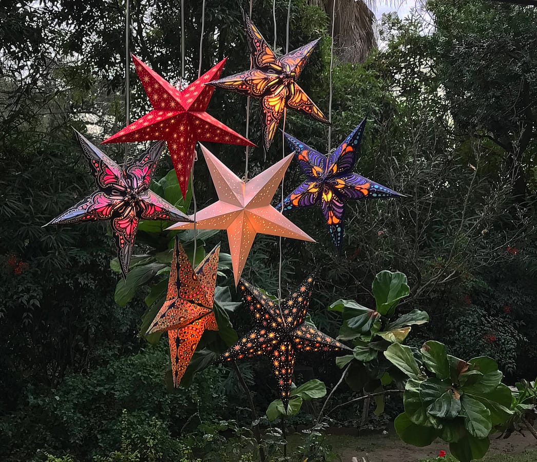 Handmade paper Artecnica /Earth-Friendly stars that will illuminate any surroundings with extraordinary beauty. These gorgeous paper lanterns are handmade in Goa, India, and sent with love for people to enjoy around the world. You can be assured that every lantern is produced under fair and eco-conscious conditions. Paper lanterns are handcrafted using natural materials and 100% wood-free and chlor-free paper. Some designed to "twinkle" like stars in the night sky, others to cast mesmerizing shadows,and all of them bring fun and festivity to your home. Each hand-printed and punched starlight lamp design is an original. Designs are developed by an international team of designers whose principles include ethical working conditions, fair wages and environmental sustainability. Lanterns can be ordered with a 15 ft electrical cord kit, 110v, that is specially designed for the stars. Electrical cord is UL listed and GS-marketed for safety. Cord kit Listing here: https://delivery.bytrellus.com/dashboard/products/edit/23839 Starlightz are recognized by a red star label: A symbol that assures you safety, originality, and quality. Dimension Diameter: 21 in / 53 cm Depth: 8 in / 20 cm Material: Wood-free paper