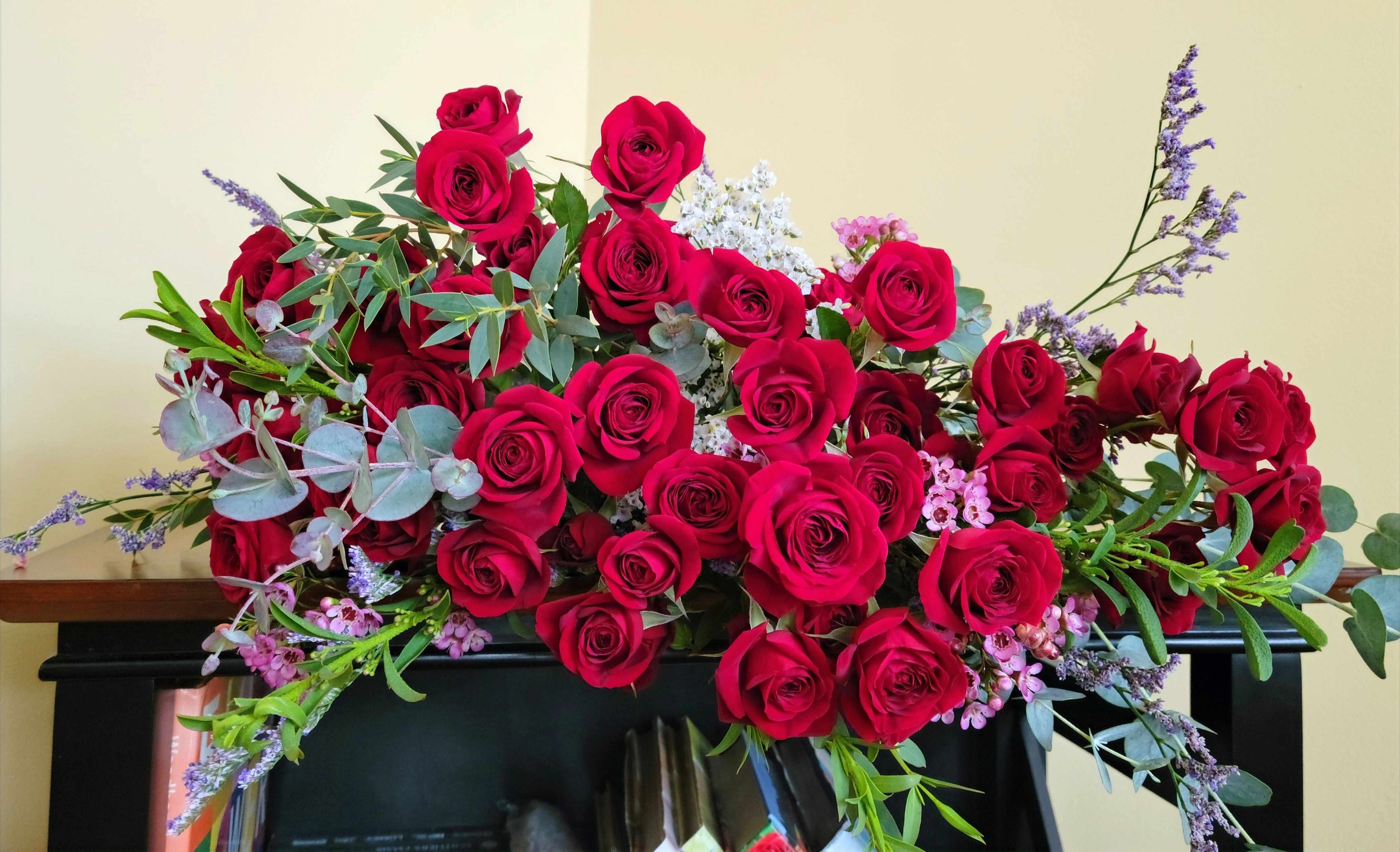 Seasonal fillers and greenery will accompany the roses.