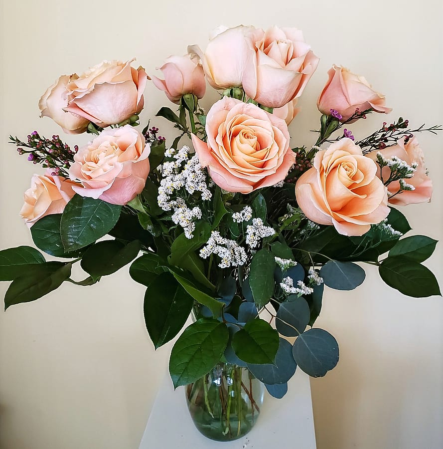 Peach roses are commonly associated with sentiments of gratitude and appreciation. They can also signify a warm feeling of friendship and caring. Send a bouquet of peach roses to convey a message of gratitude or admiration for the love and companionship you share with a partner or friend or as a thoughtful gesture of thankfulness for someone's generosity. Arranged in an attractive glass vase, our premium peach roses are accented with seasonal filler and lush greenery.