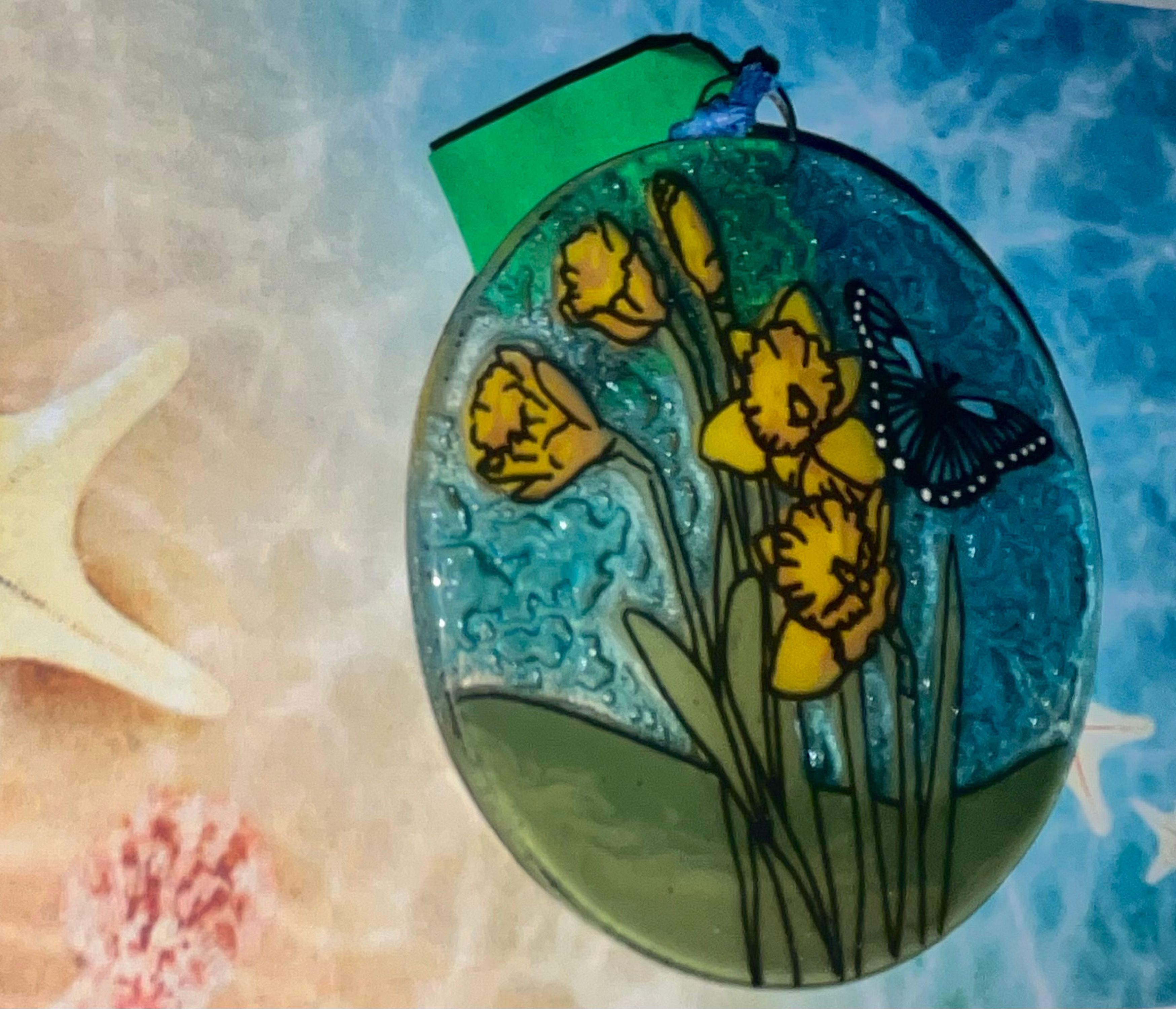 Handmade Fused Glass Disk ornament suncatcher light catcher Daffodil Suncatcher Decor NEW