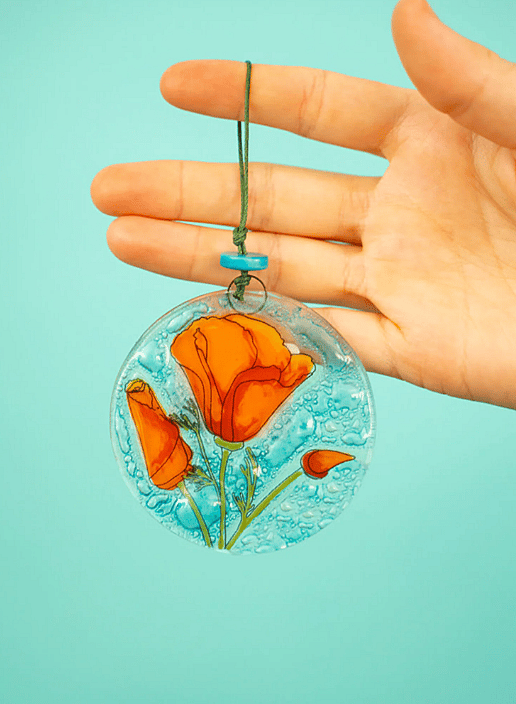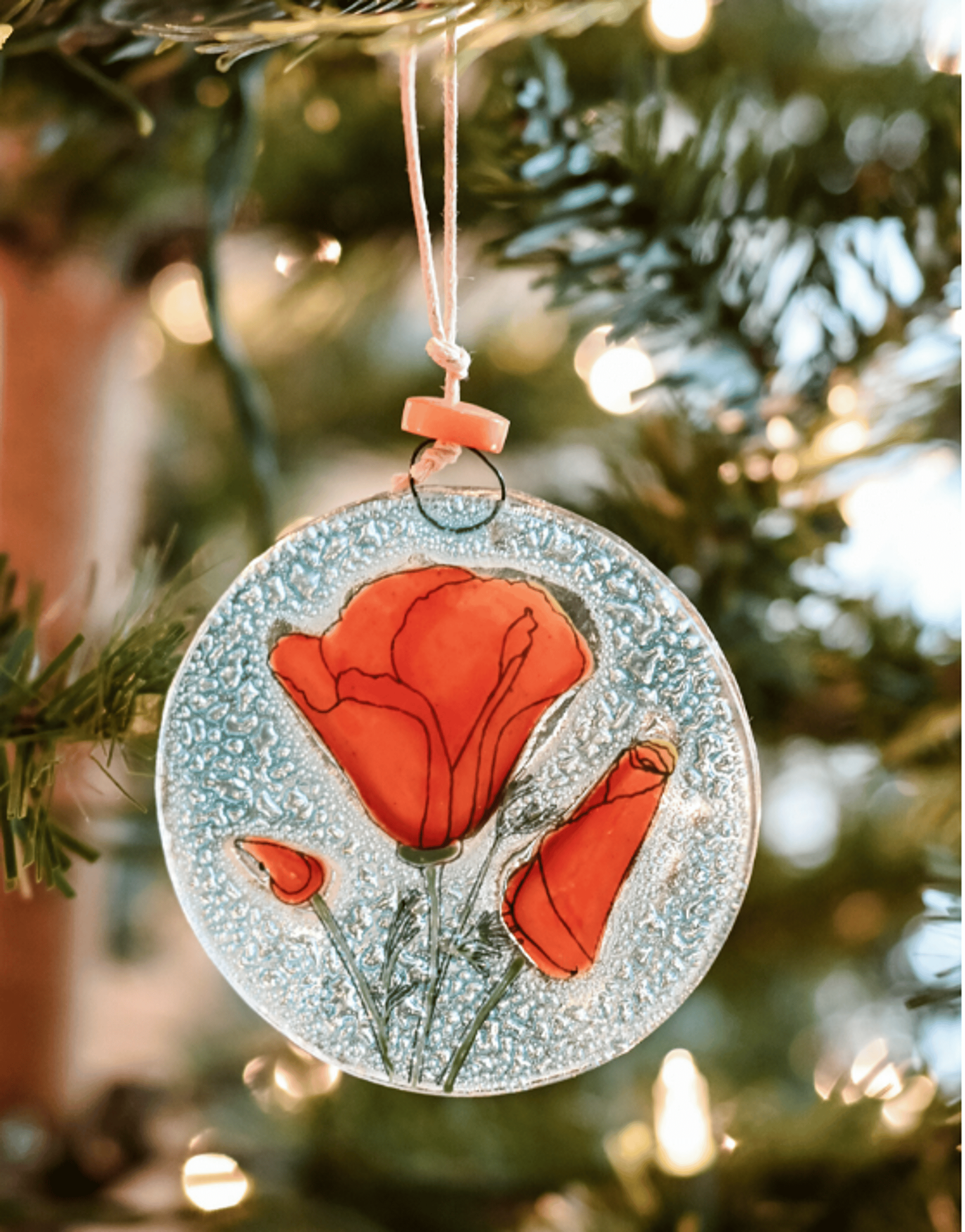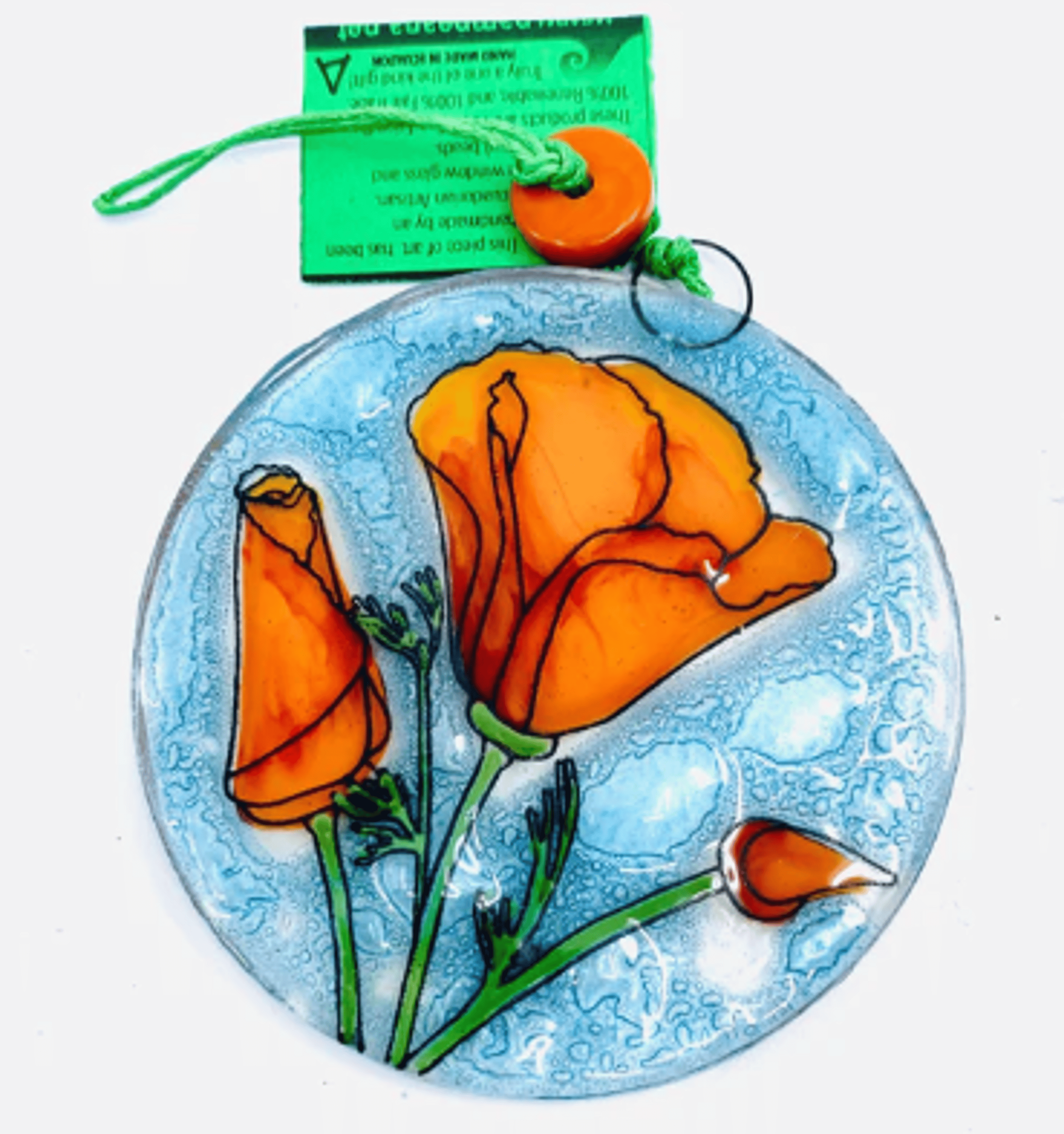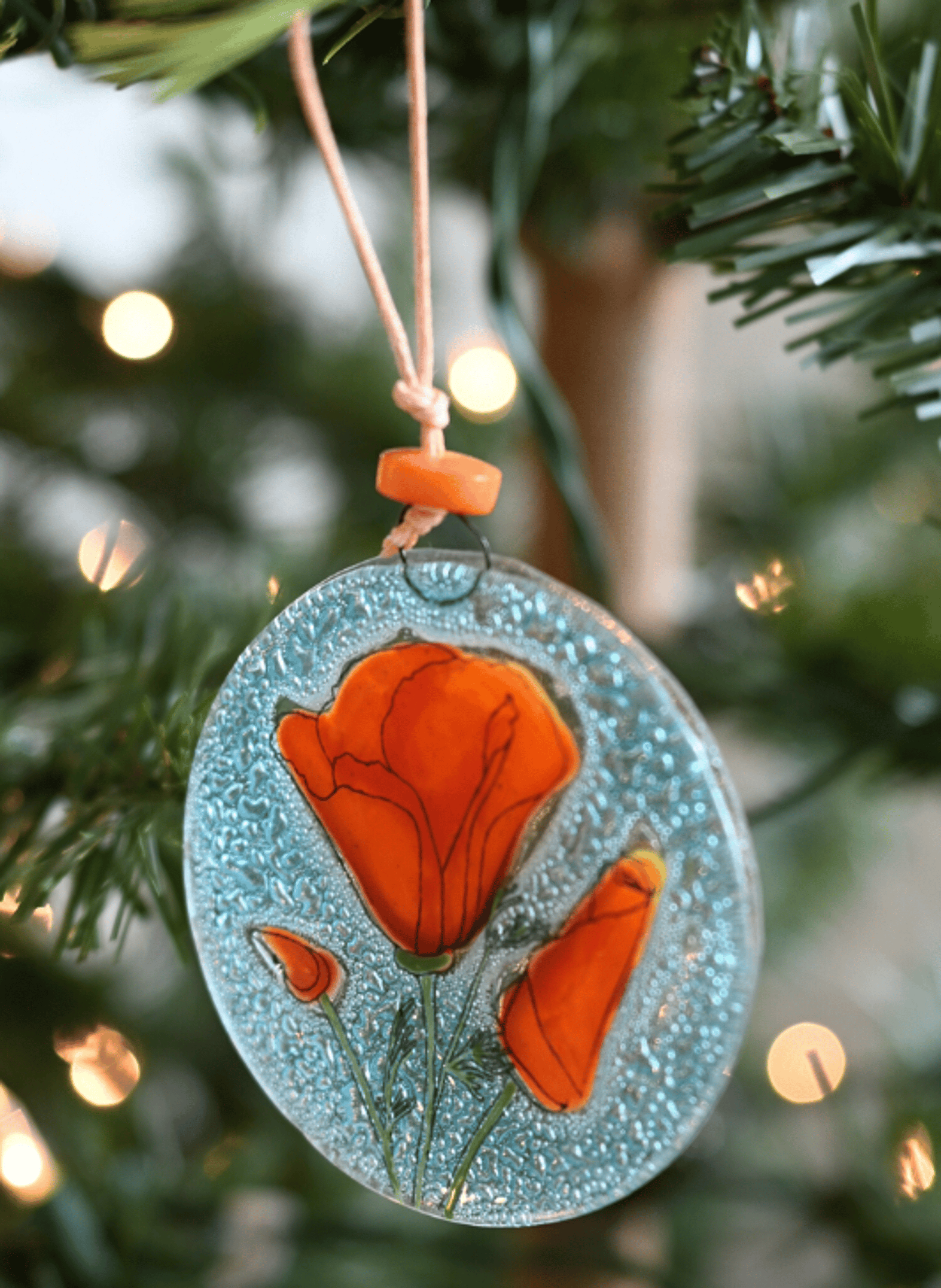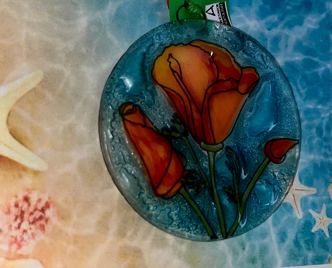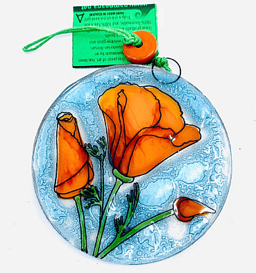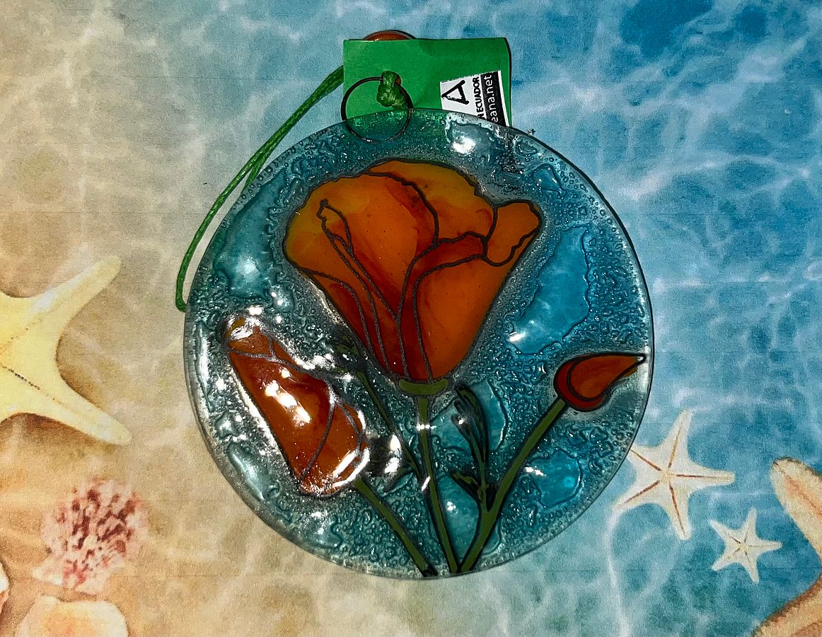 Handmade Fused Glass Disk ornament suncatcher light Orange Poppy Suncatcher Christmas tree Decor NEW