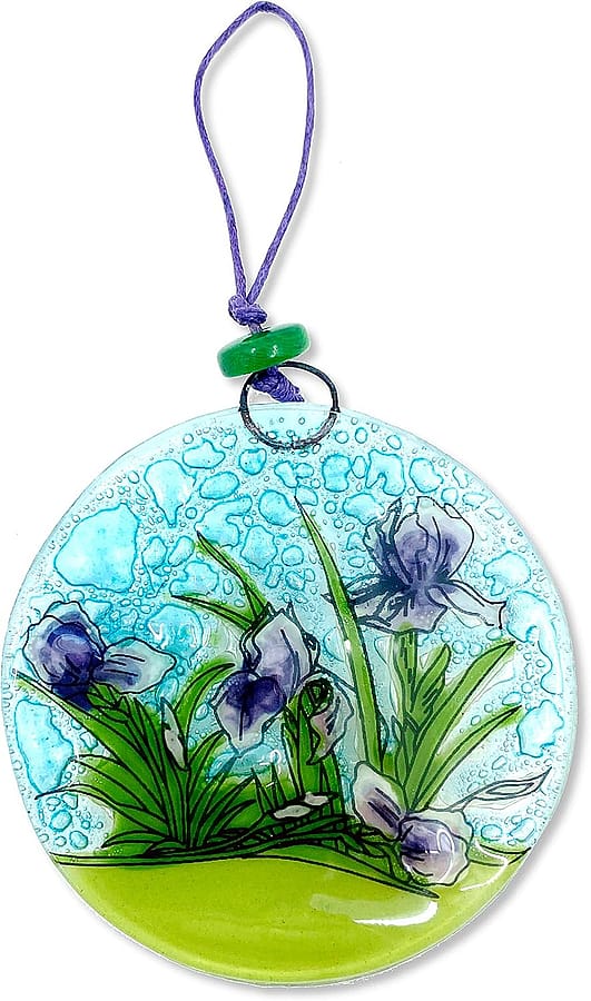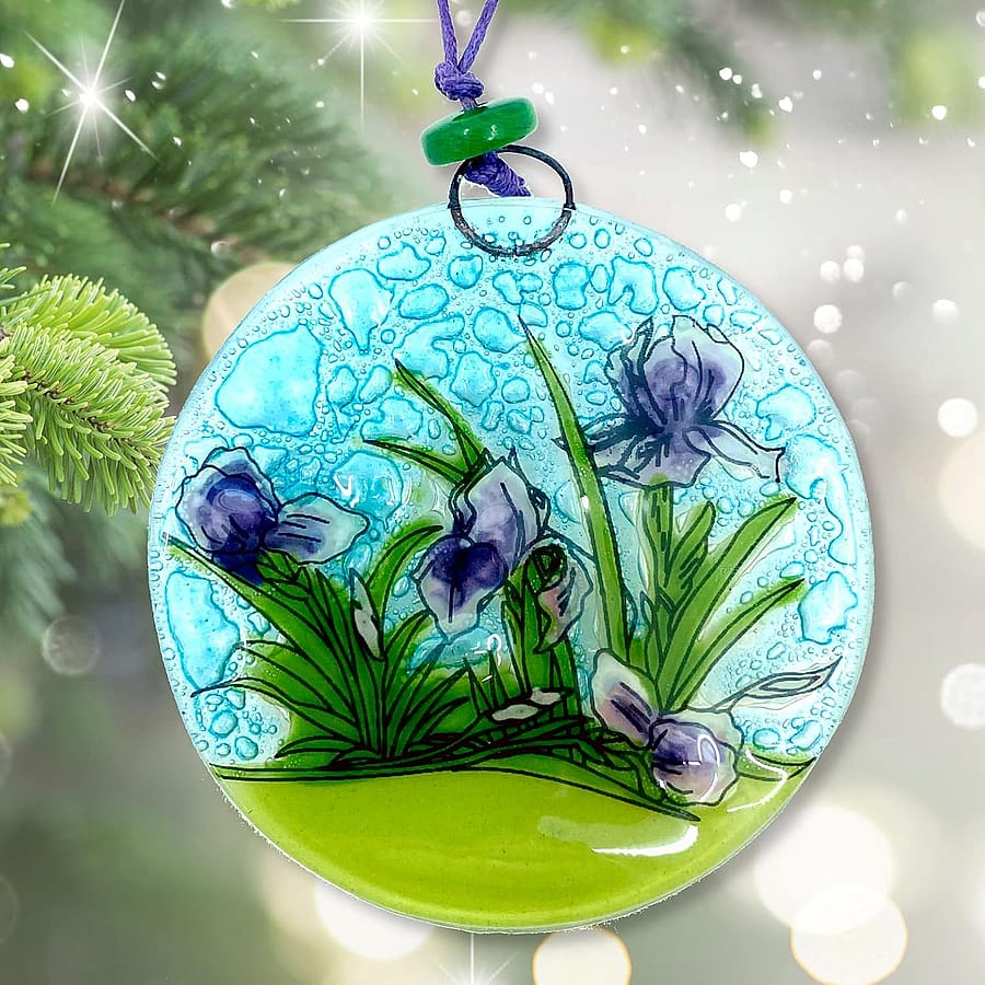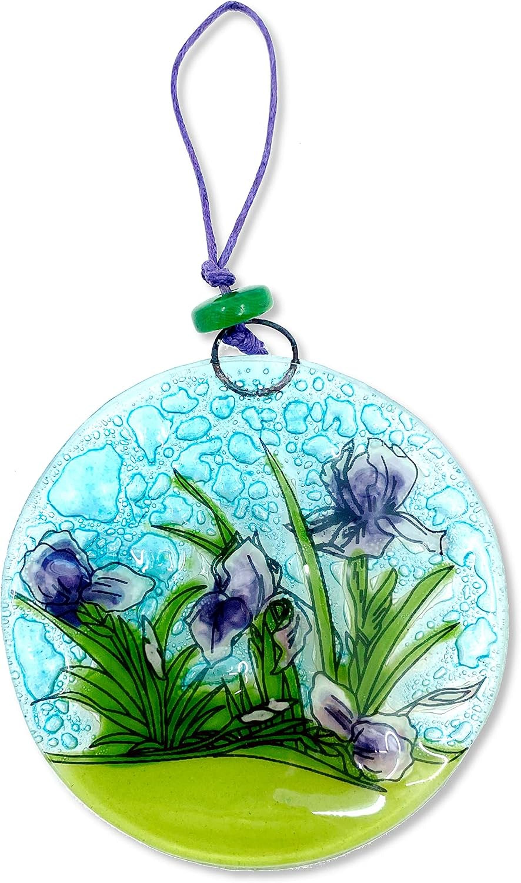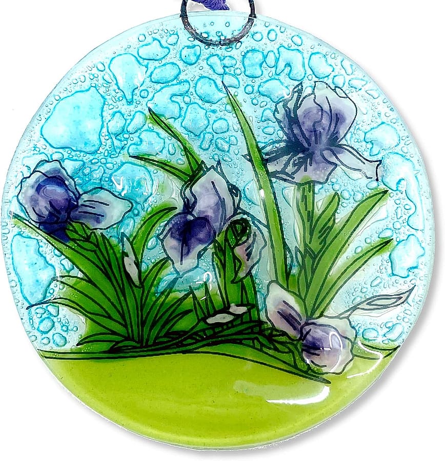 Handmade Fused Glass Disk ornament suncatcher light Iris Flower Suncatcher Christmas tree Decor NEW
