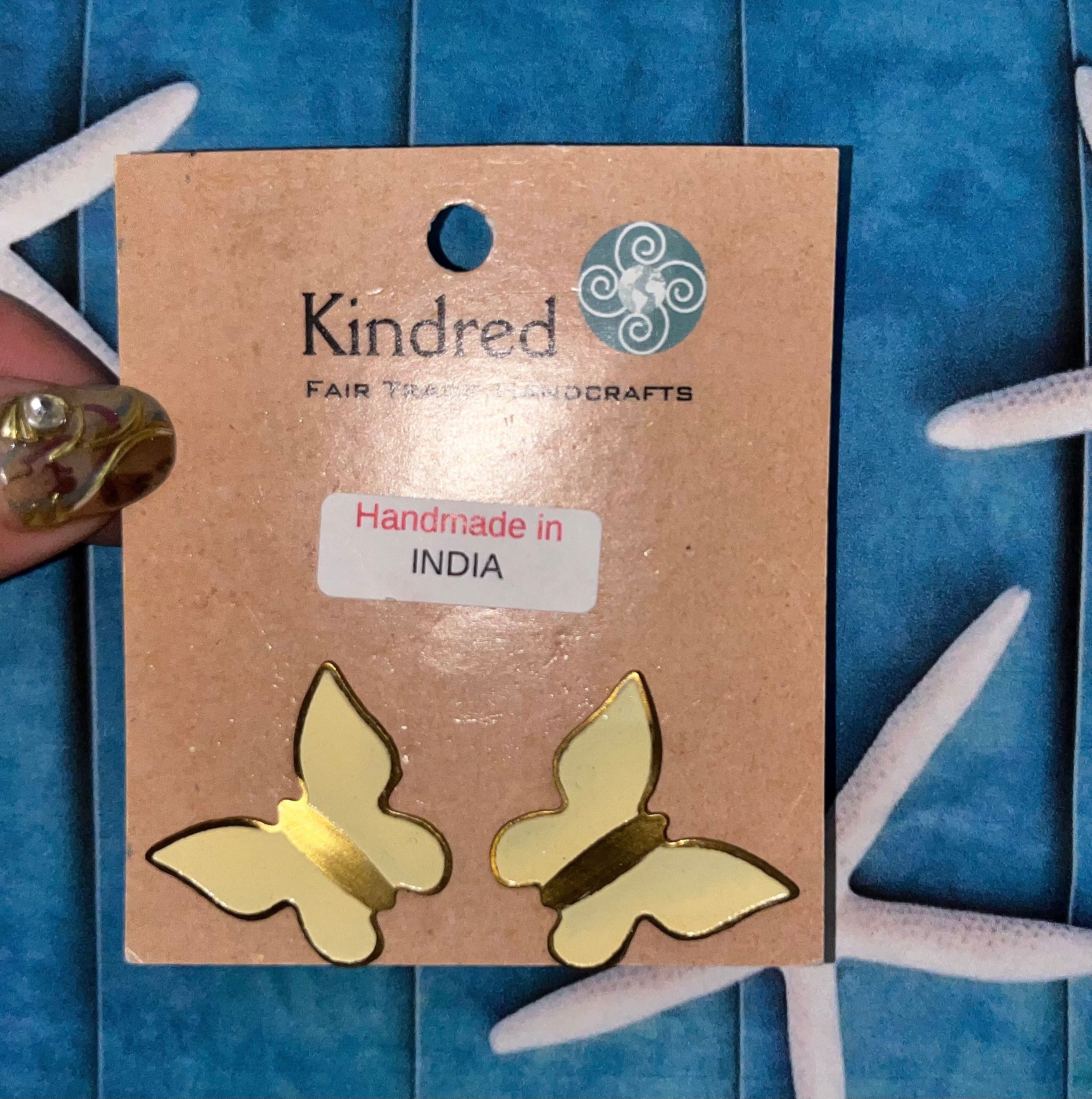 What better way to spread your wings than with these glimmering Butterfly Studs 🦋 each pair is sustainably handcrafted. *color : beige & gold *size : Butterfly W-11xL-14mm *material : brass, stainless steel Hand made in India