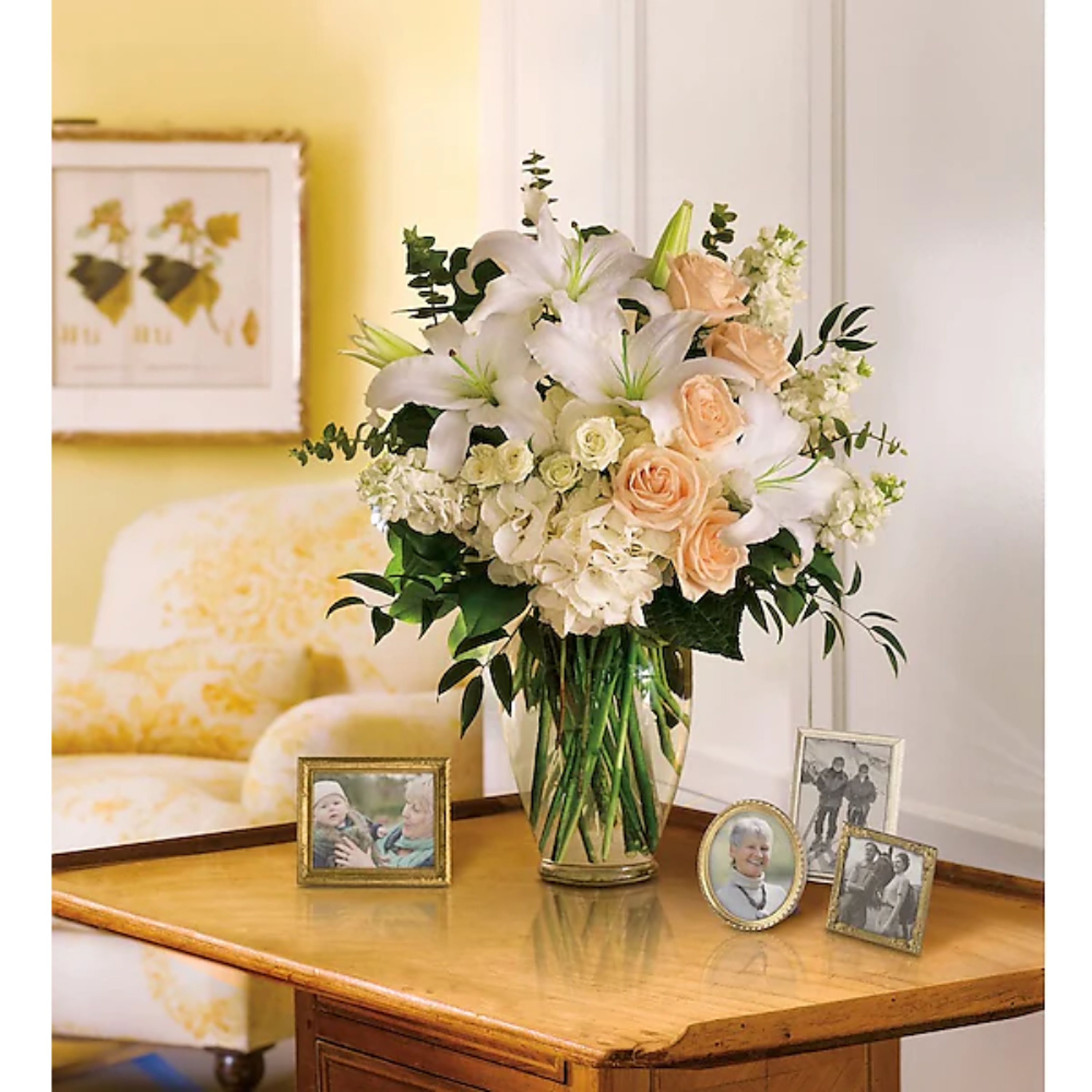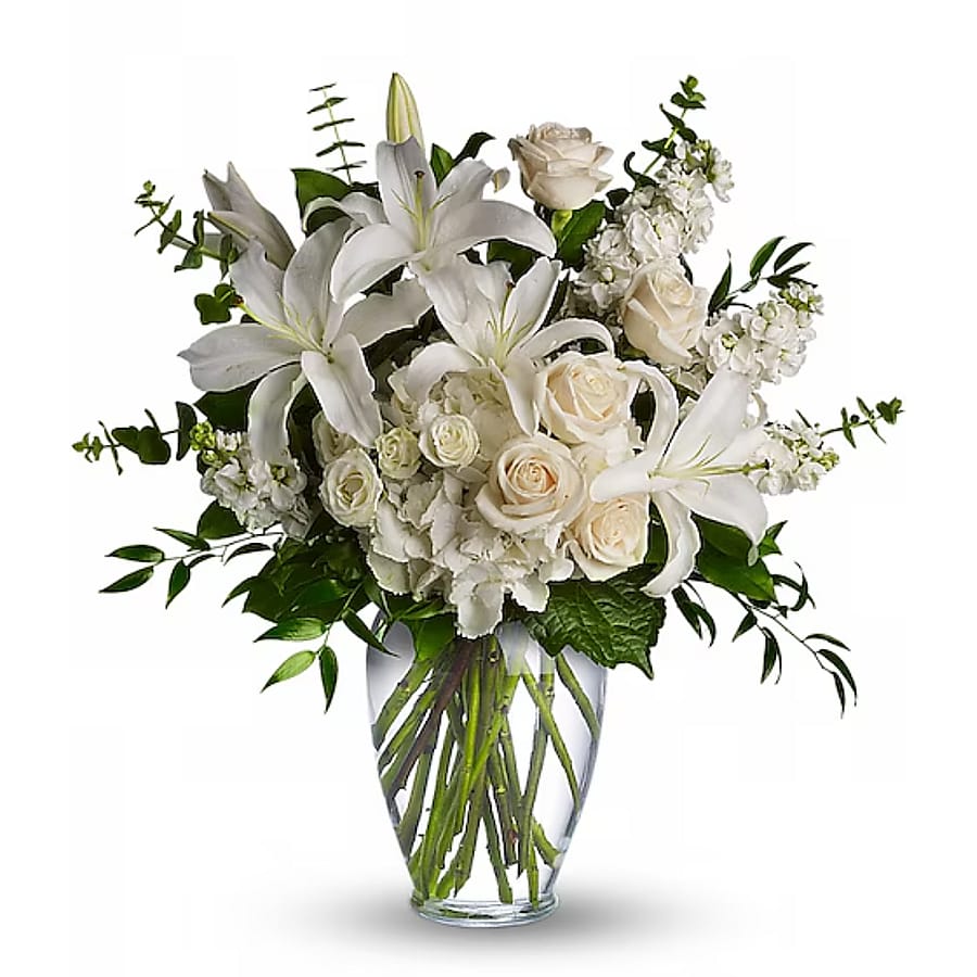 A lovely bouquet to soothe and comfort, a variety of white and peach blossoms beautifully sends your hope and strength. Beautiful flowers such as white hydrangea, spray roses and stock, peach roses, eucalyptus and more fill a tall glass vase.