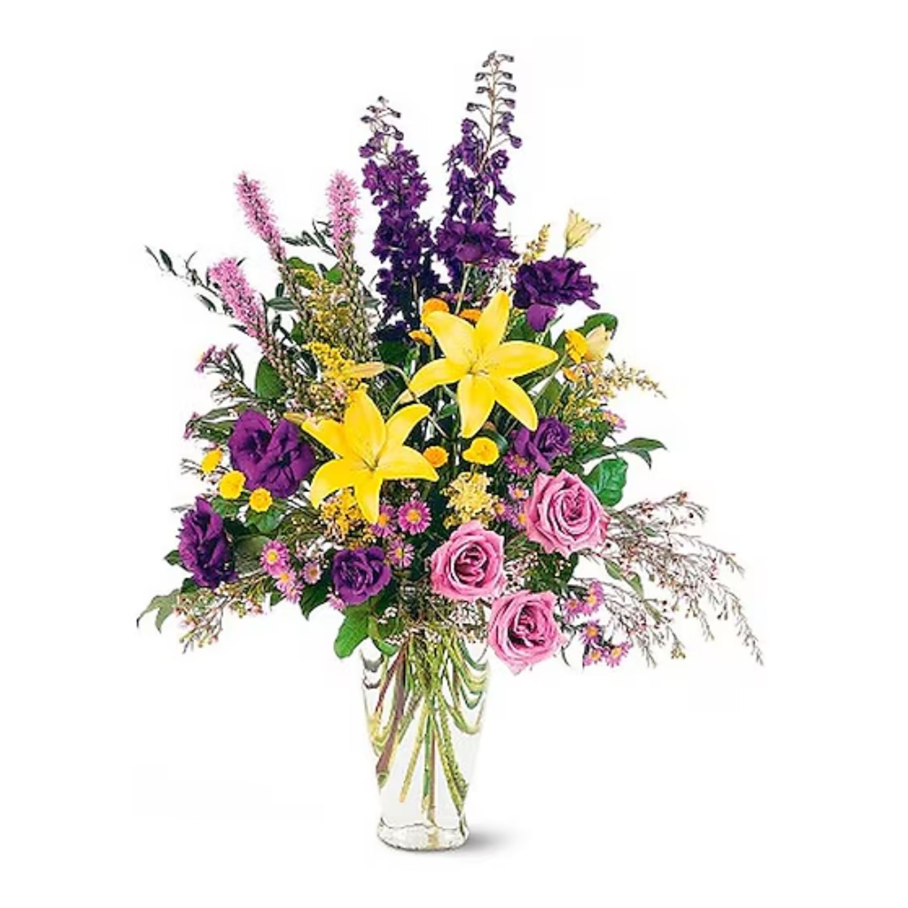 Gorgeous yellow lilies, purple liatris, asters and roses, in a classic clear glass vase. This beautiful arrangement is a reminder that love is everlasting!