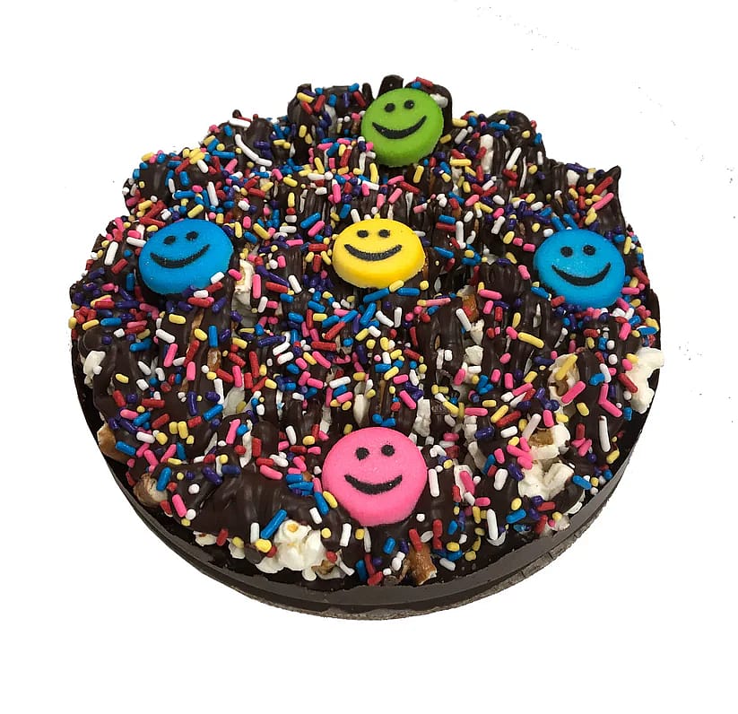 Dairy Free Decorated Smile Pizza. Made with Dairy free Chocolate Popcorn Lace, which doesn't shatter when cut or eaten! Topped with Popcorn, Pretzels, drizzled with White or Dark Dairy free Chocolate. Comes in its own Pizza Box!