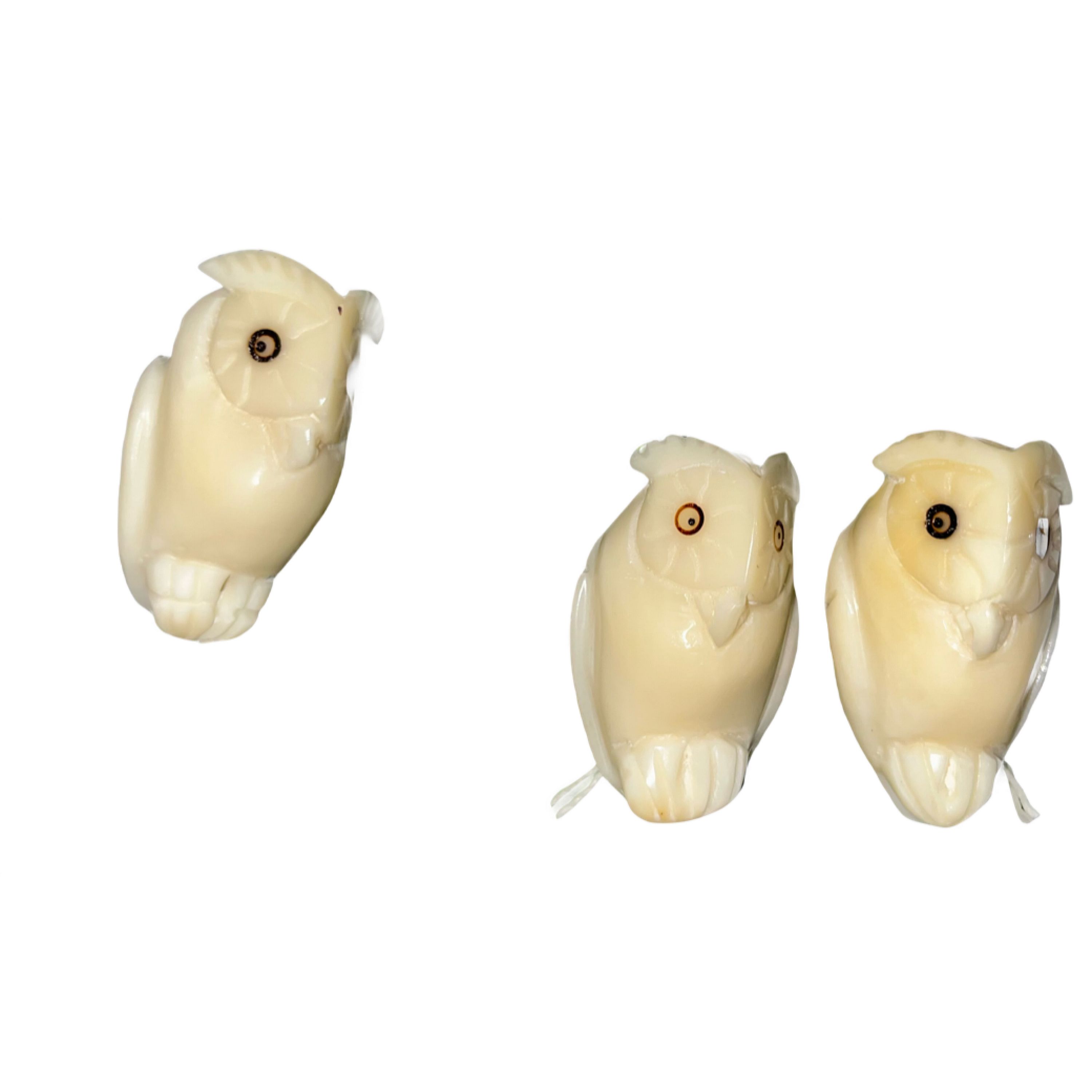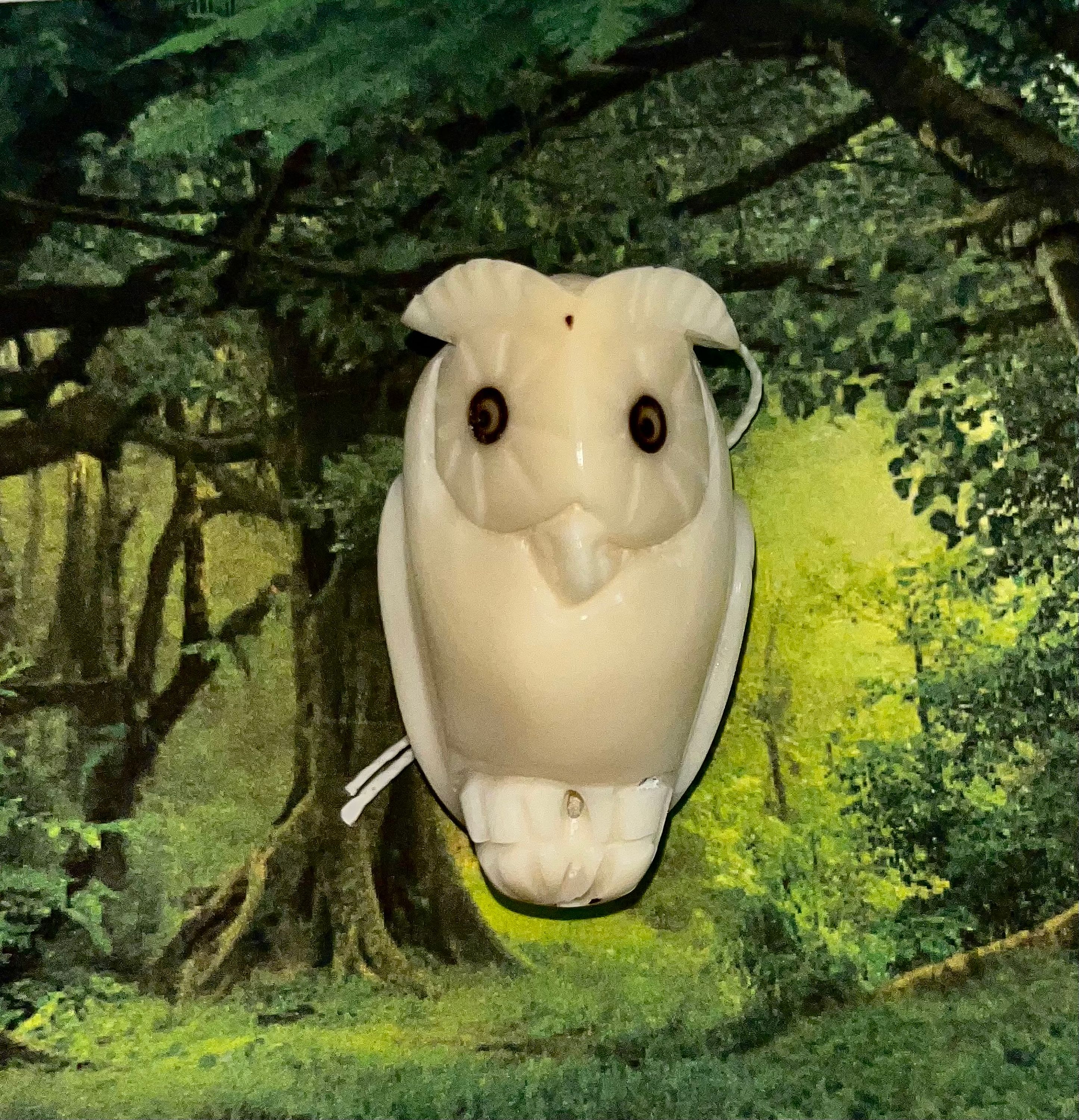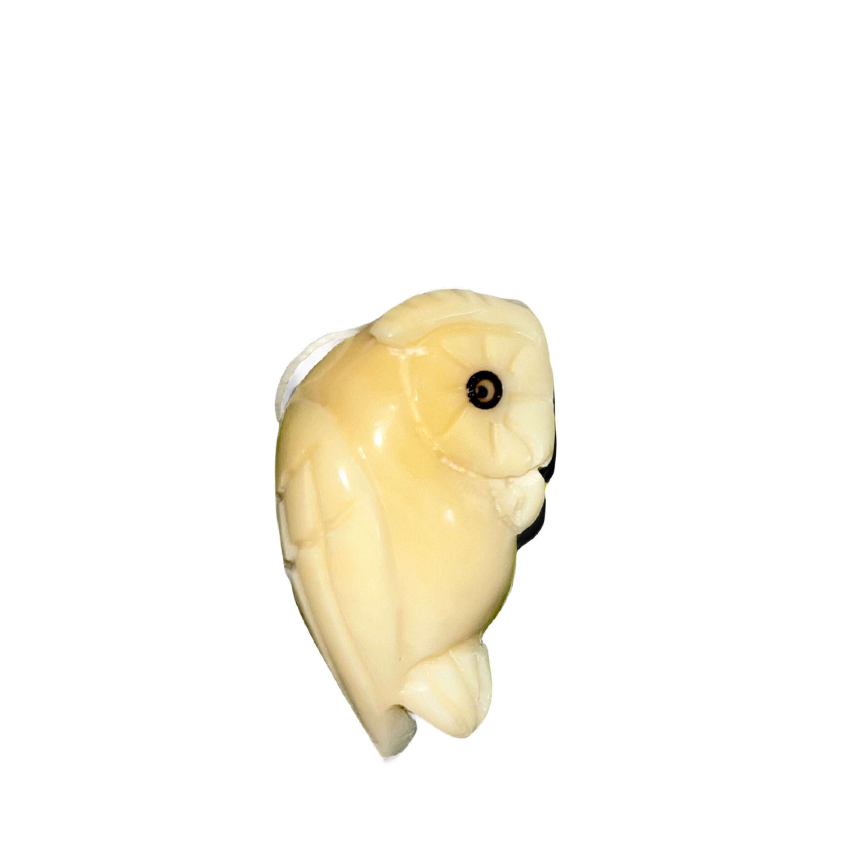 This Owl tagua ornament has been hand carved in Ecuador from tagua nuts, a renewable rain forest seed known as vegetable ivory for its likeness to real animal ivory, but with animal and habitat-friendly properties. All colors are achieved using natural techniques, such as boiling, fermentation, burning and inlay, that enhance but don't completely cover the nut's organic beauty. Similar to animal ivory, this figurine will gently antique or darken over time.