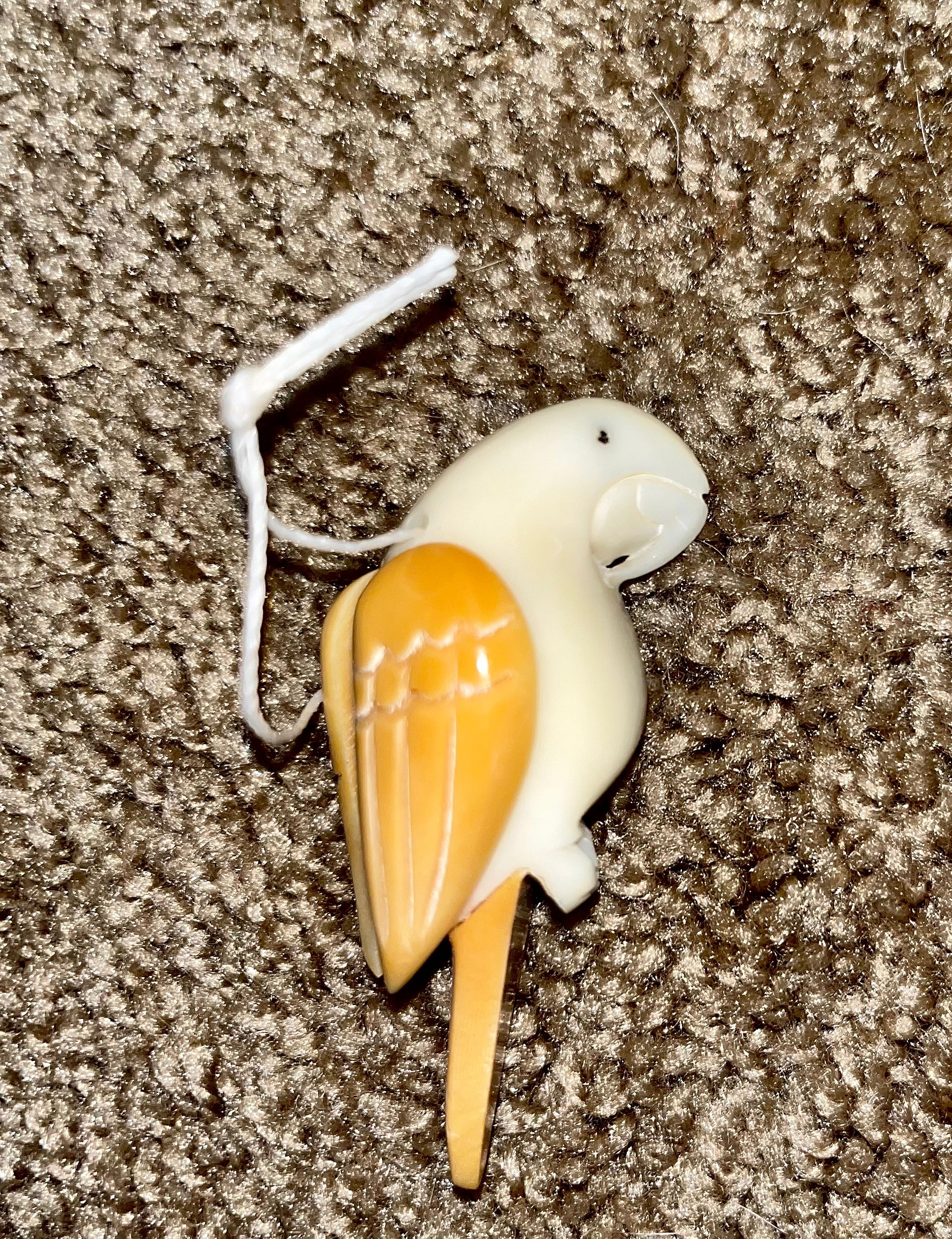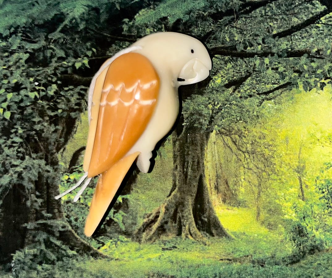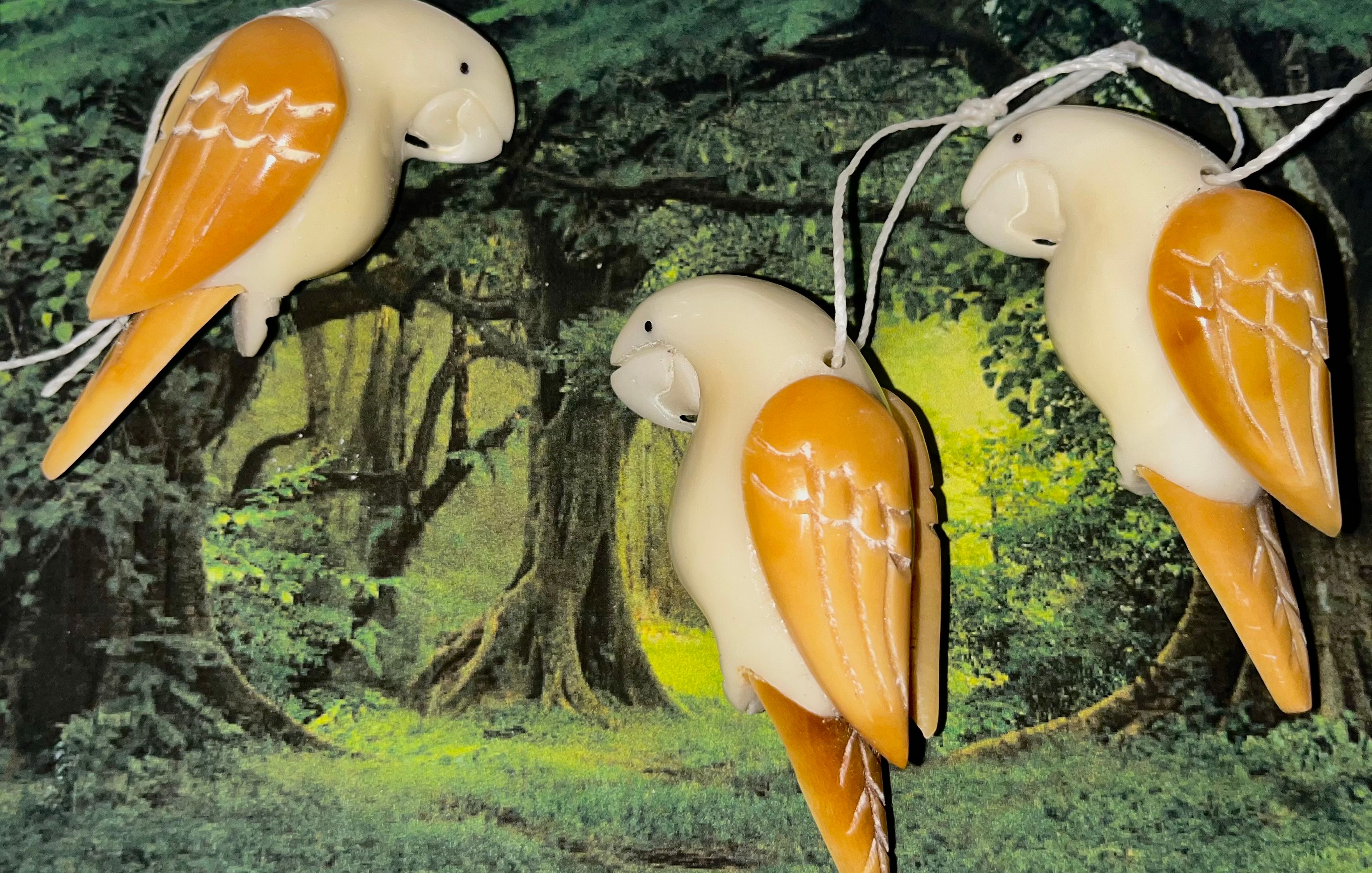 This Cockatoo Macaw tagua ornament has been hand carved in Ecuador from tagua nuts, a renewable rain forest seed known as vegetable ivory for its likeness to real animal ivory, but with animal and habitat-friendly properties. All colors are achieved using natural techniques, such as boiling, fermentation, burning and inlay, that enhance but don't completely cover the nut's organic beauty. Similar to animal ivory, this figurine will gently antique or darken over time.