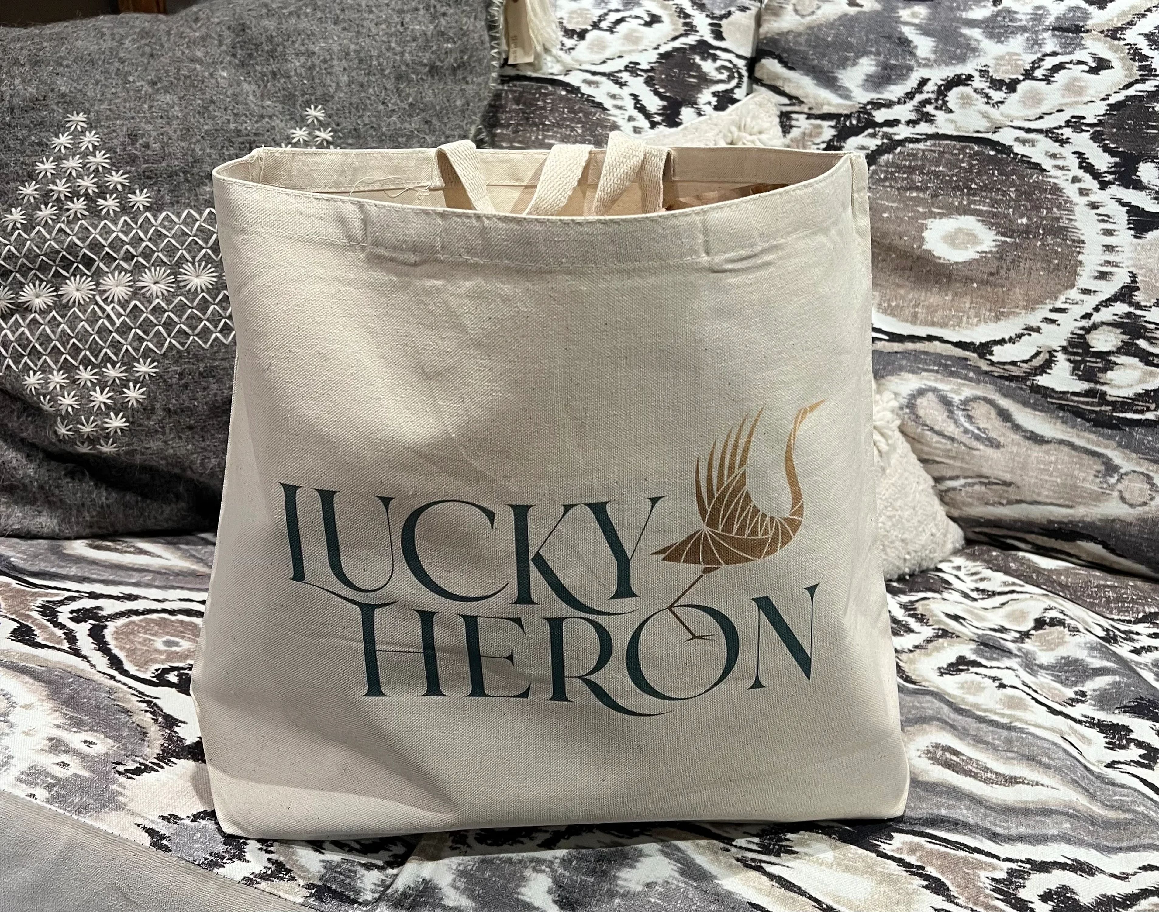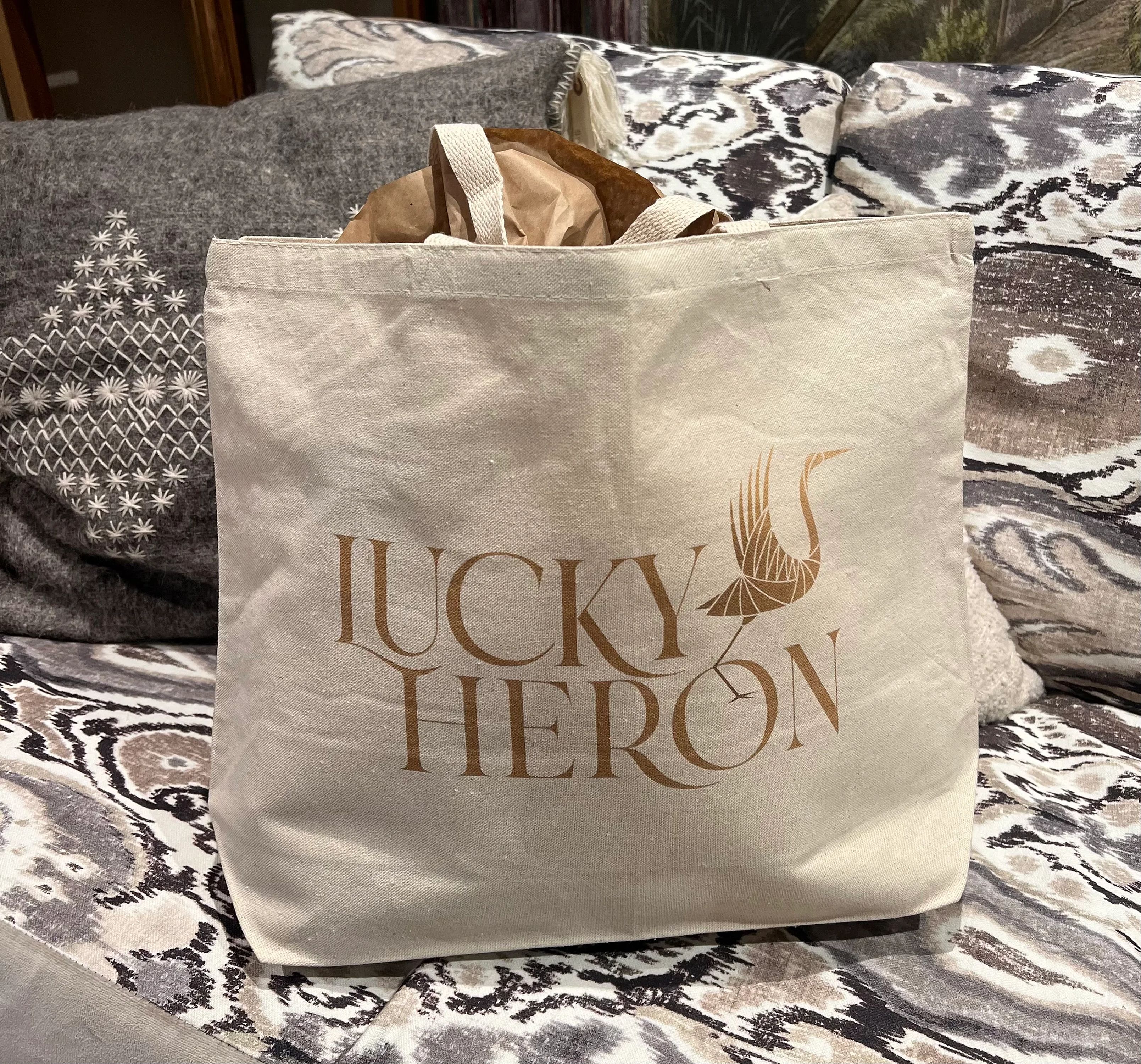 Lucky Heron Canvas Tote bag: available with all gold lettering and gold heron, or teal lettering and gold heron.