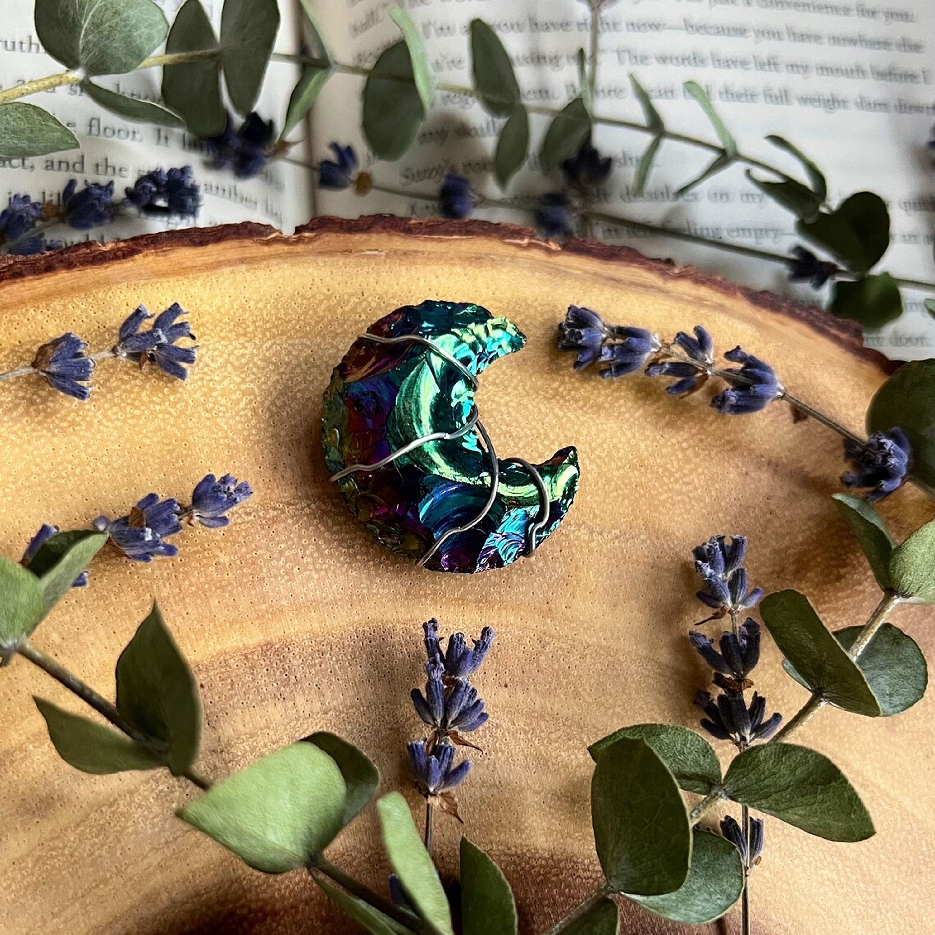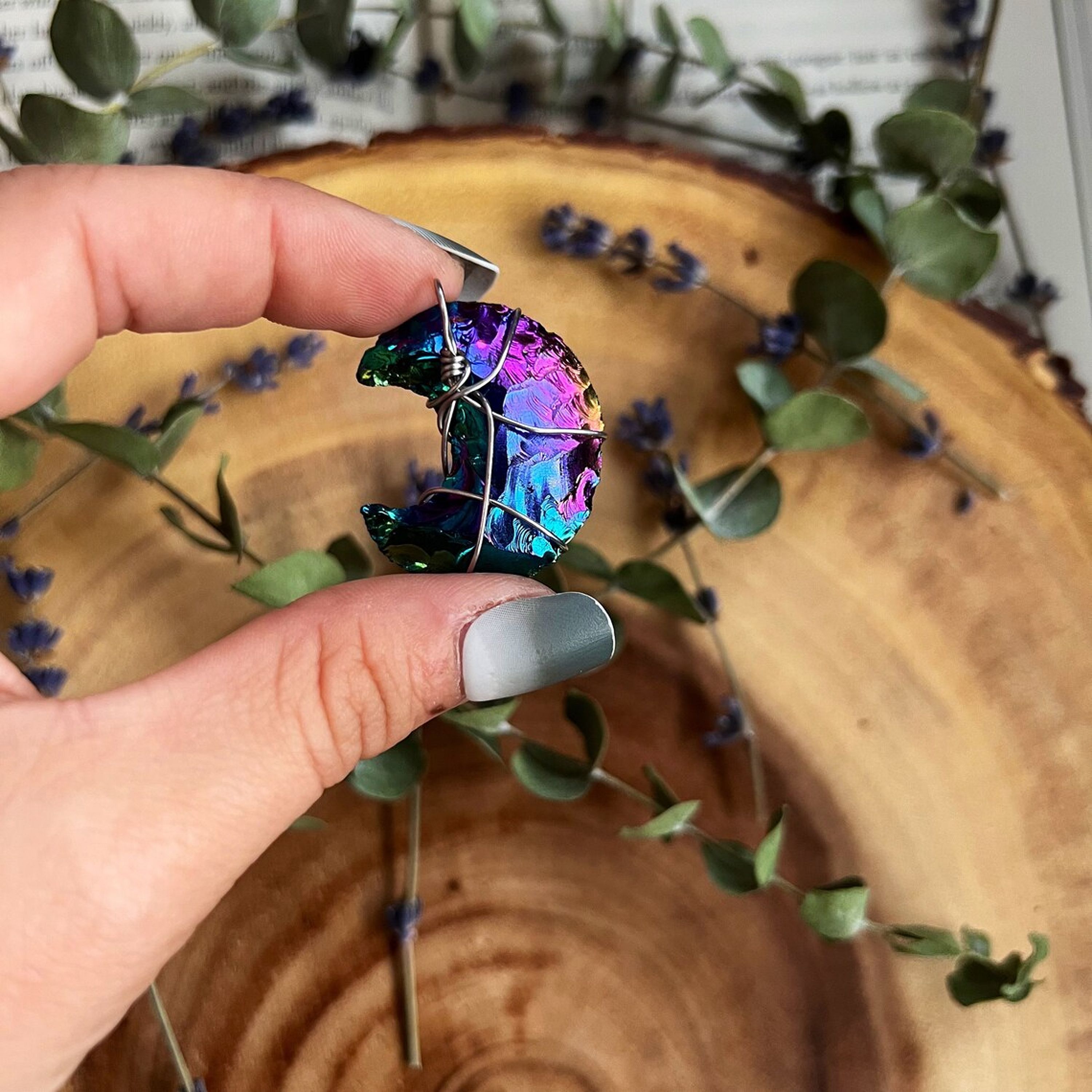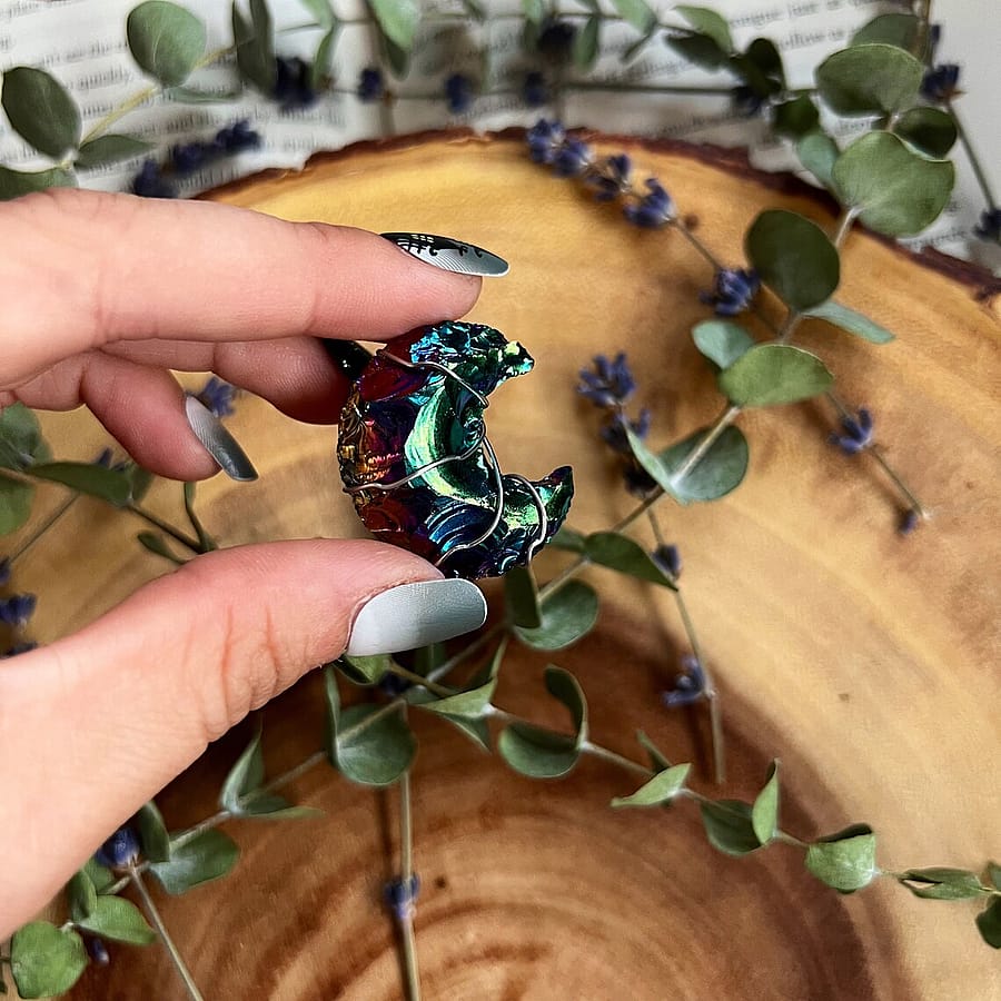 This handmade necklace is made with silver plated wire, holding an iridescent rainbow titanium obsidian moon crescent.