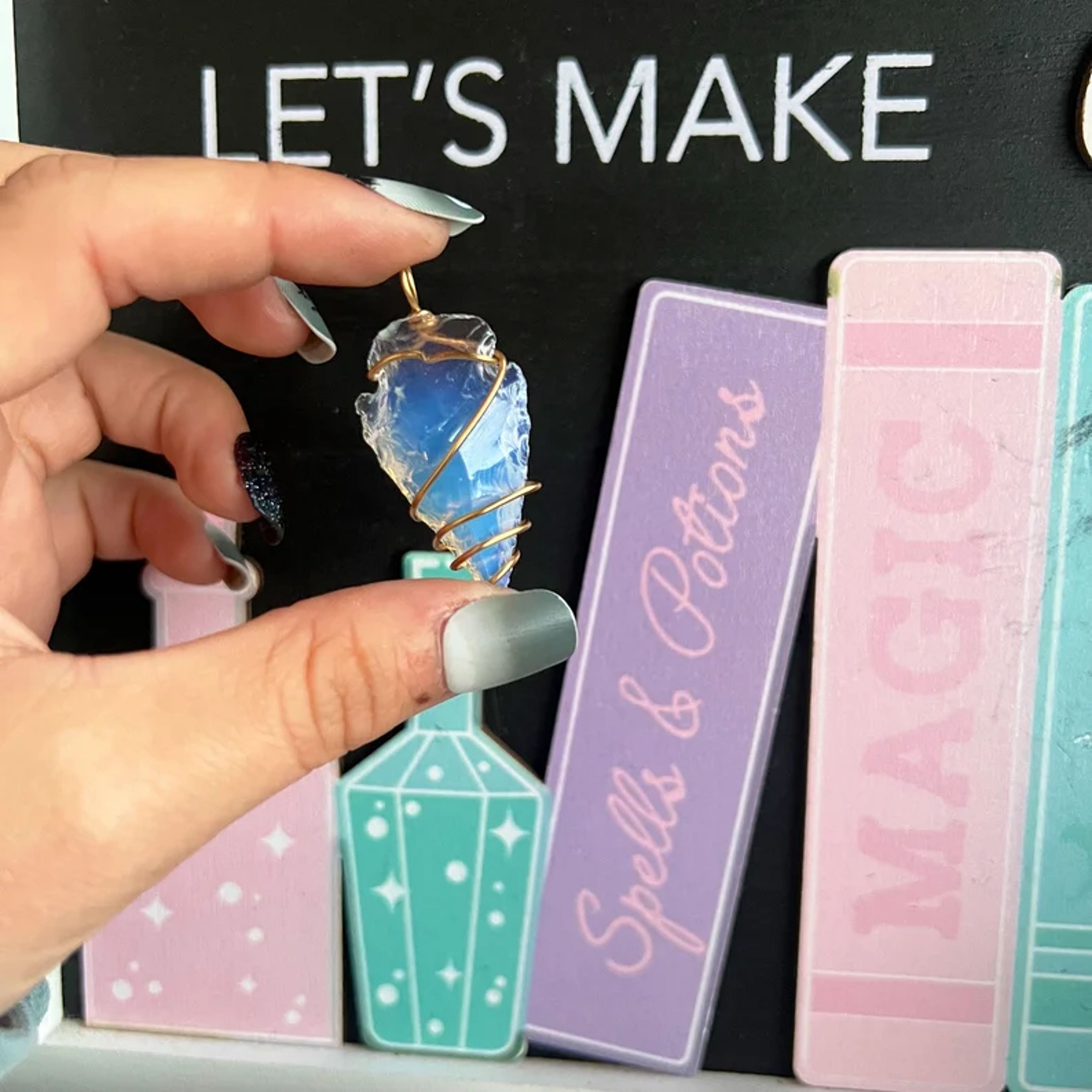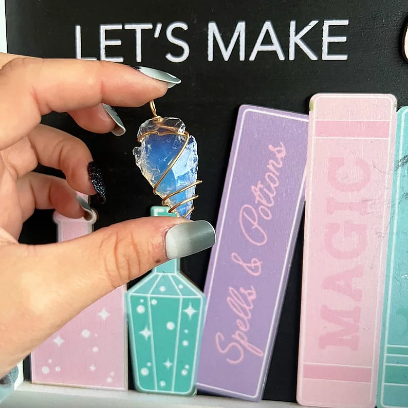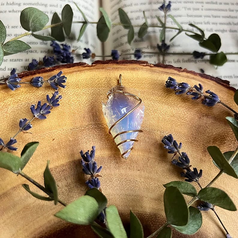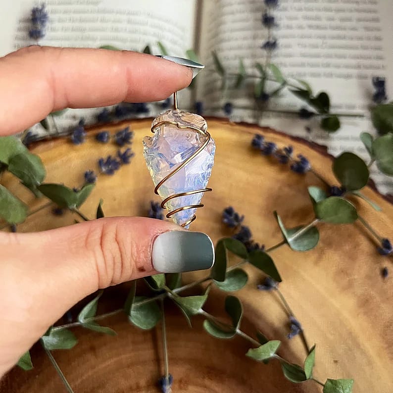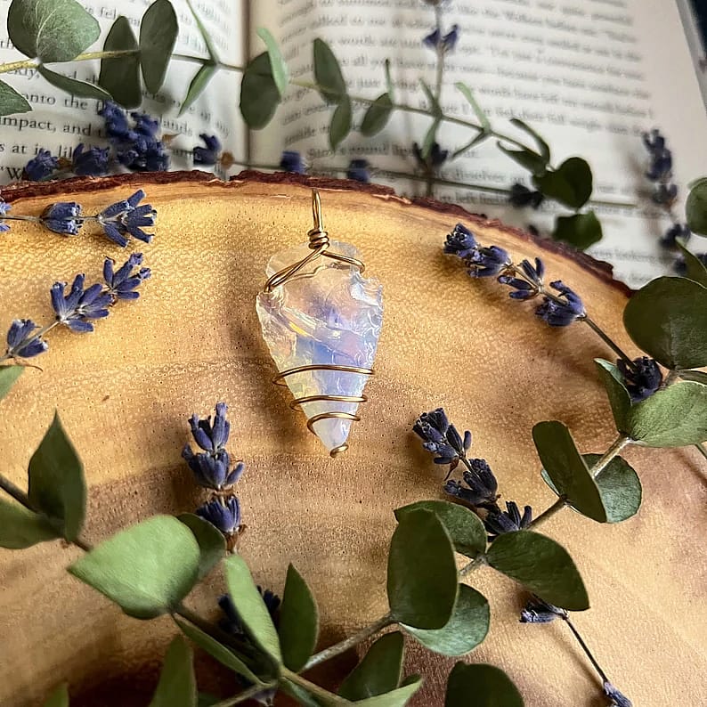 This handmade necklace is made with gold plated wire, holding an opalite glass arrowhead.