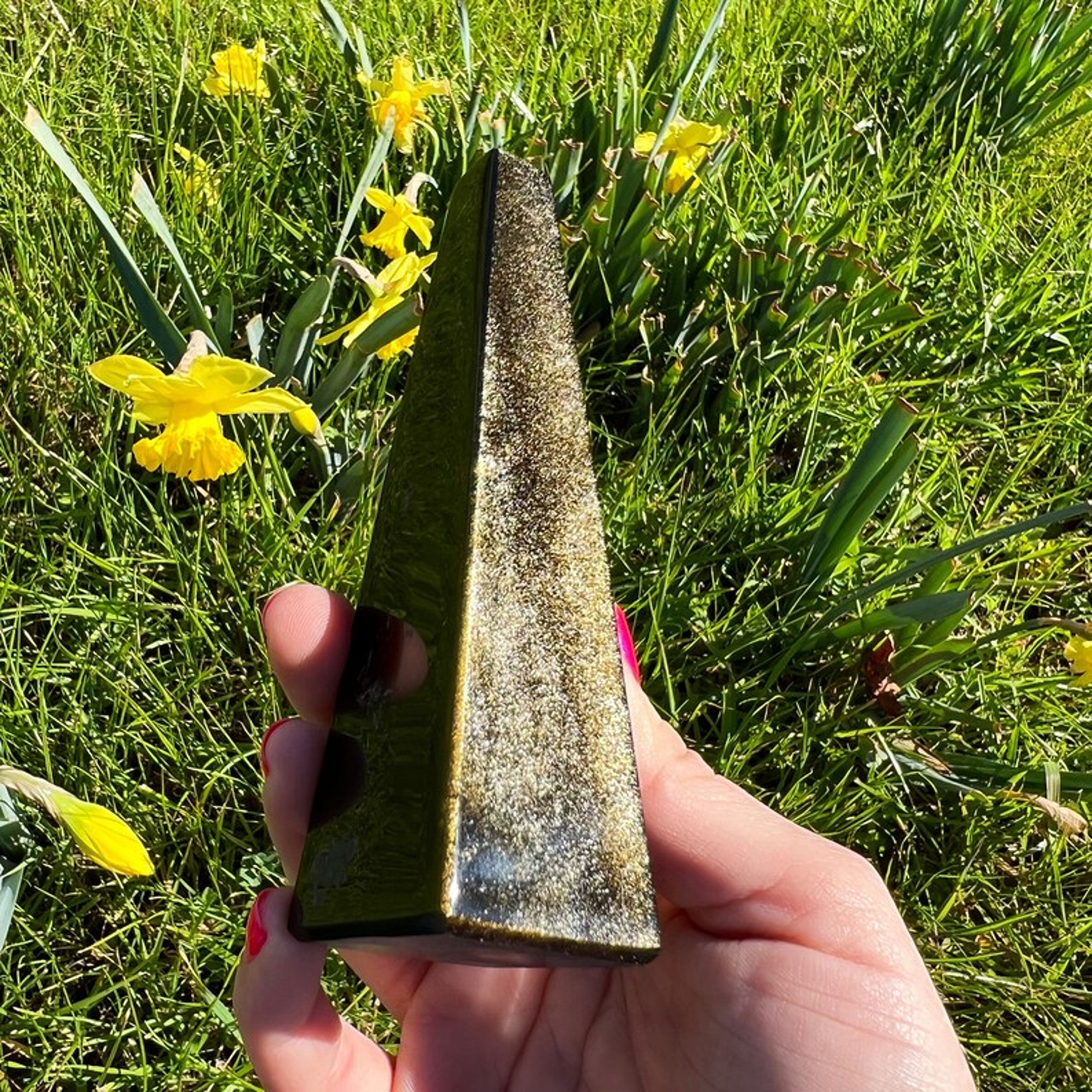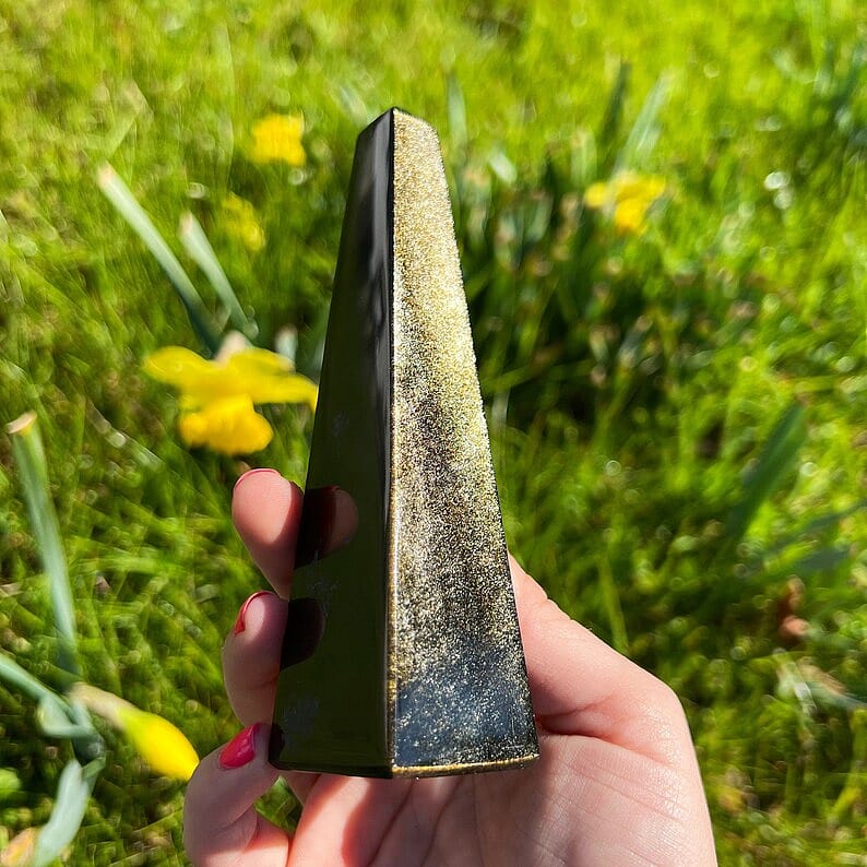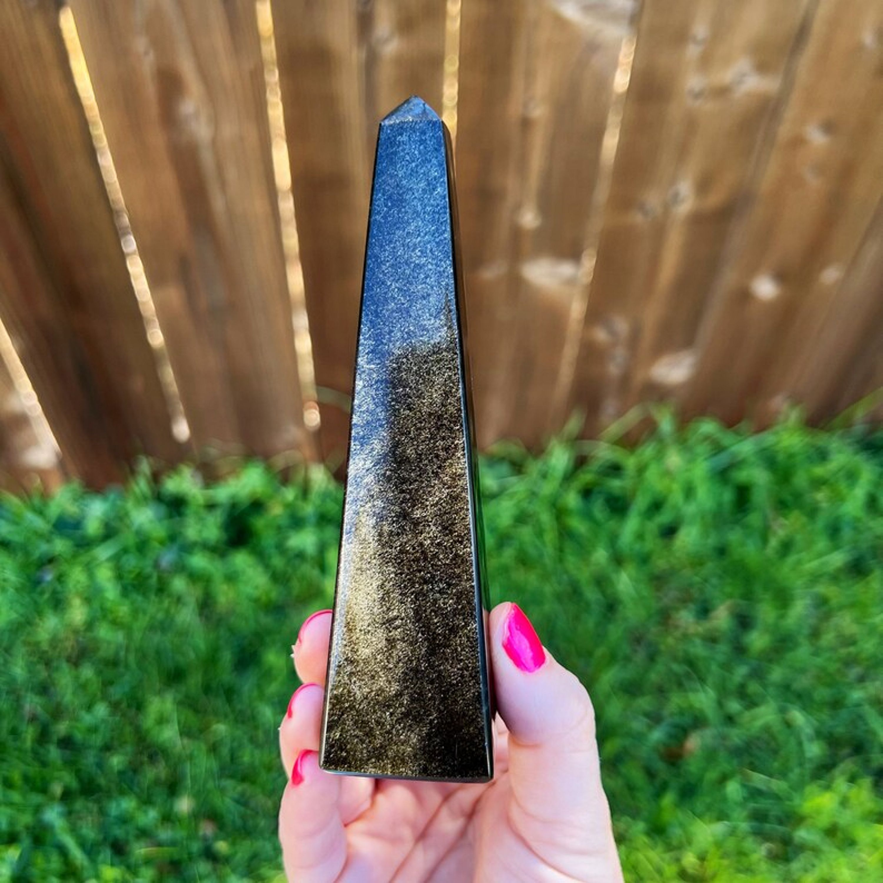 You will receive the same Golden Sheen Black Obsidian Tower photographed here Size: 5.25" x 1.5" x 1.5" Weight: .4 lb.