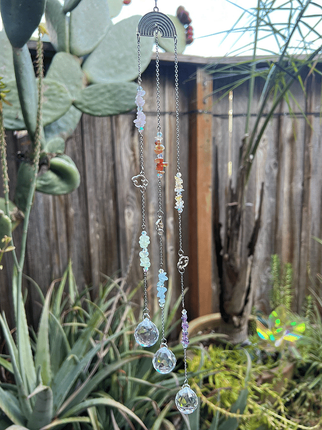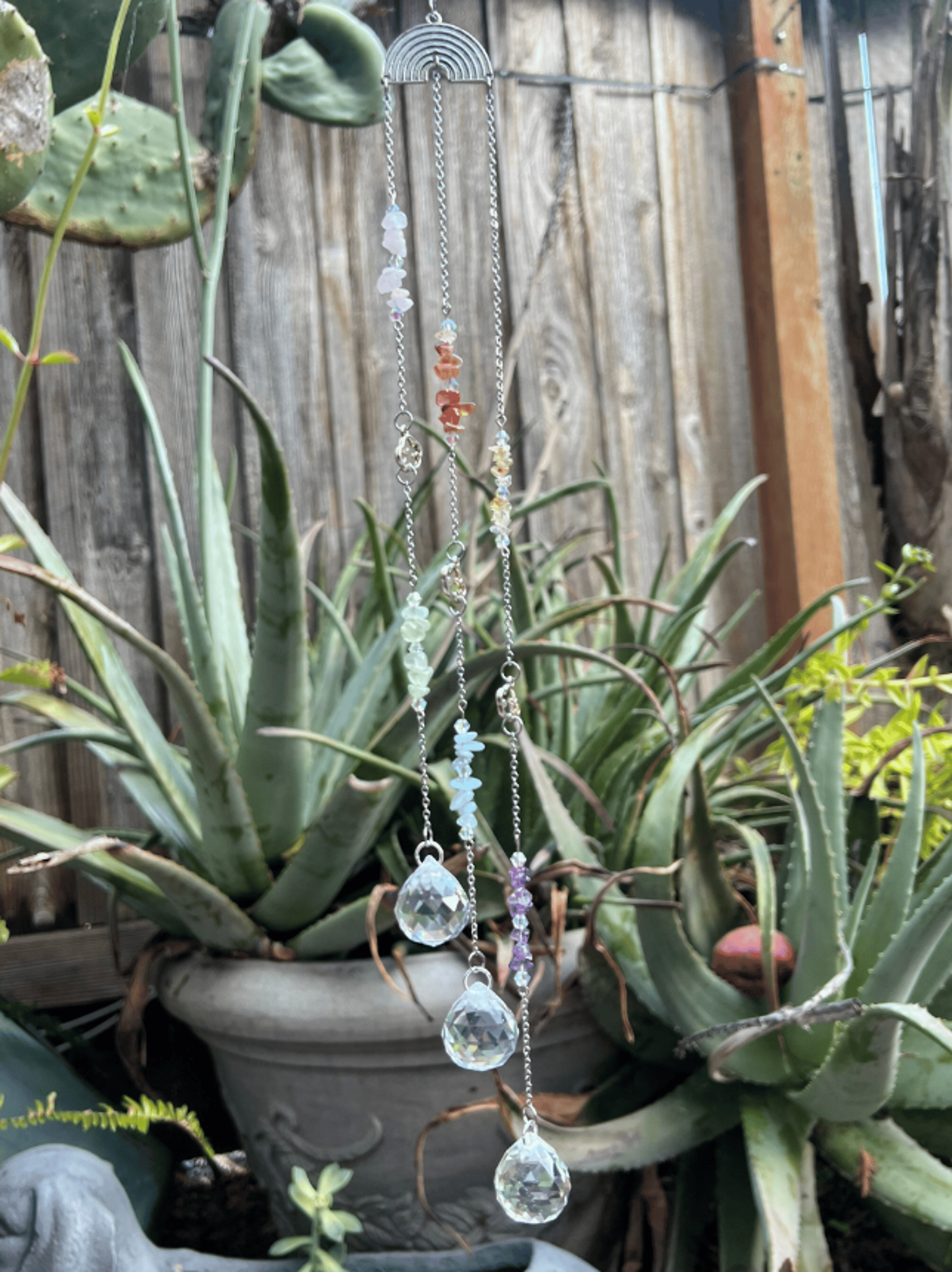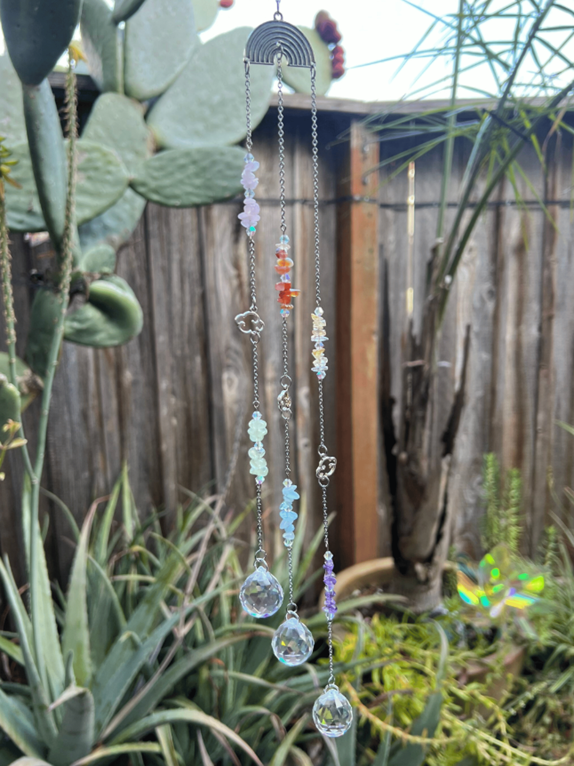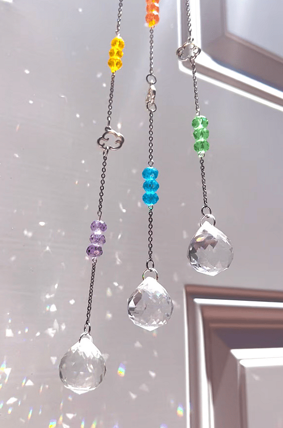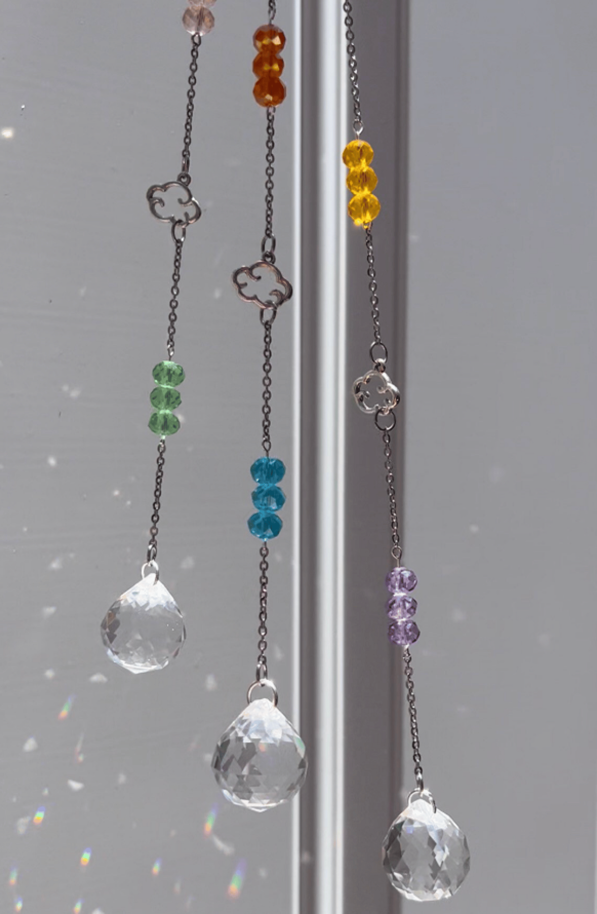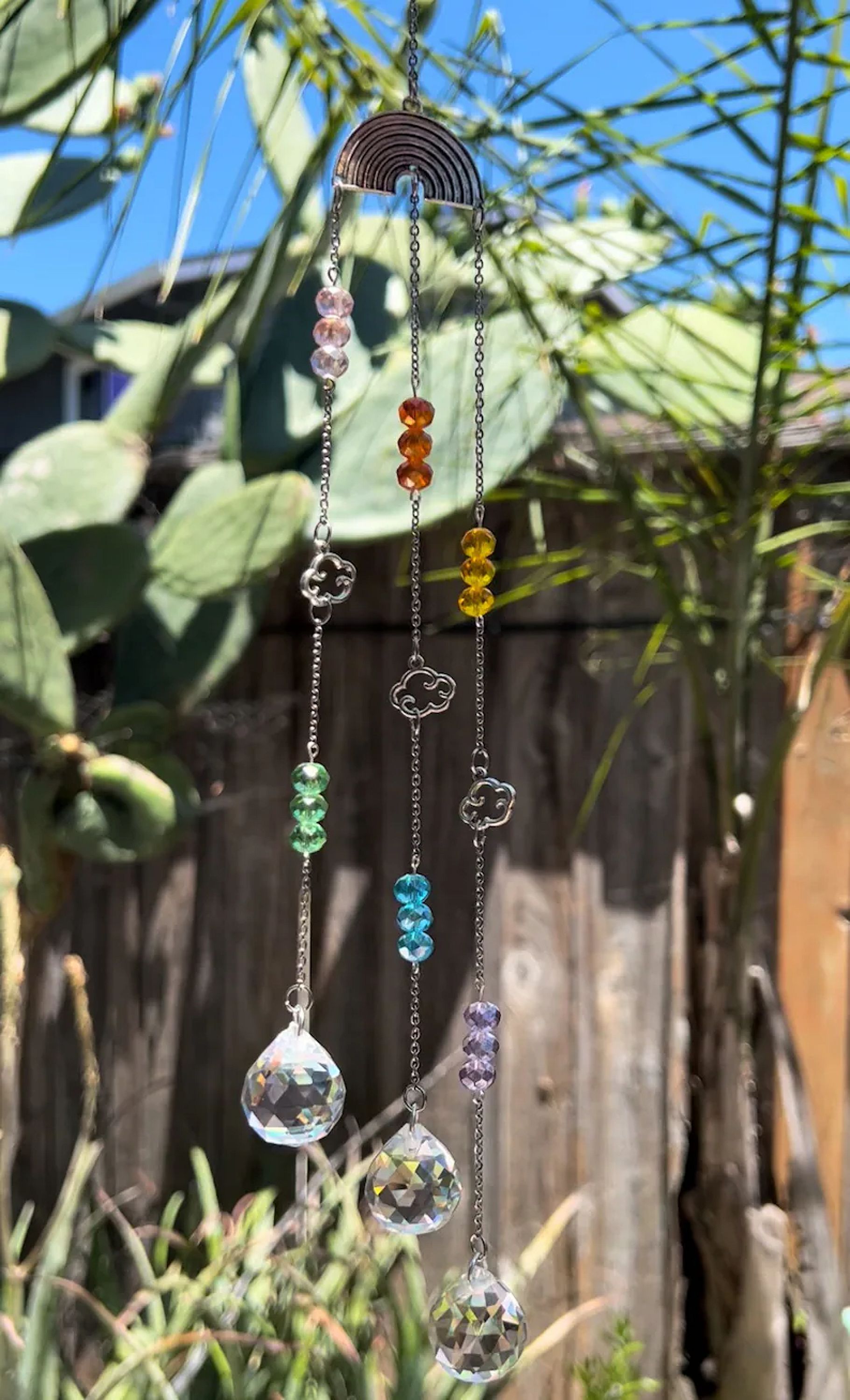 This handmade rainbow sun catcher is made with colored glass beads or crystal chip beads, a sturdy silver chain, cloud charms, and 3 20mm clear glass prisms.