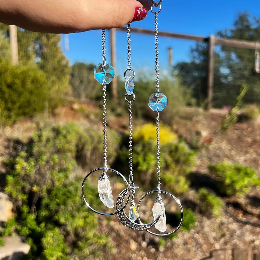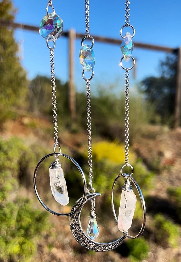 This handmade car charm is made with a rainbow aura coated glass bead and a dainty yet sturdy silver chain. Comes with a hook for easy hanging